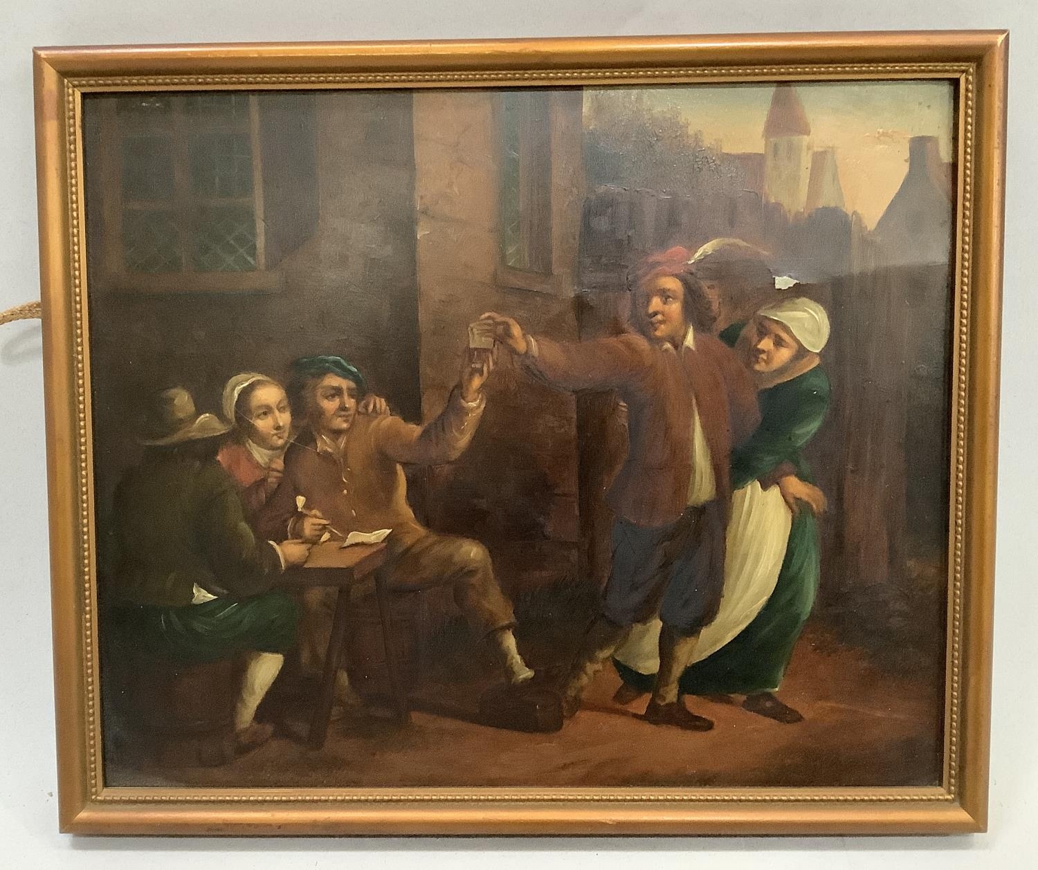19th century continental school, revellers outside a tavern, oil on board, unsigned, 16cm x 19.5cm (a small patch of flaking above female's head to far right)