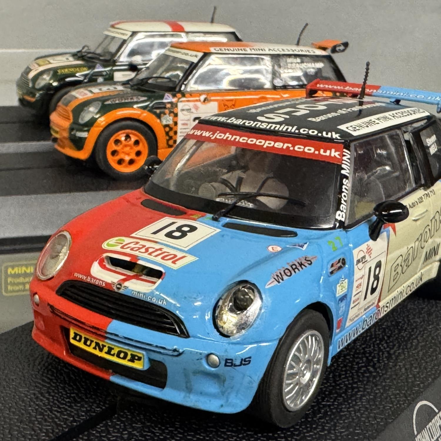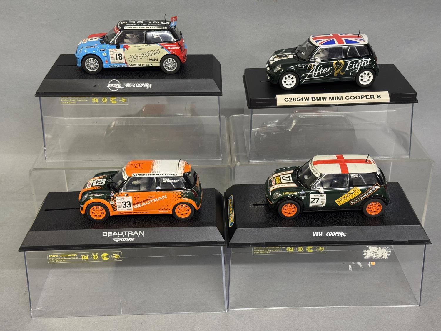 Four Scalextric BMW Mini Cooper S model cars, including After Eight No8, Kingdom Estates No27, Barons No18 and Beautran No33.., all boxed