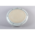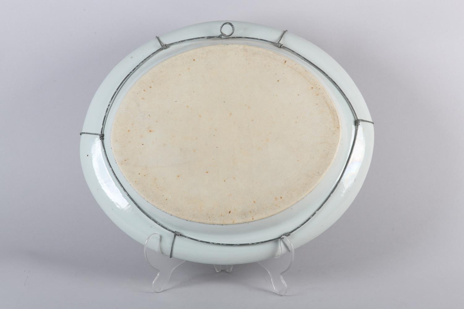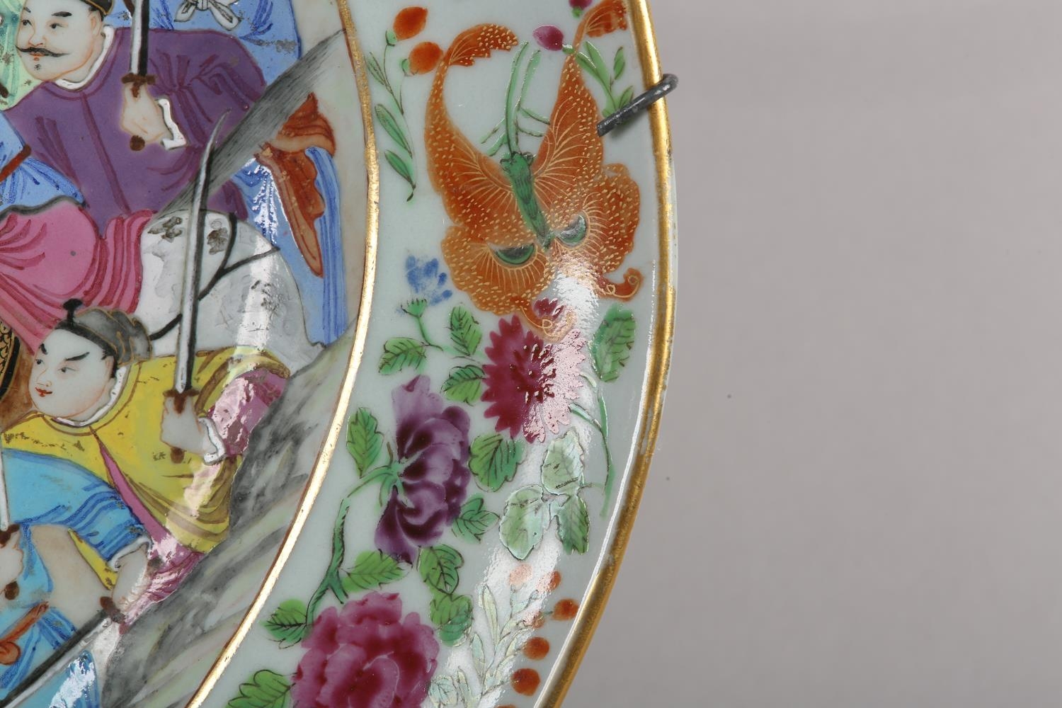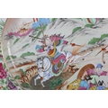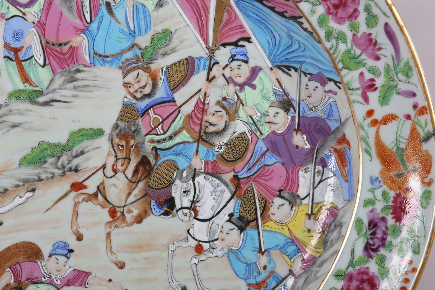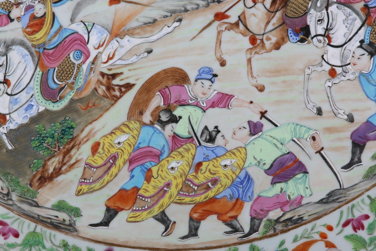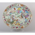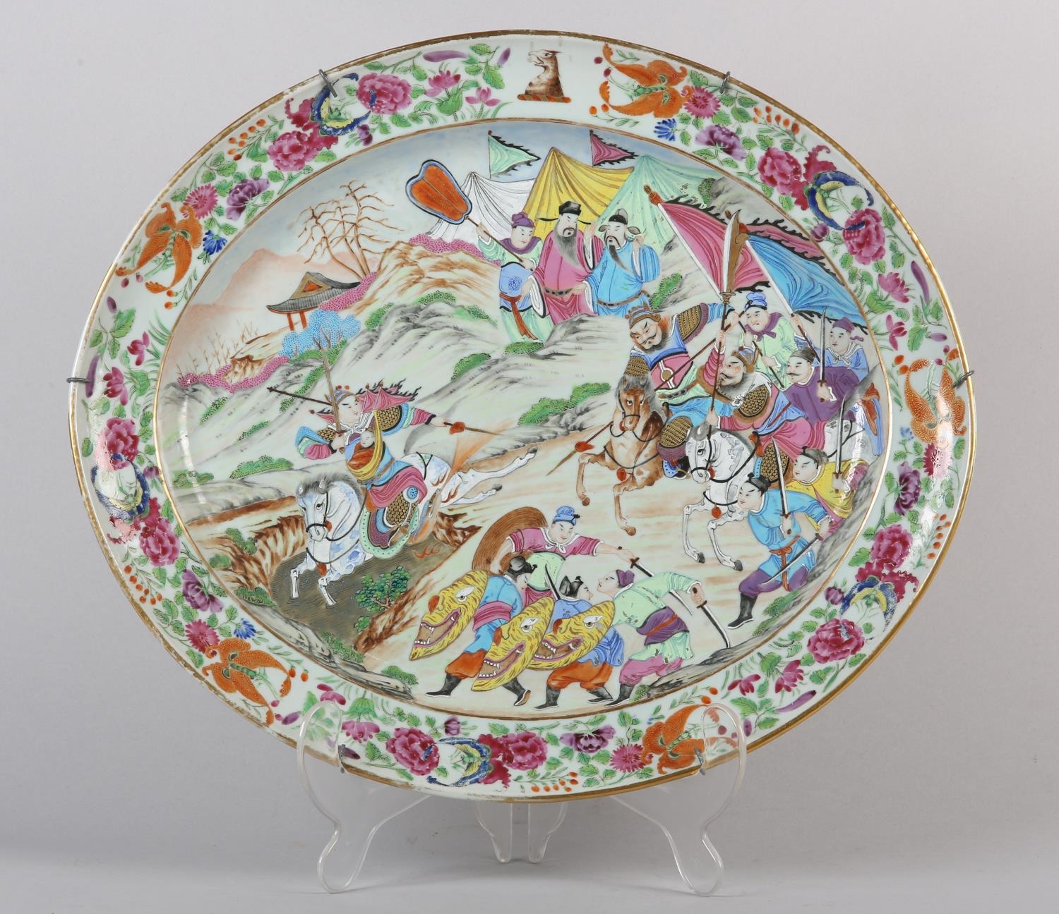 A CHINESE CANTON FAMILLE ROSE CHARGER of oval outline, enamelled with a battle scene, warriors on horse back and foot soldiers with grotesque mask shields, an encampment on the hillside, within a peony and butterfly border centred with an armorial crest, early to mid 19th century, 47.5cm x 40.5cm