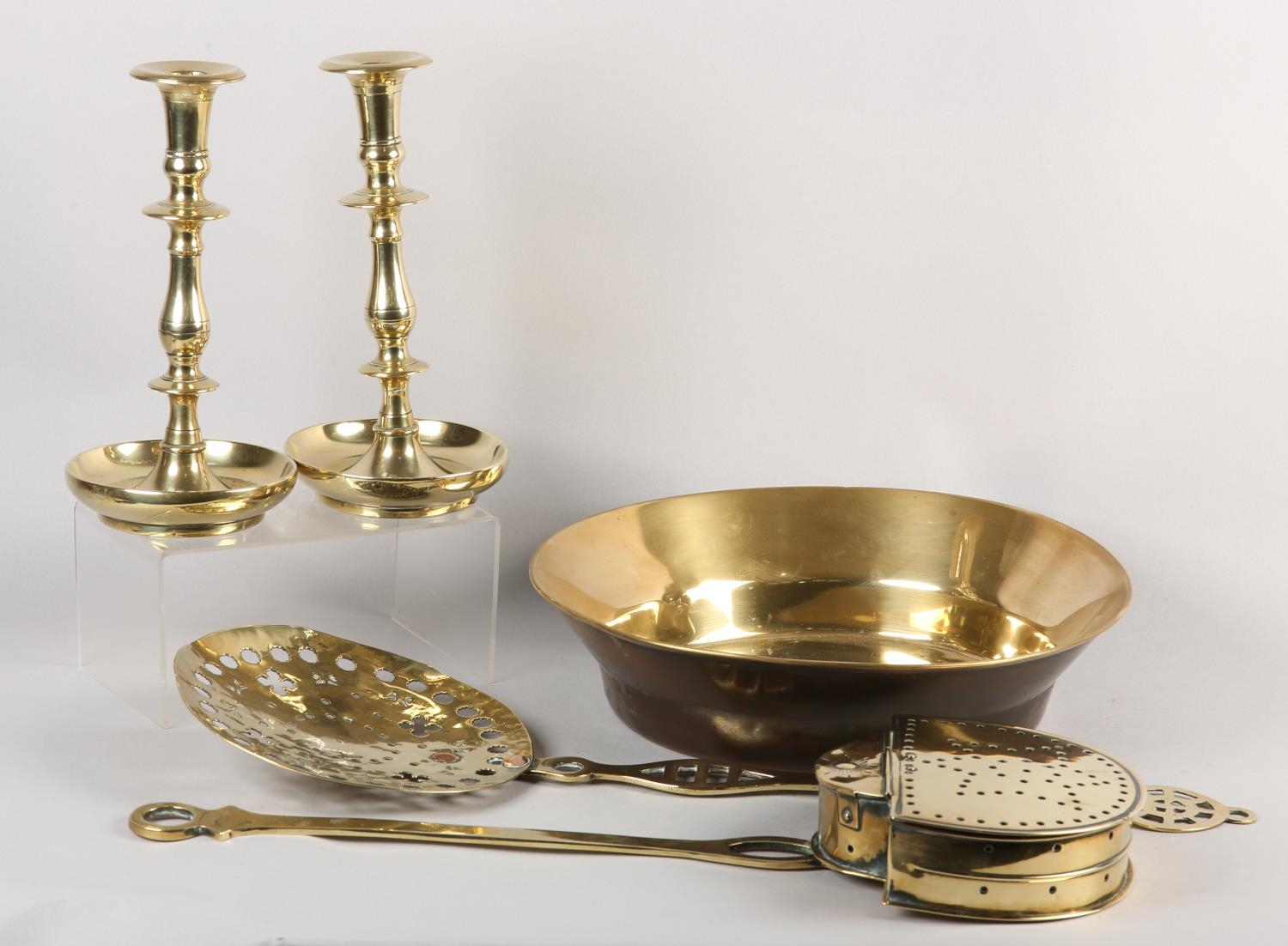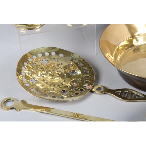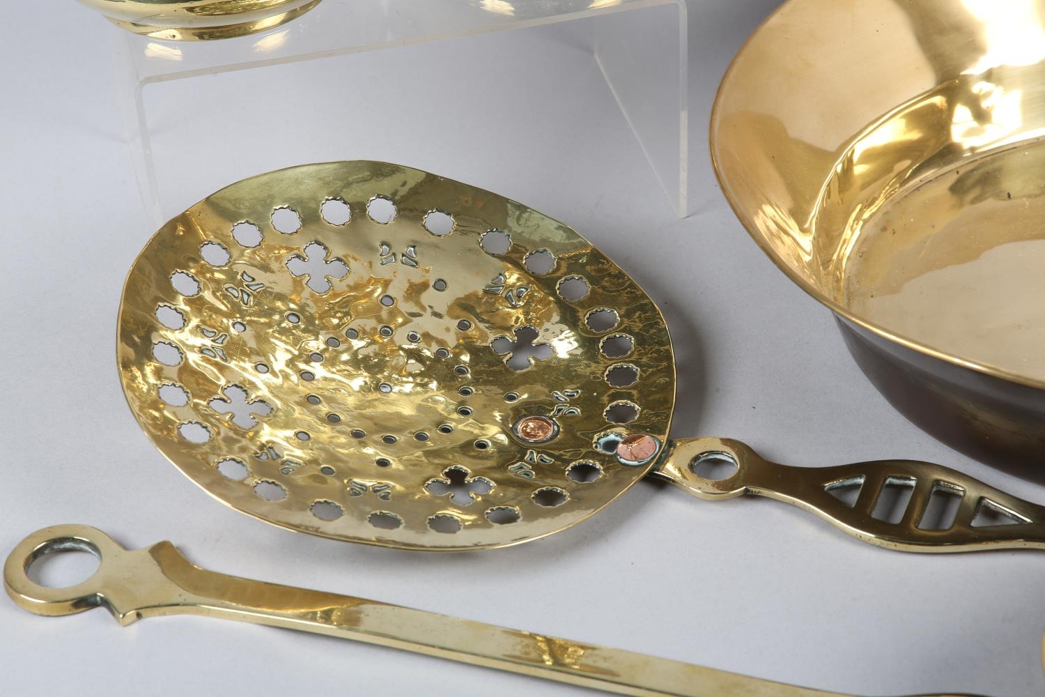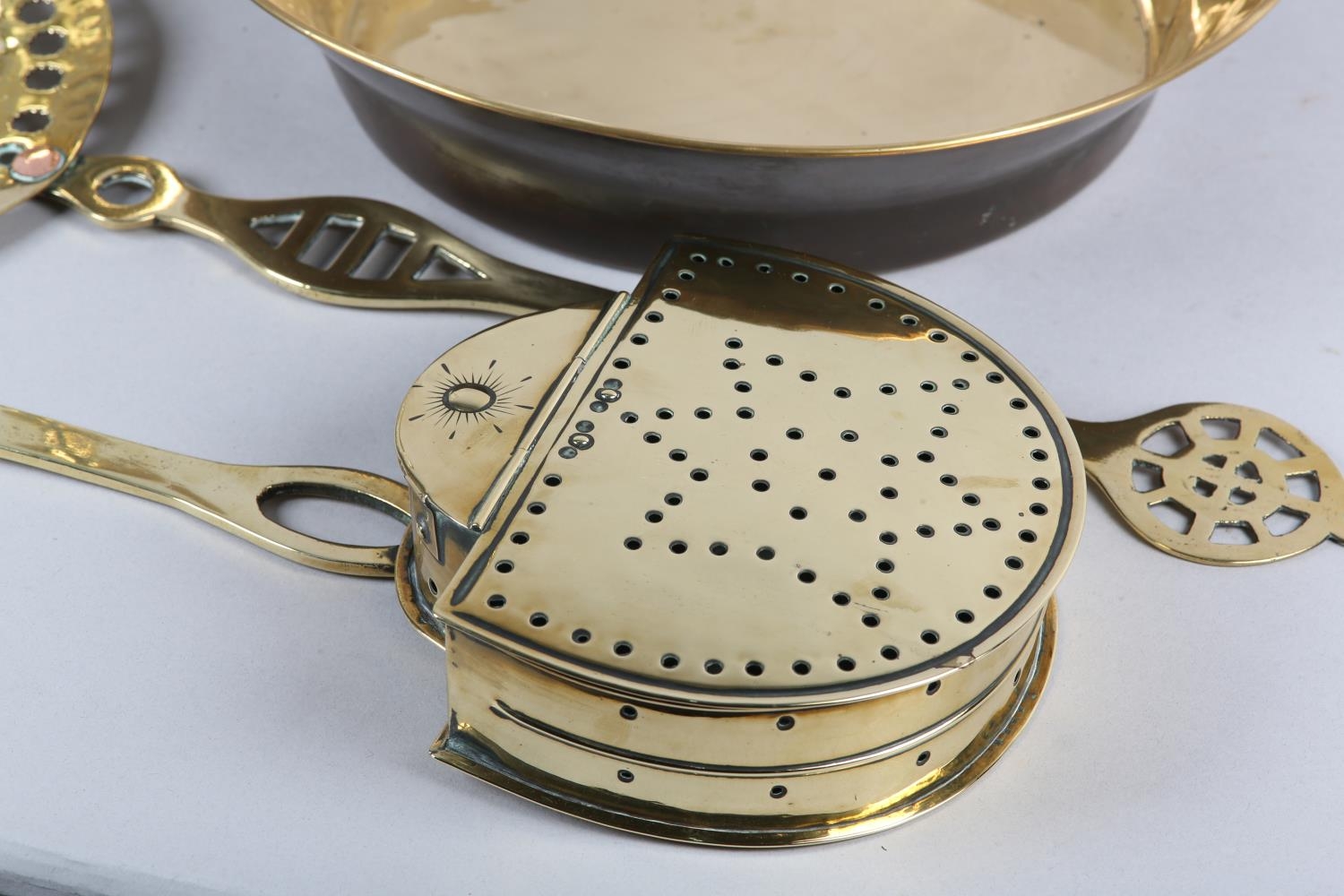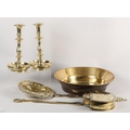 A LARGE 19TH CENTURY BRASS BOWL, 34cm diameter x 8cm high, a pair of brass candlesticks, the knopped baluster column on a heavy dished base 26cm high, a box chestnut roaster and a pierced dish roaster both with slotted handles, 51.5cm and 58.5cm long (5)