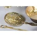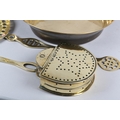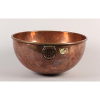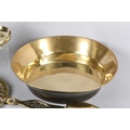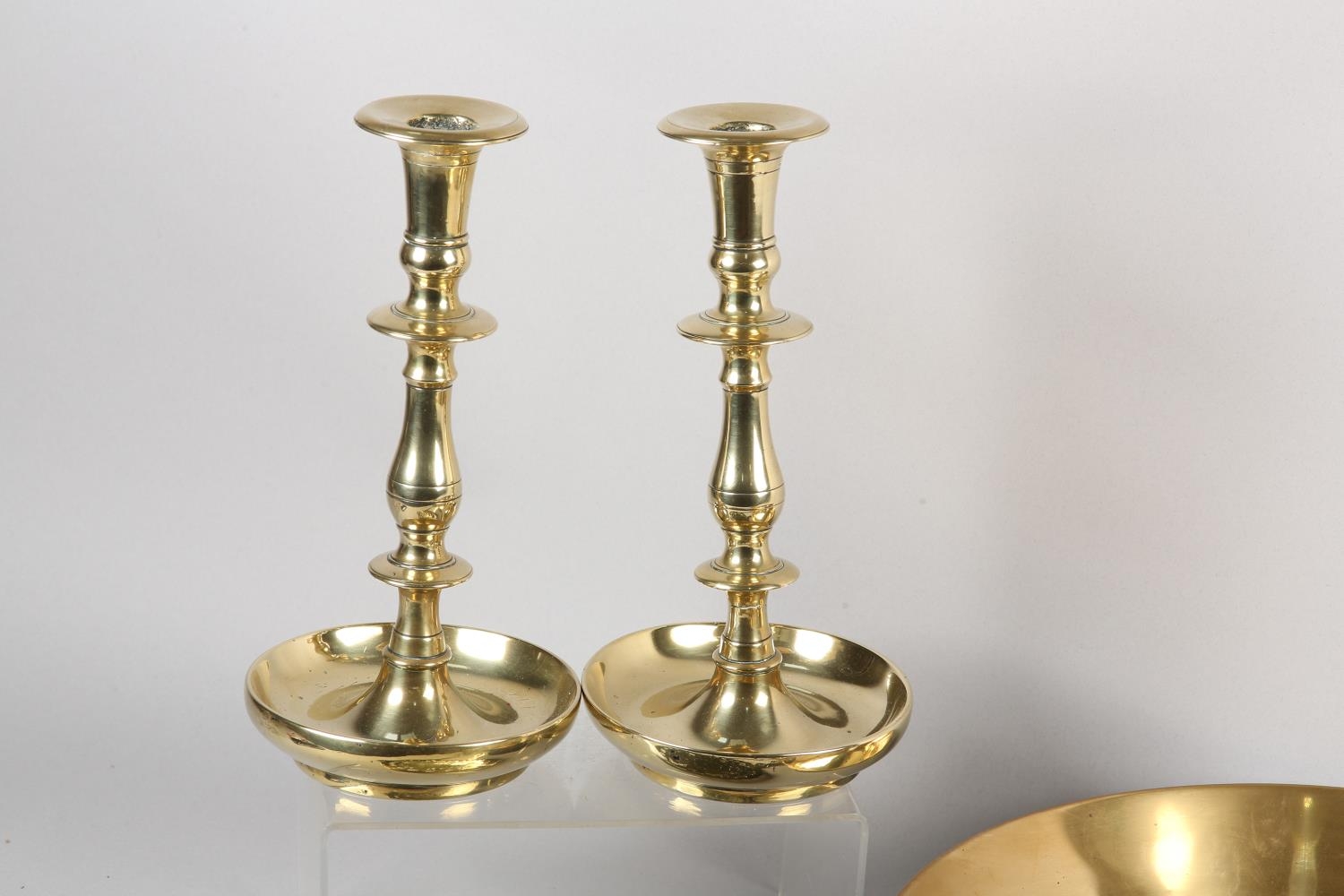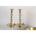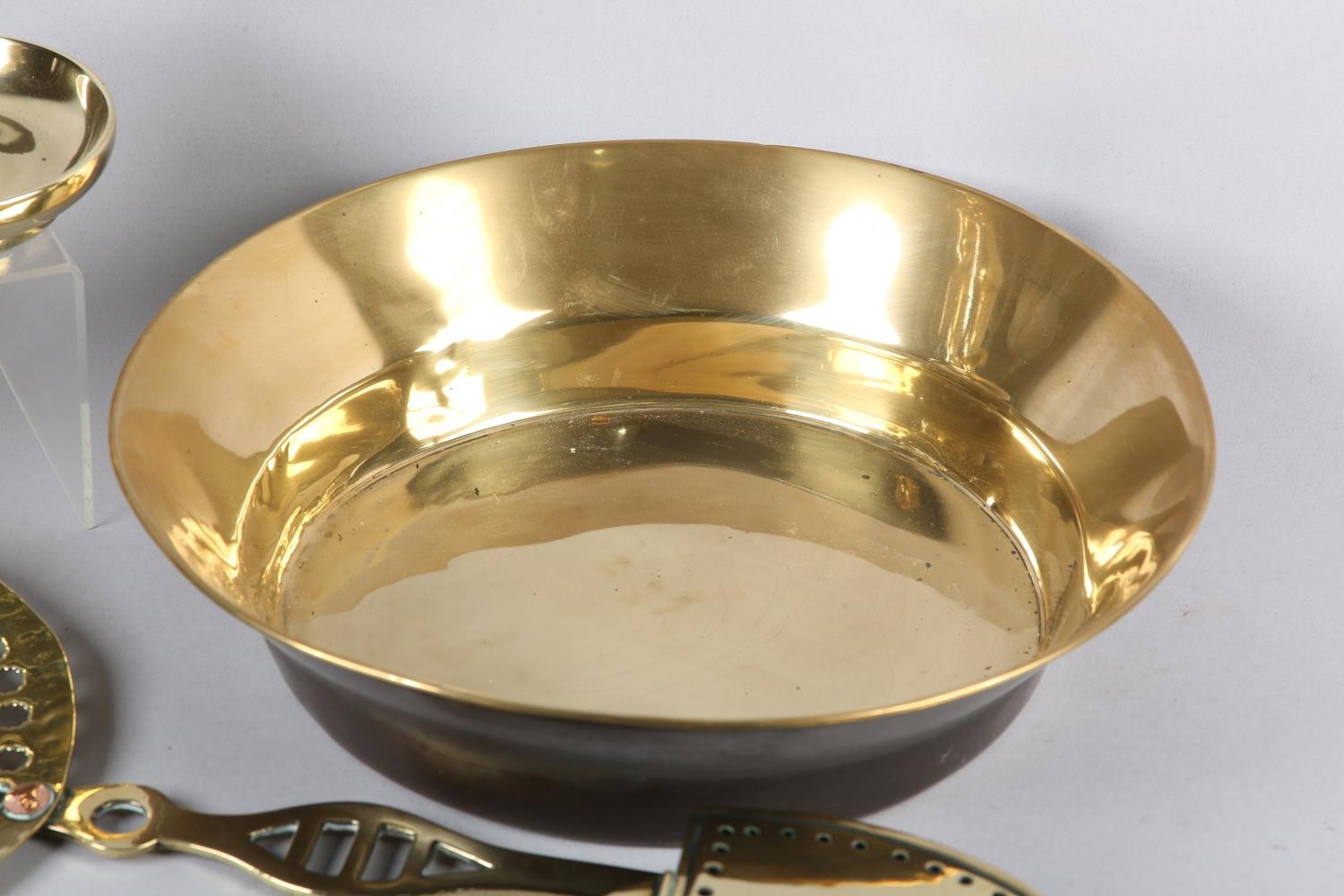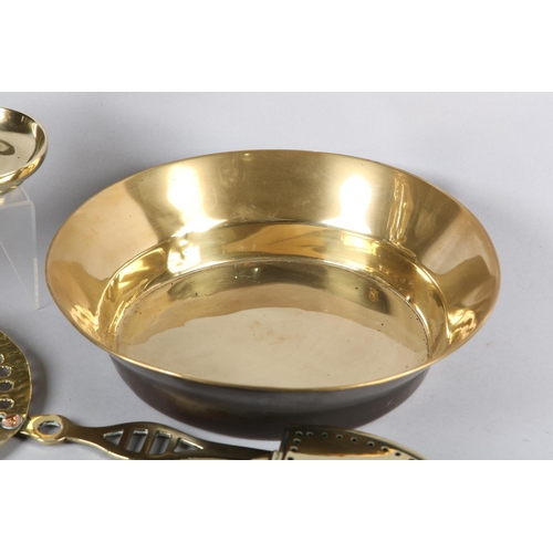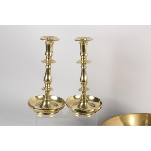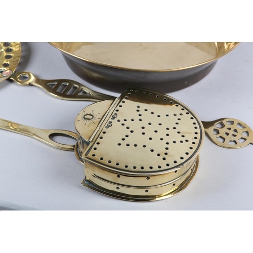 A LARGE 19TH CENTURY BRASS BOWL, 34cm diameter x 8cm high, a pair of brass candlesticks, the knopped baluster column on a heavy dished base 26cm high, a box chestnut roaster and a pierced dish roaster both with slotted handles, 51.5cm and 58.5cm long (5)