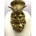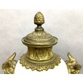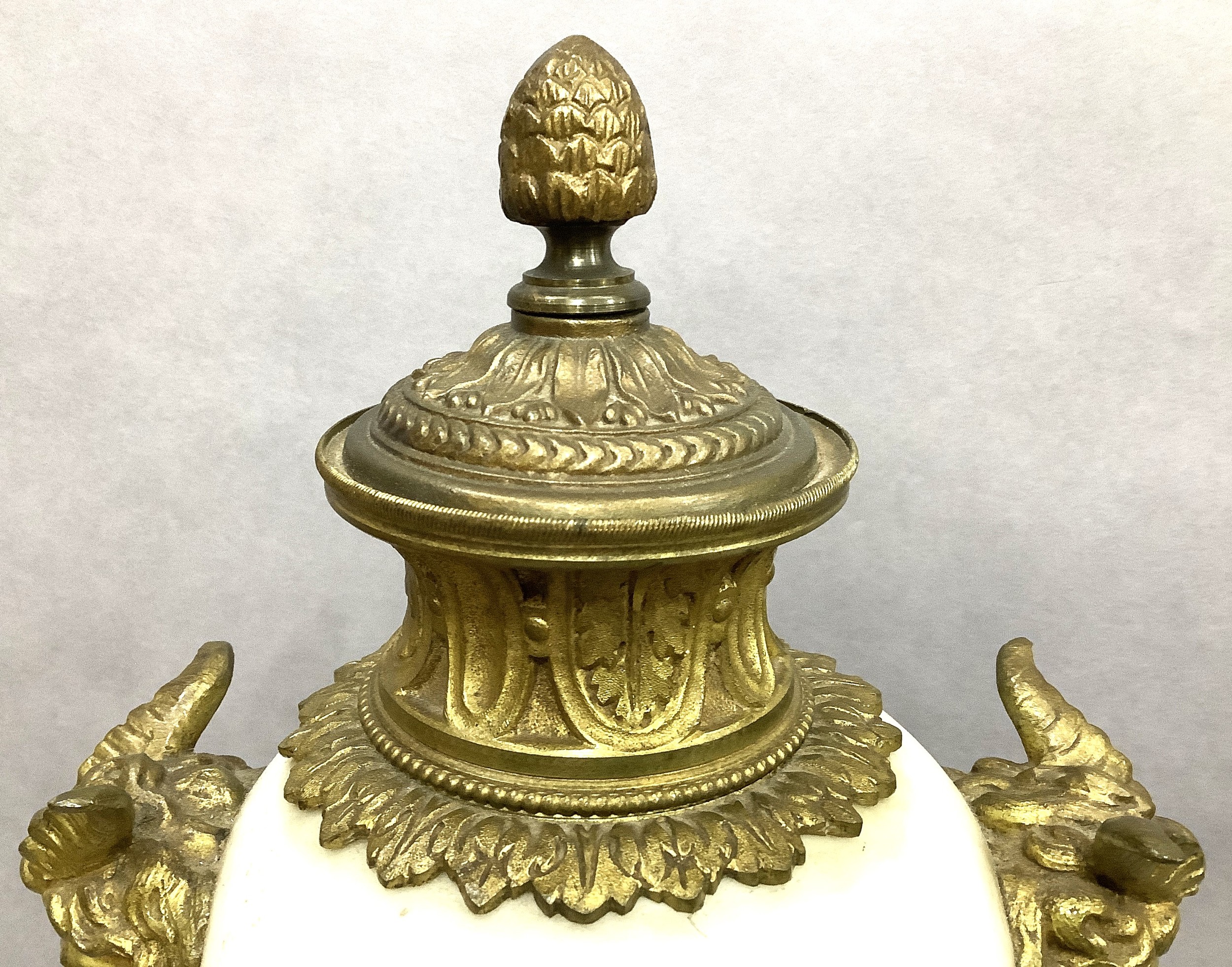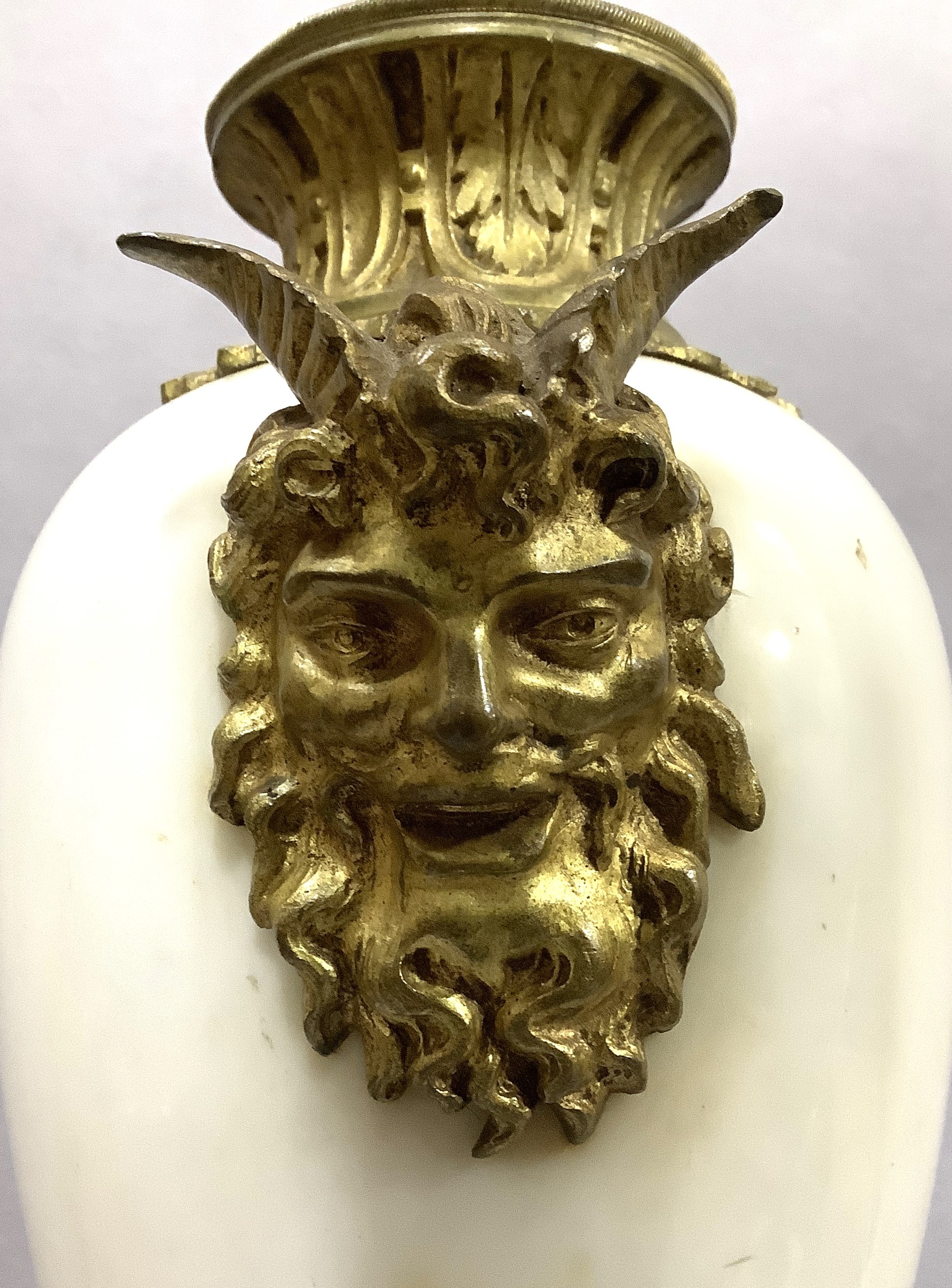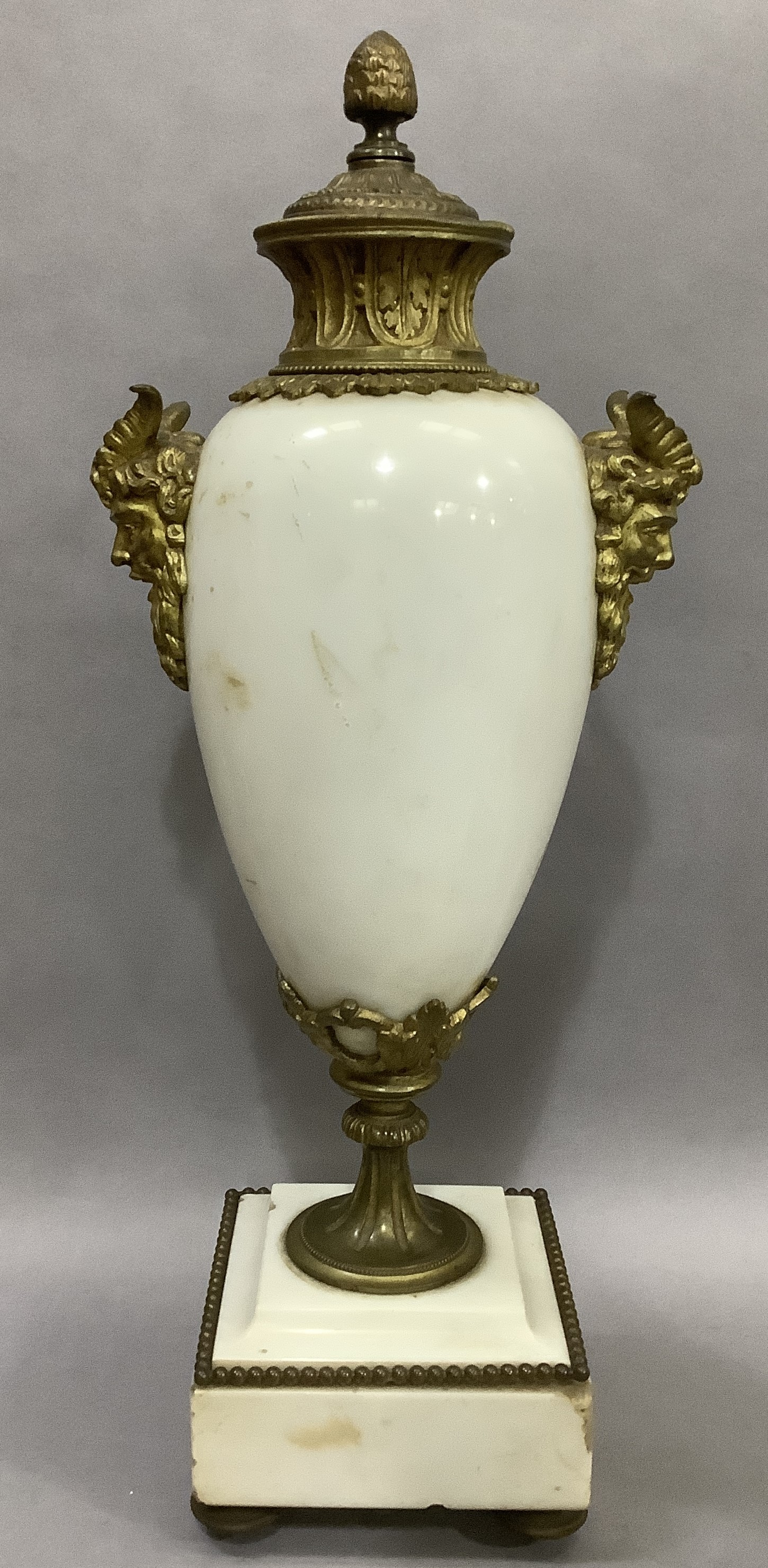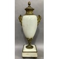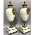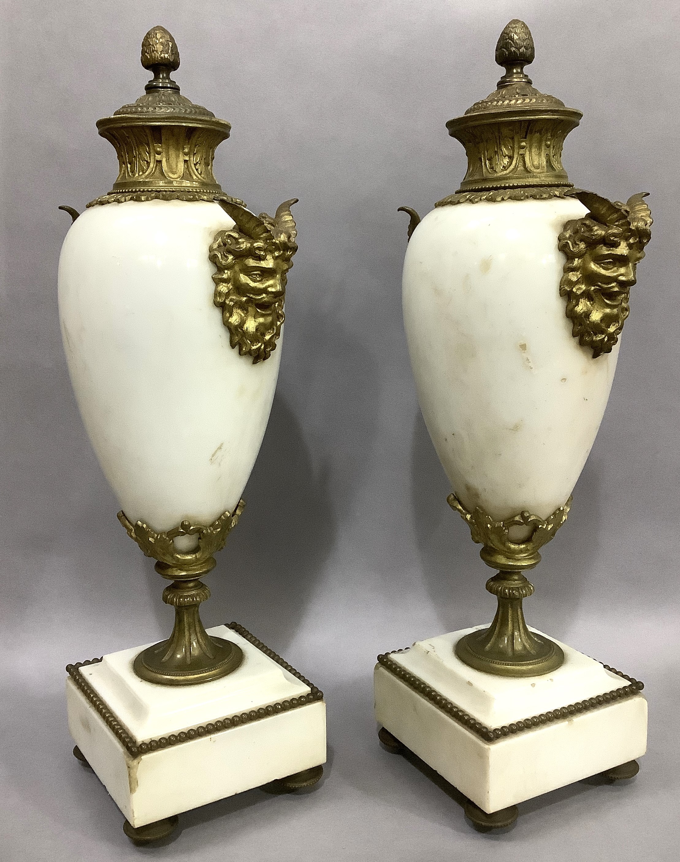A PAIR OF GILT METAL MOUNTED MARBLE URNS AND COVERS, of baluster form with twin Bacchus mask handles, on square beaded base and toupie feet, 45cm high