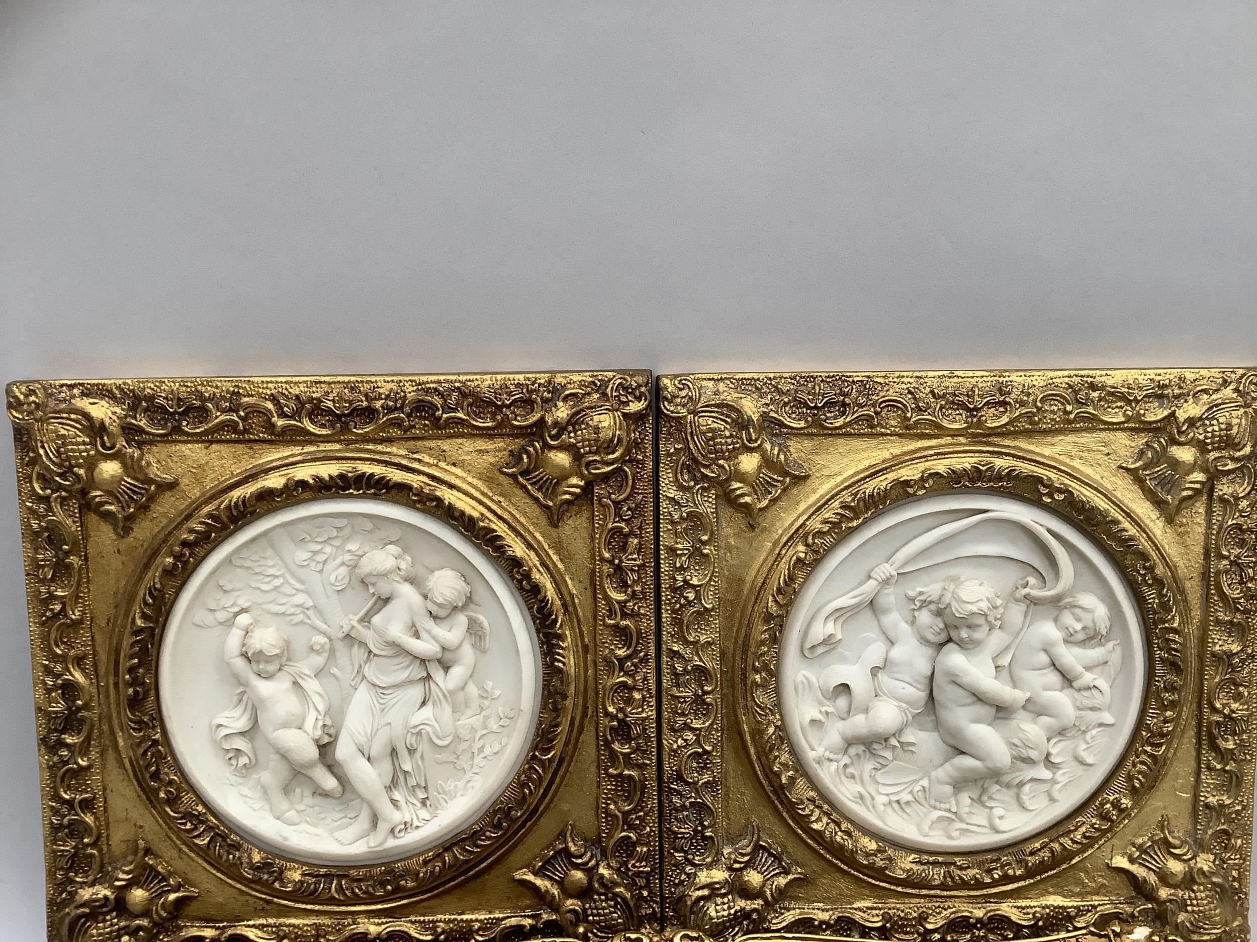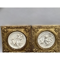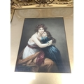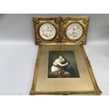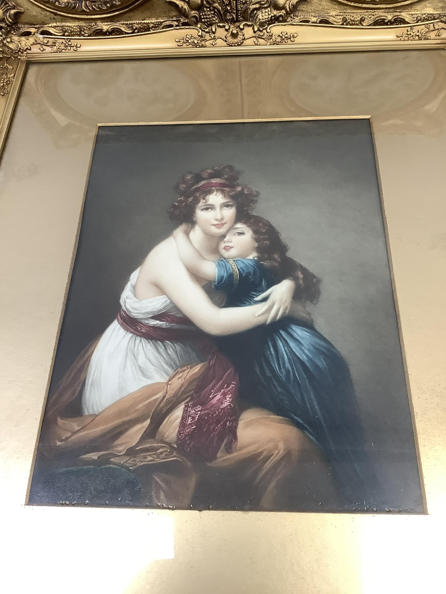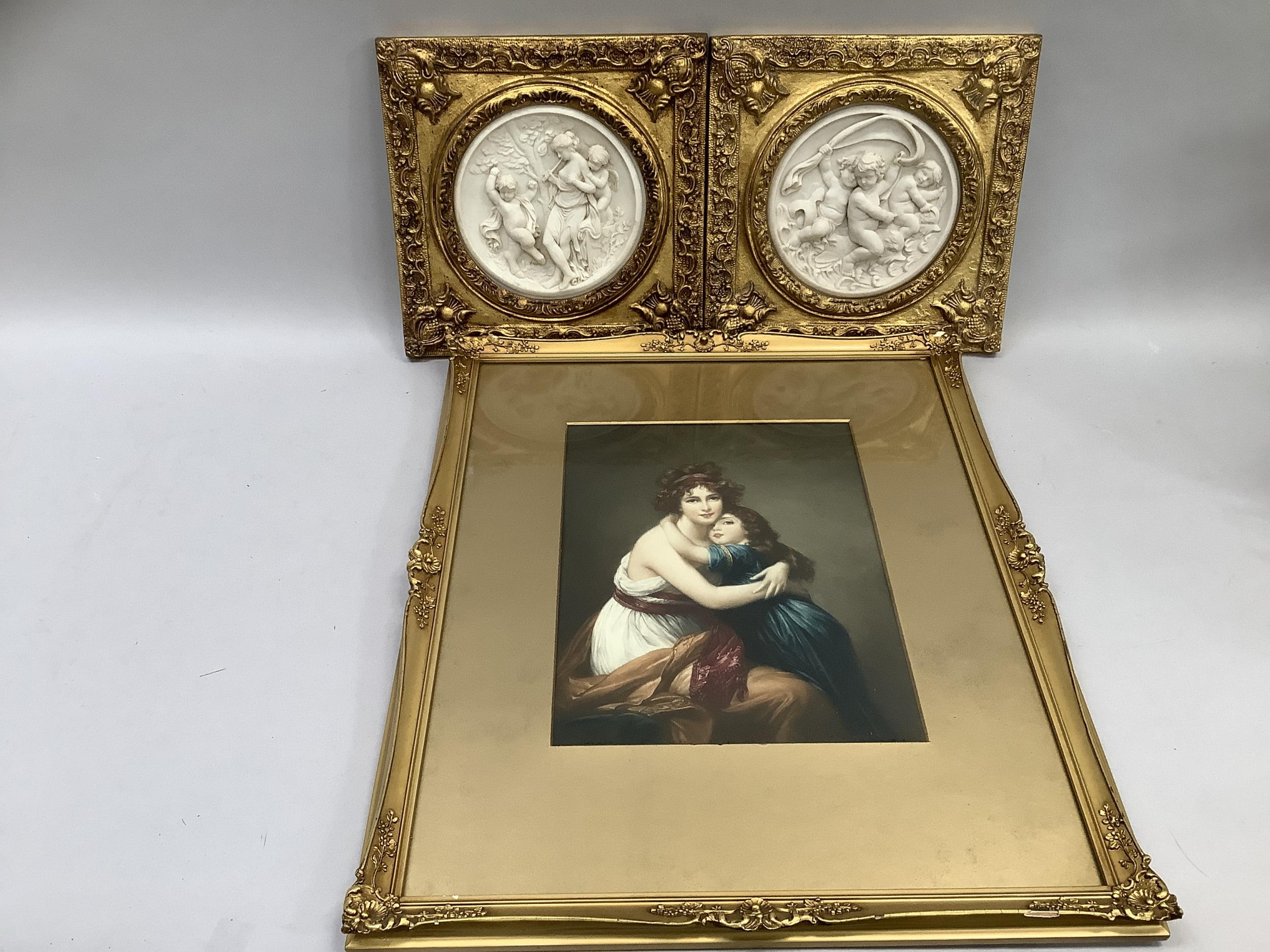 Madame Lebrun, self portrait with daughter Julie, colour print in gilt mount and frame, 26cm x 51cm overall together with a pair of reproduction circular plaques moulded in high relief with cherubs and classical figures in gilt frames, 30.5cm x 30.5cm