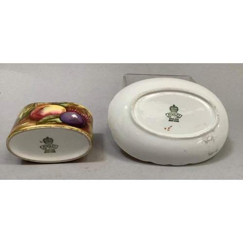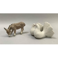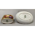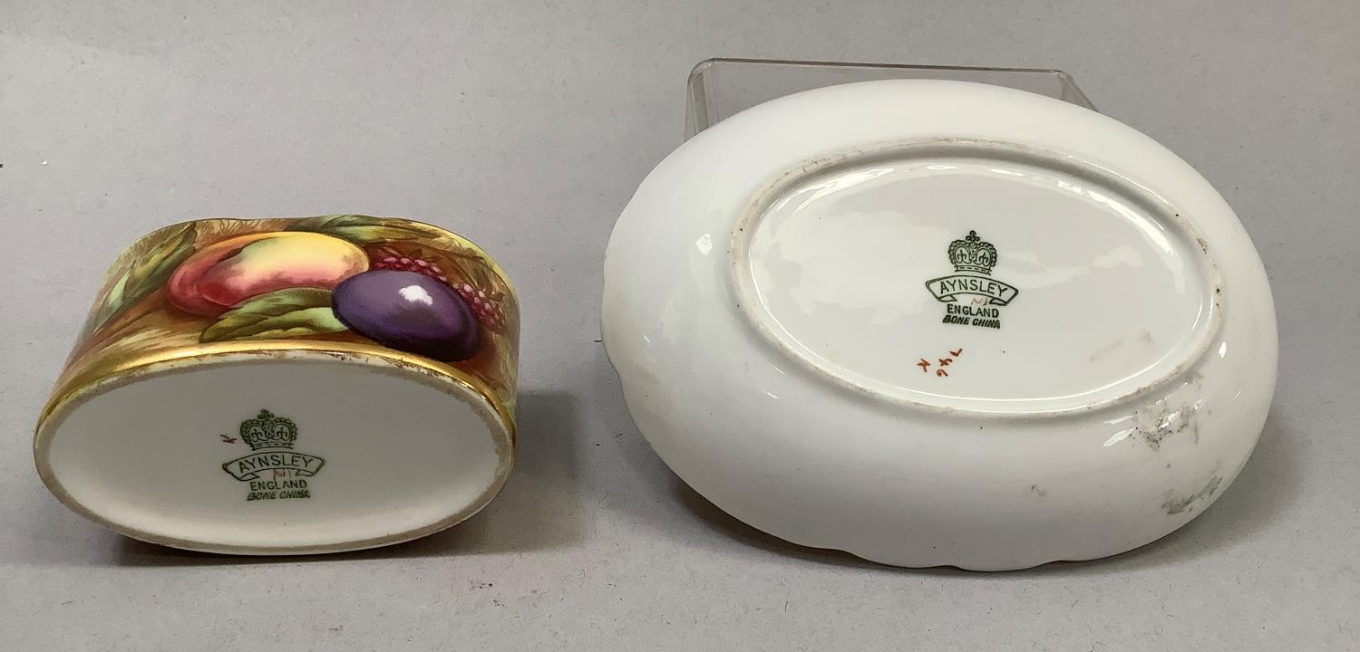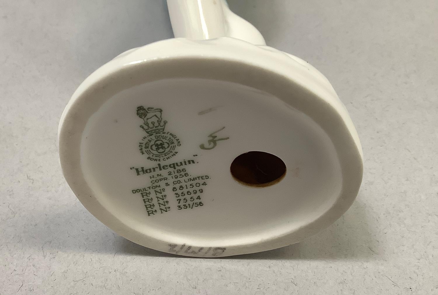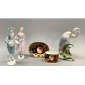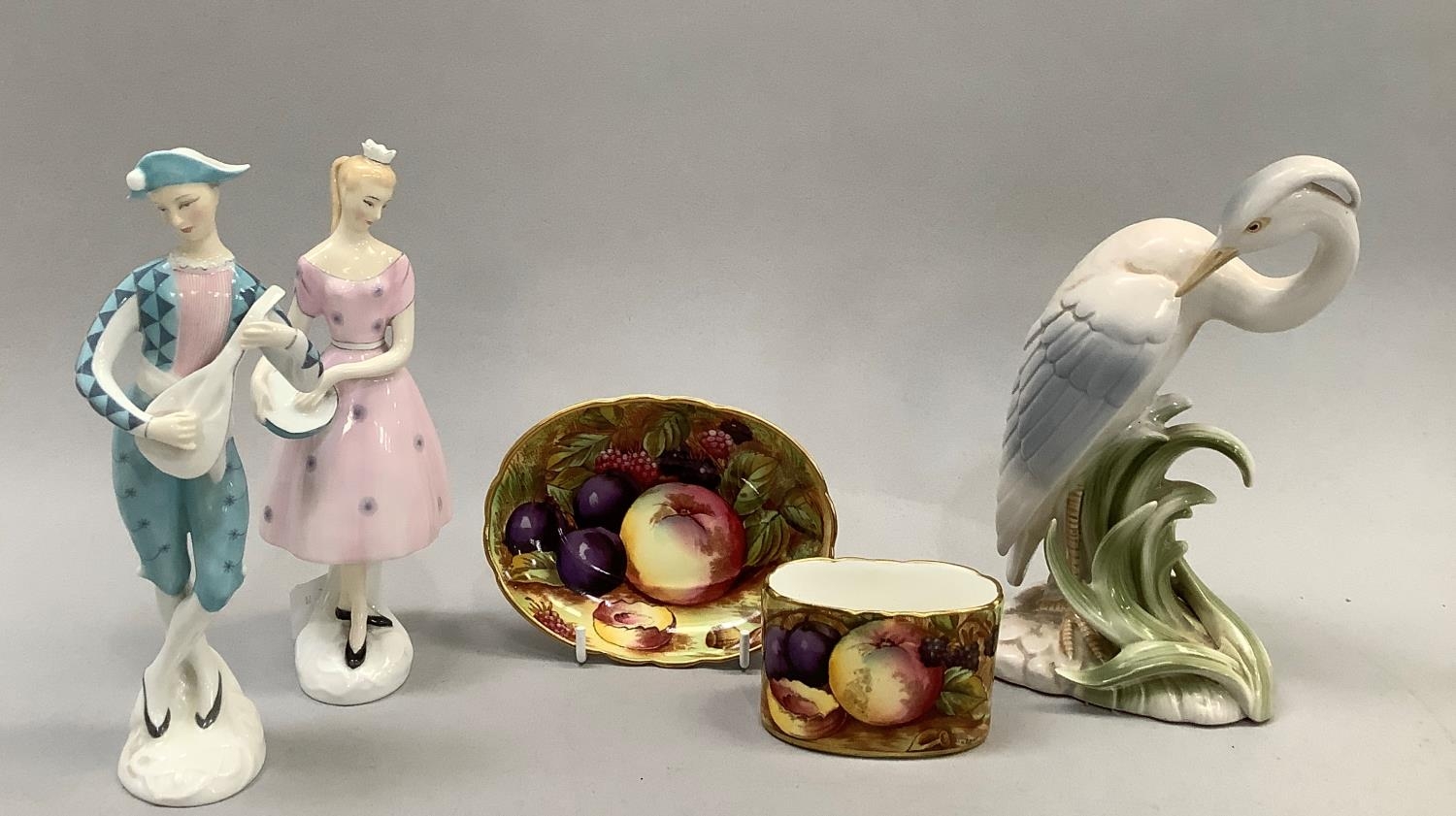 Two Royal Doulton figures, 'Harlequin', HN2186, 19cm, and 'Columbine', HN2185, 18.5cm high, together with a Fitz & Floyd Japan egret, 18.5cm, and an Aynsley china fruit-decorated table vase and oval dish