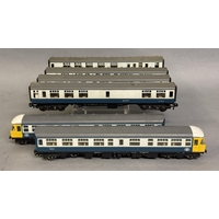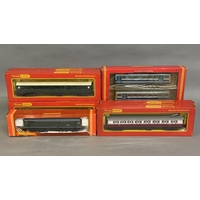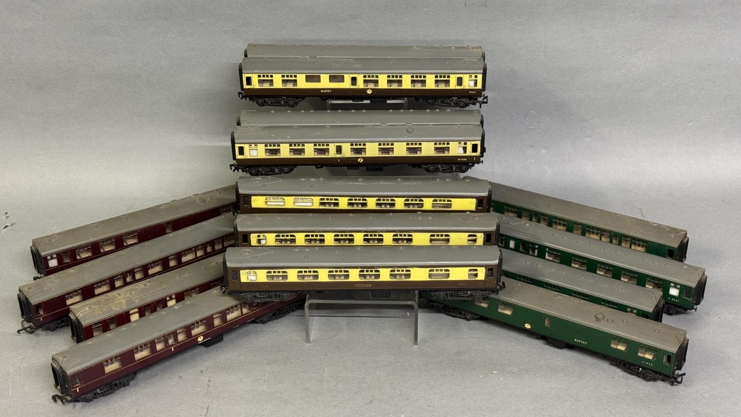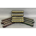 A collection of 15 Trix model railway coaches, including three Pullman cars comprising Adrian, Aries and Carina, three red Southern Railways composite corridor coaches and a buffet car, two cream/brown Southern Railway composite corridor coaches, a buffet car and a guard coach, along with three green Southern Railways composite corridor coaches and a buffet car