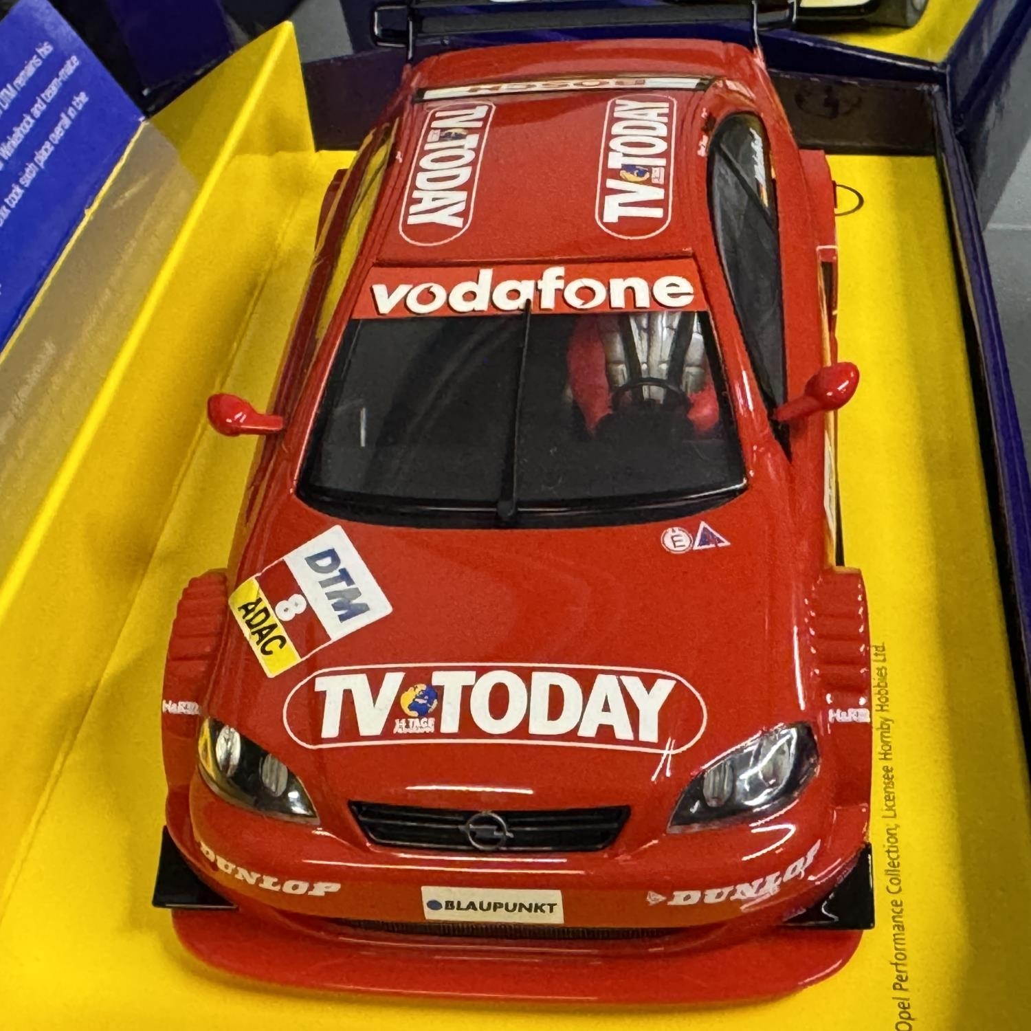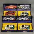 Four Scalextric Sport scale models, including two Skoda Fabia WRC Works editions with four wheel drive, a BMW Mini Cooper S and an Opel Astra V8 Coupé, all boxed