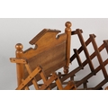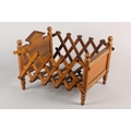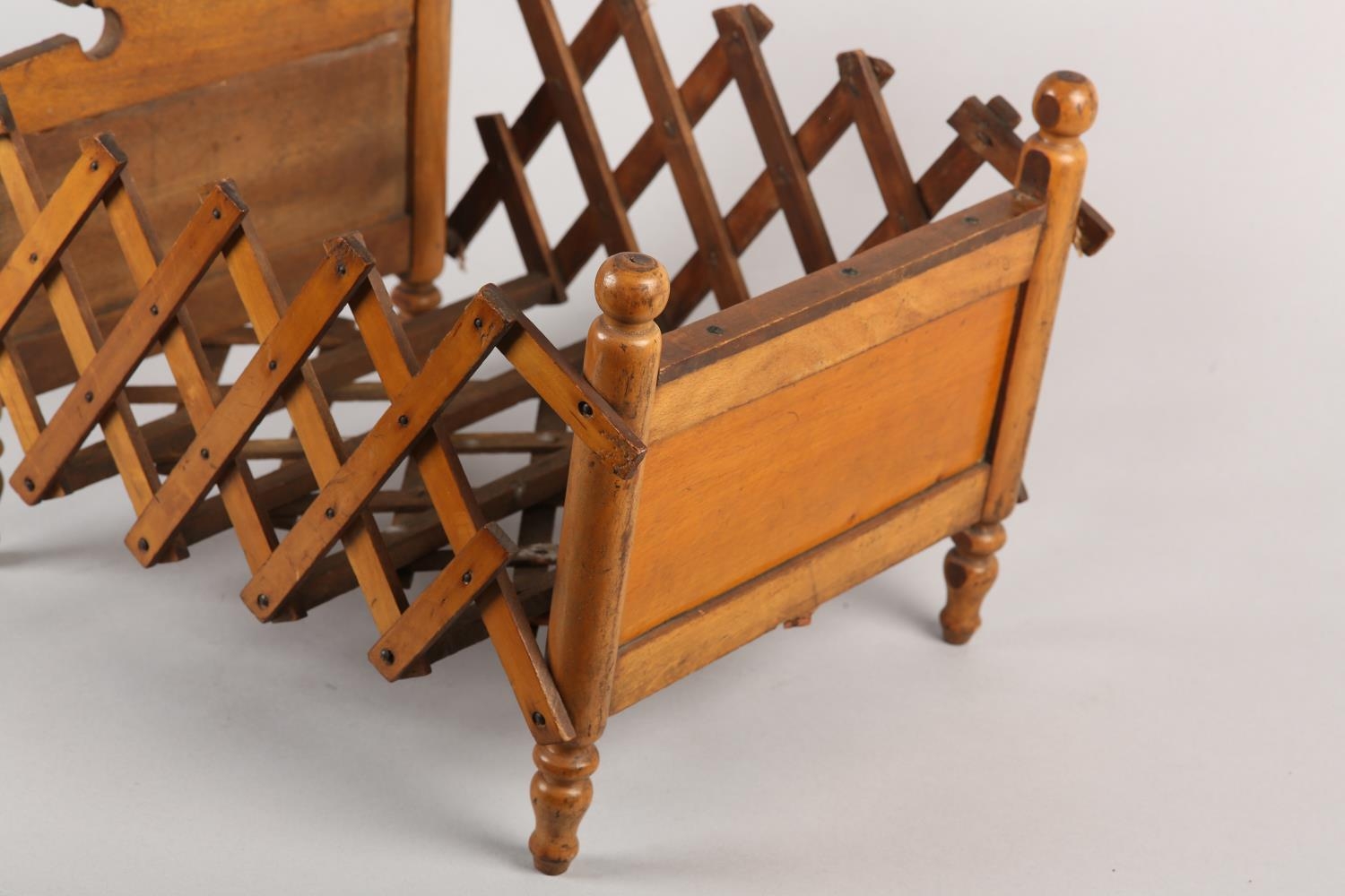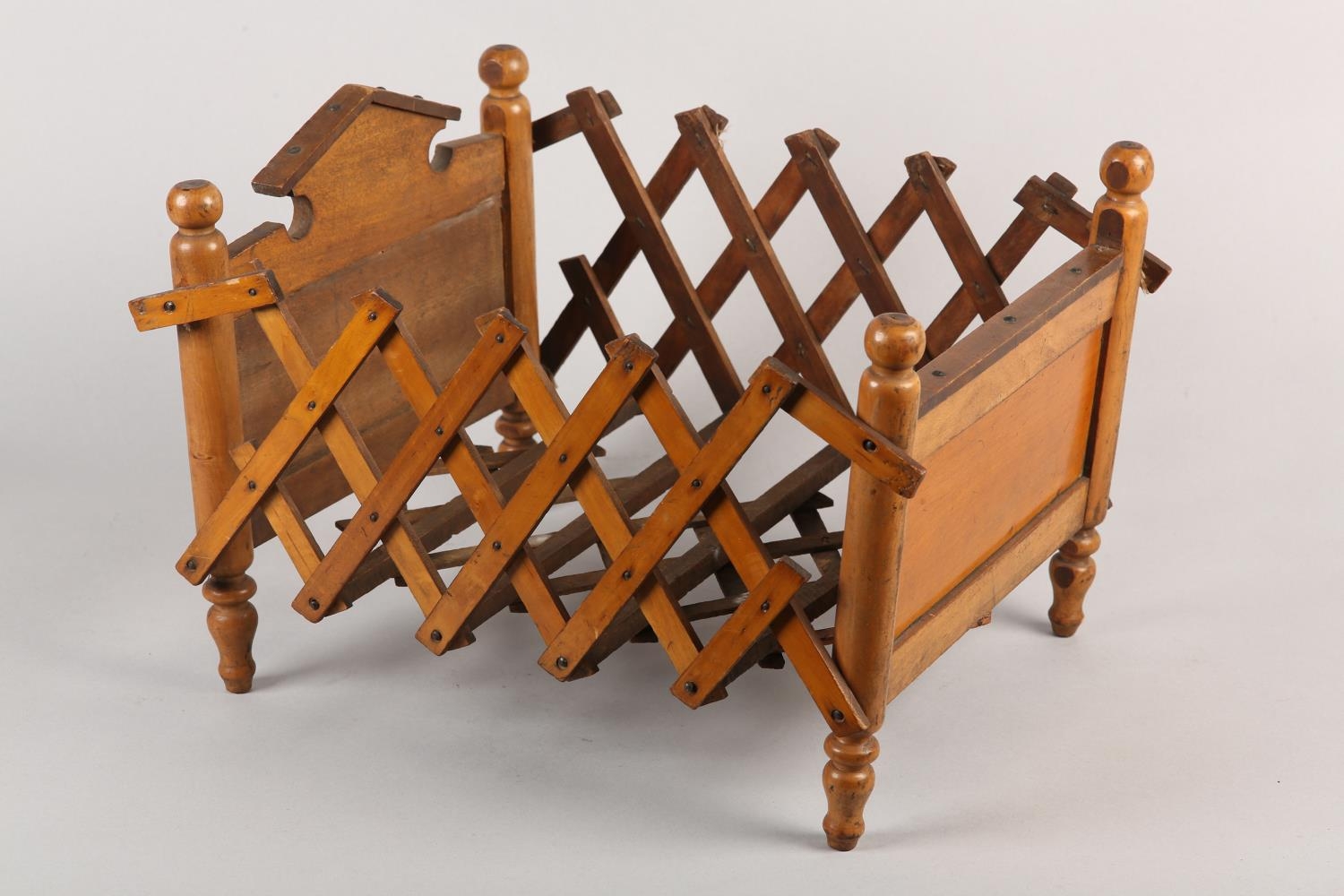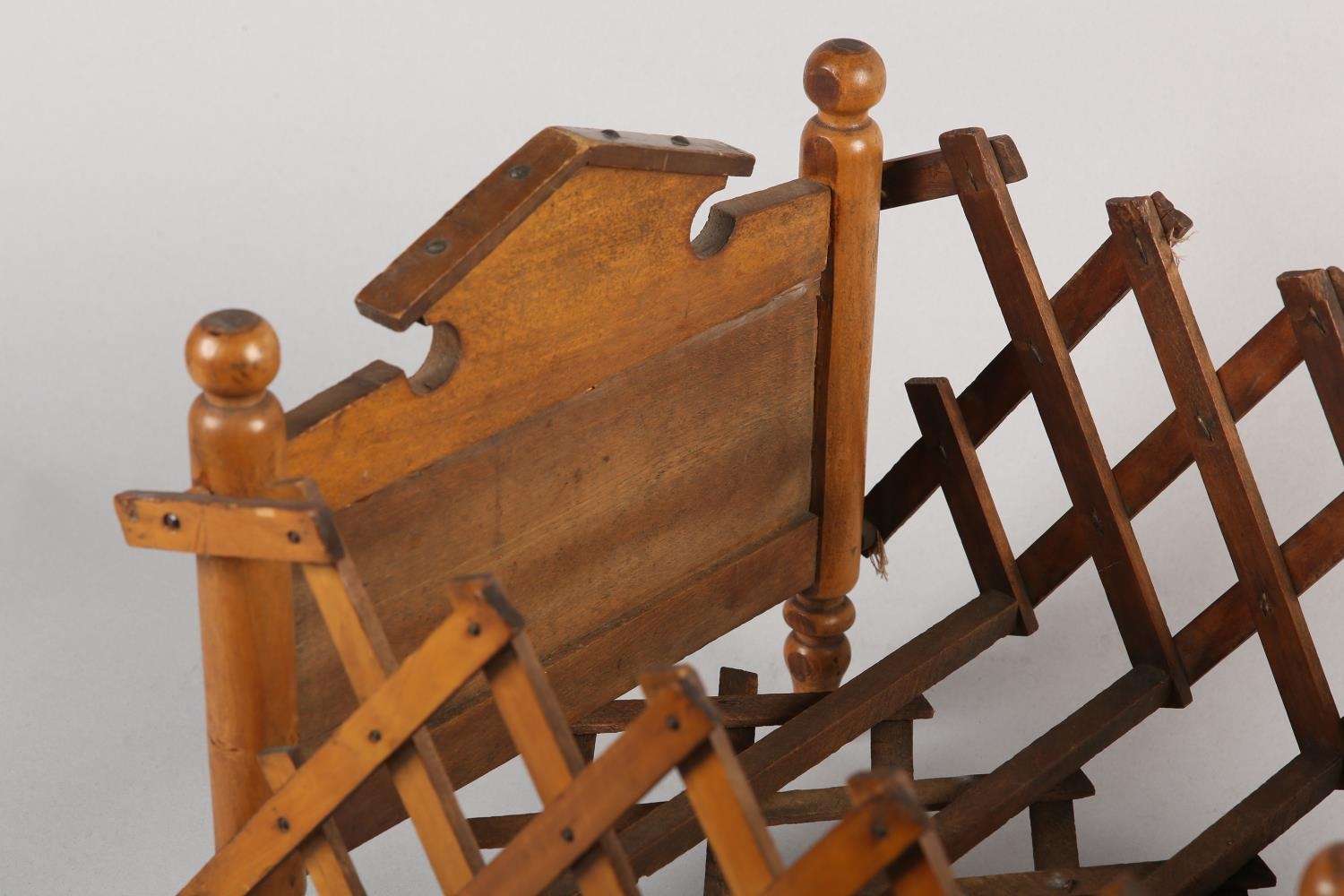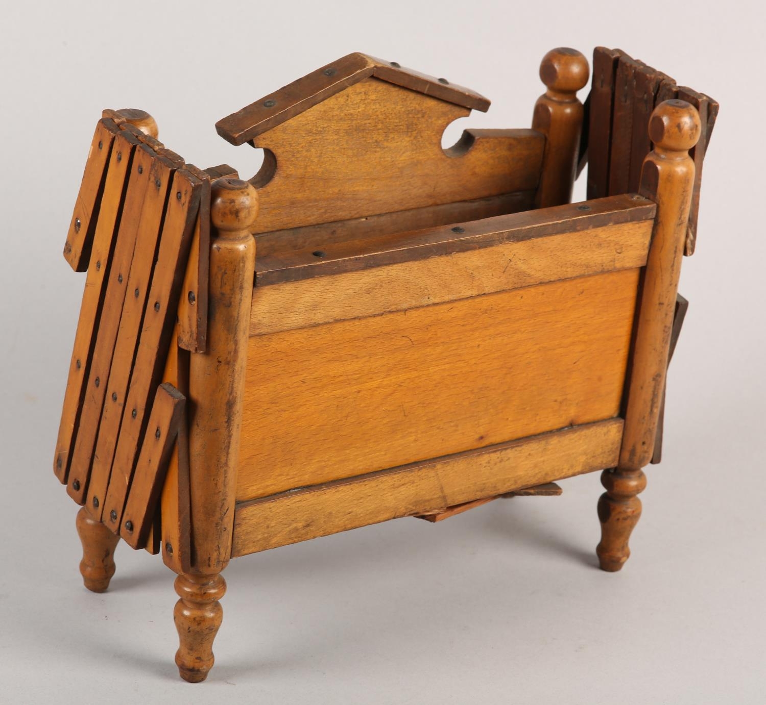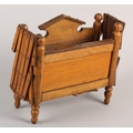 A VICTORIAN DOLL'S BED in polished satin beech, having an arched head board and concertina frame, on turned legs, 41cm long x 29cm wide x 25cm high