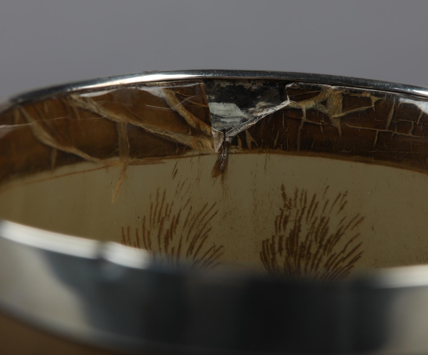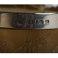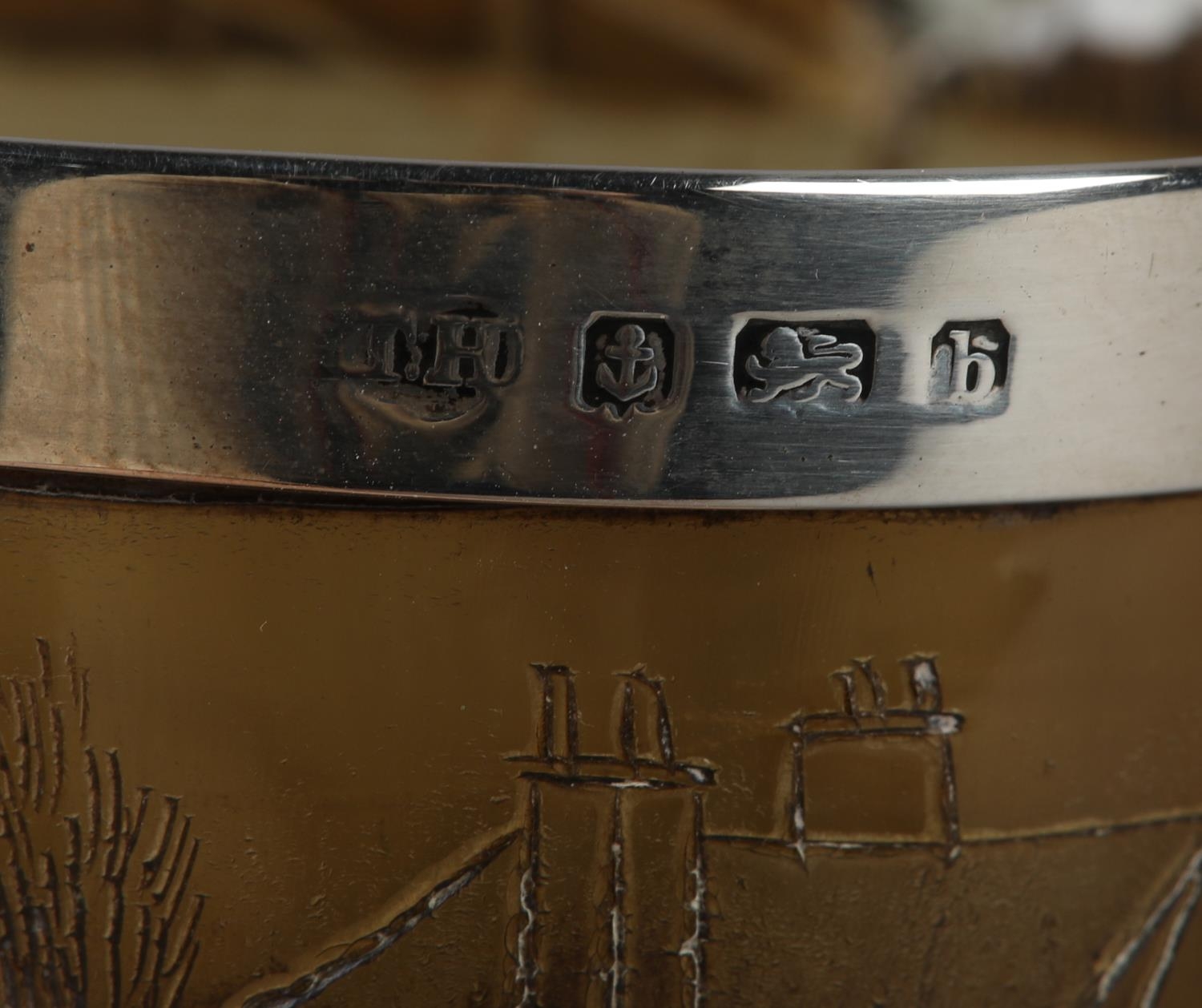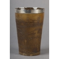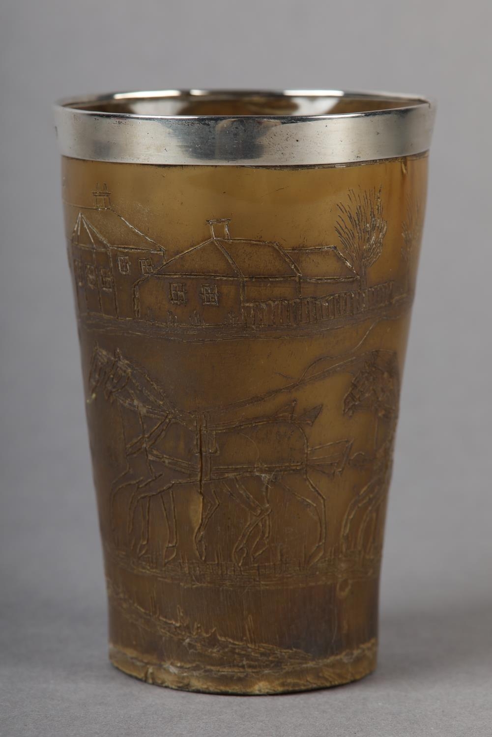 AN EARLY 19TH CENTURY HORN BEAKER, incised with a continuous scene of two carriages, each pulled by a team of four horses, in a rolling landscape with hostelry, later silver rim, 10.5cm high