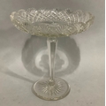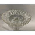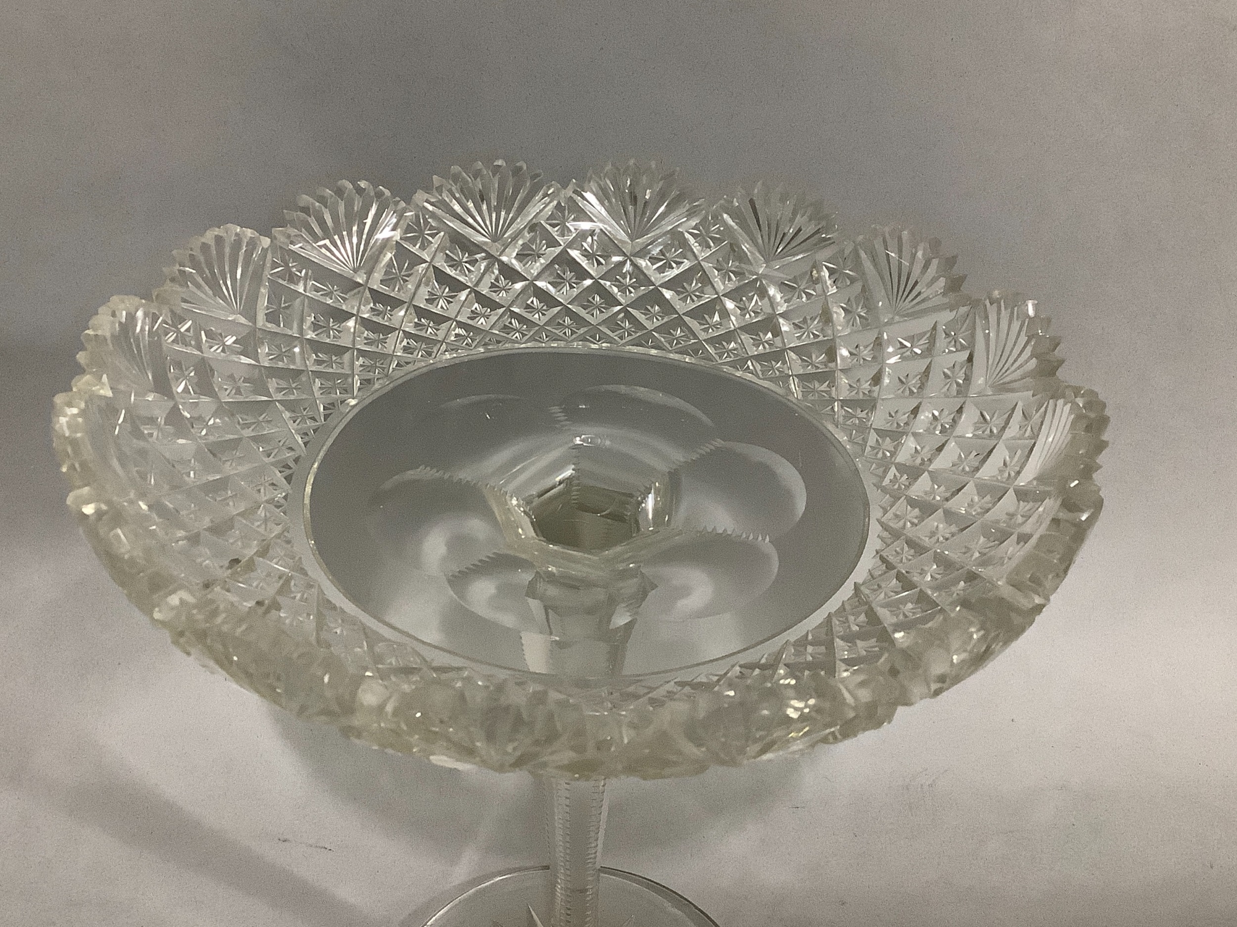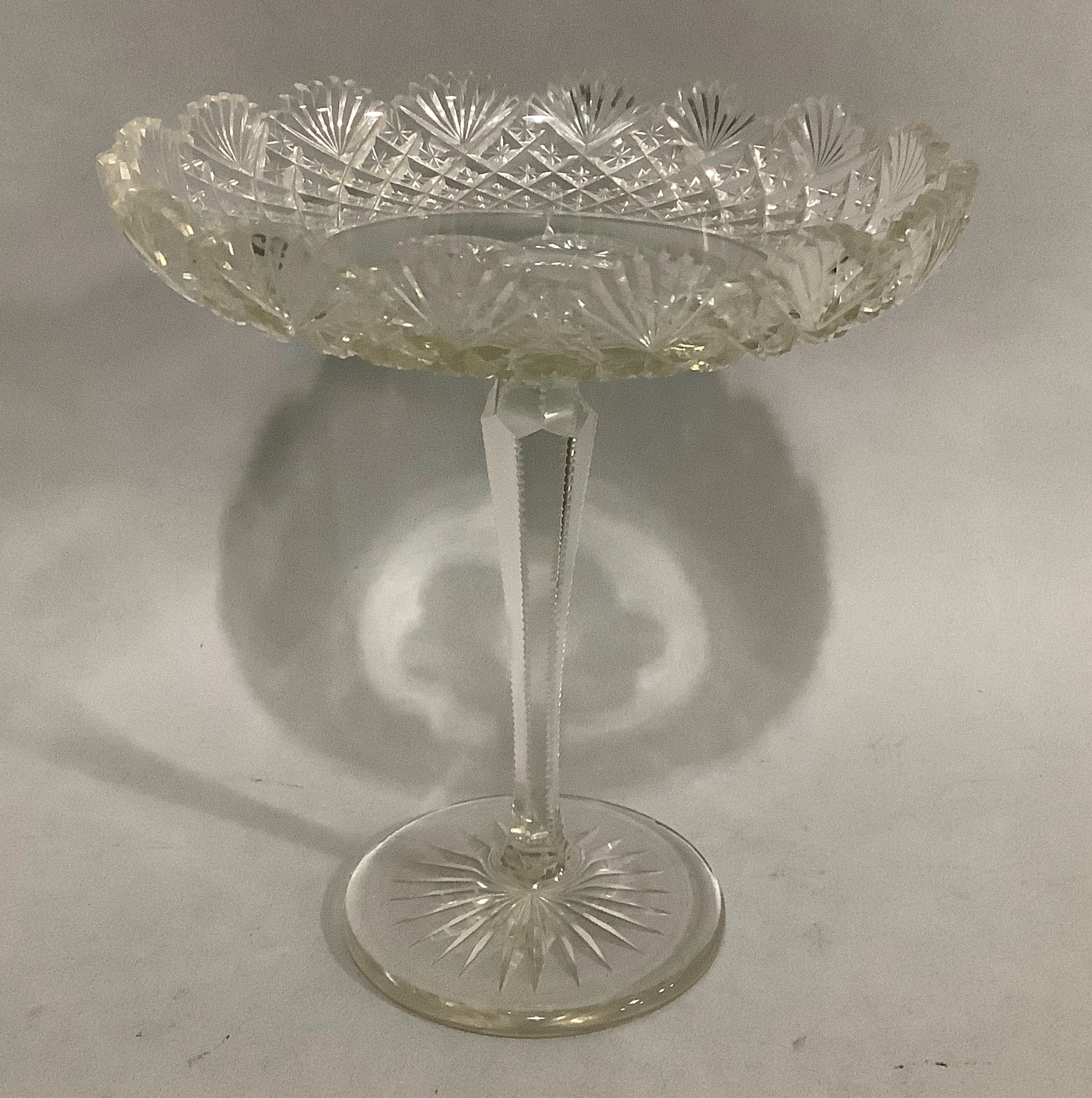 An early 20th century cut glass pedestal dish having a cut fanned rim and a faceted stem on a circular foot, 18.5cm diameter x 20.5cm high