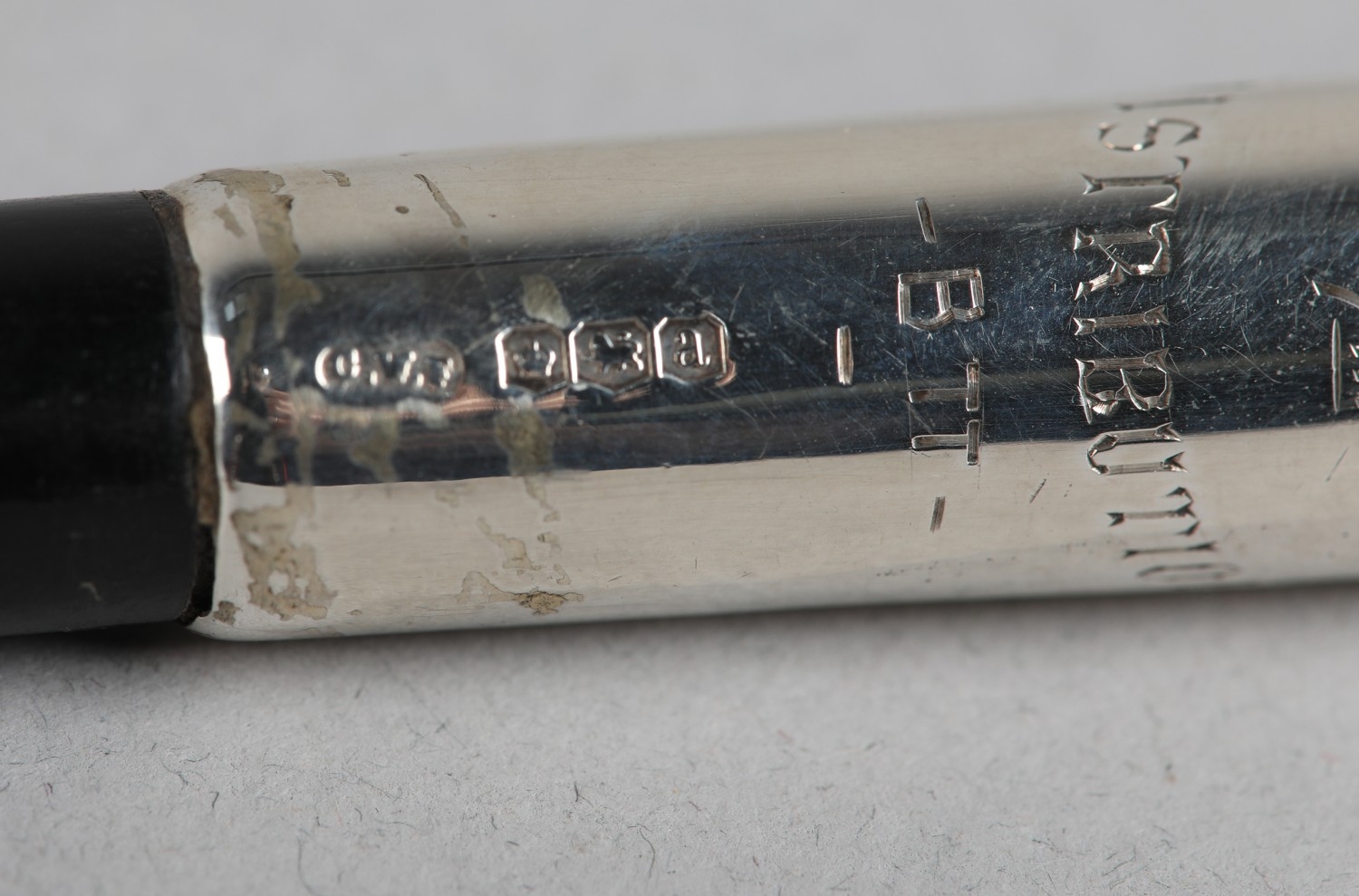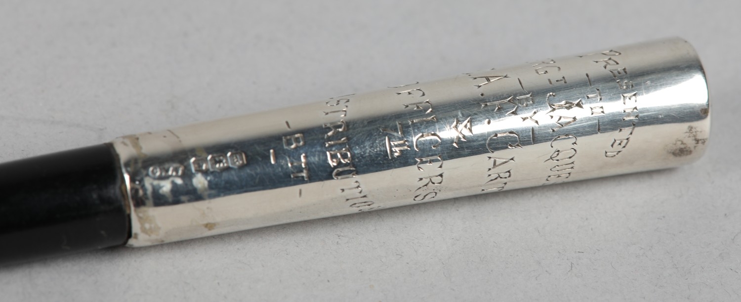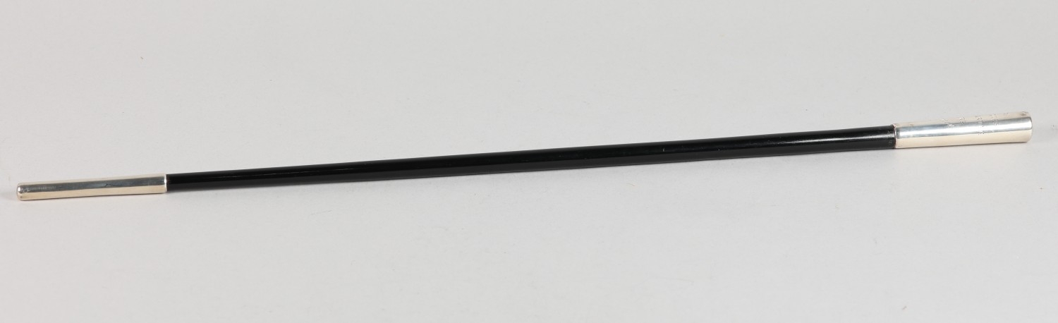 A GEORGE V SILVER MOUNTED EBONISED BATON, Sheffield 1918 for C. W. Fletcher & Son Ltd, inscription 'Presented to Sergt. Jacques By Col. E. A. F. Carter & Officers 7th', Distribution Btt., in velvet lined case, 53cm long