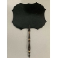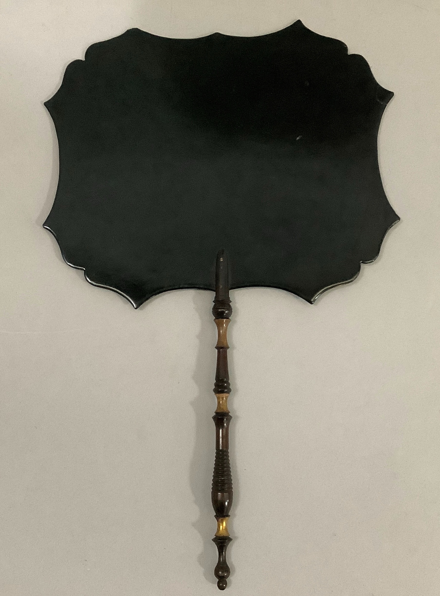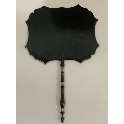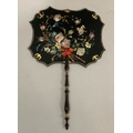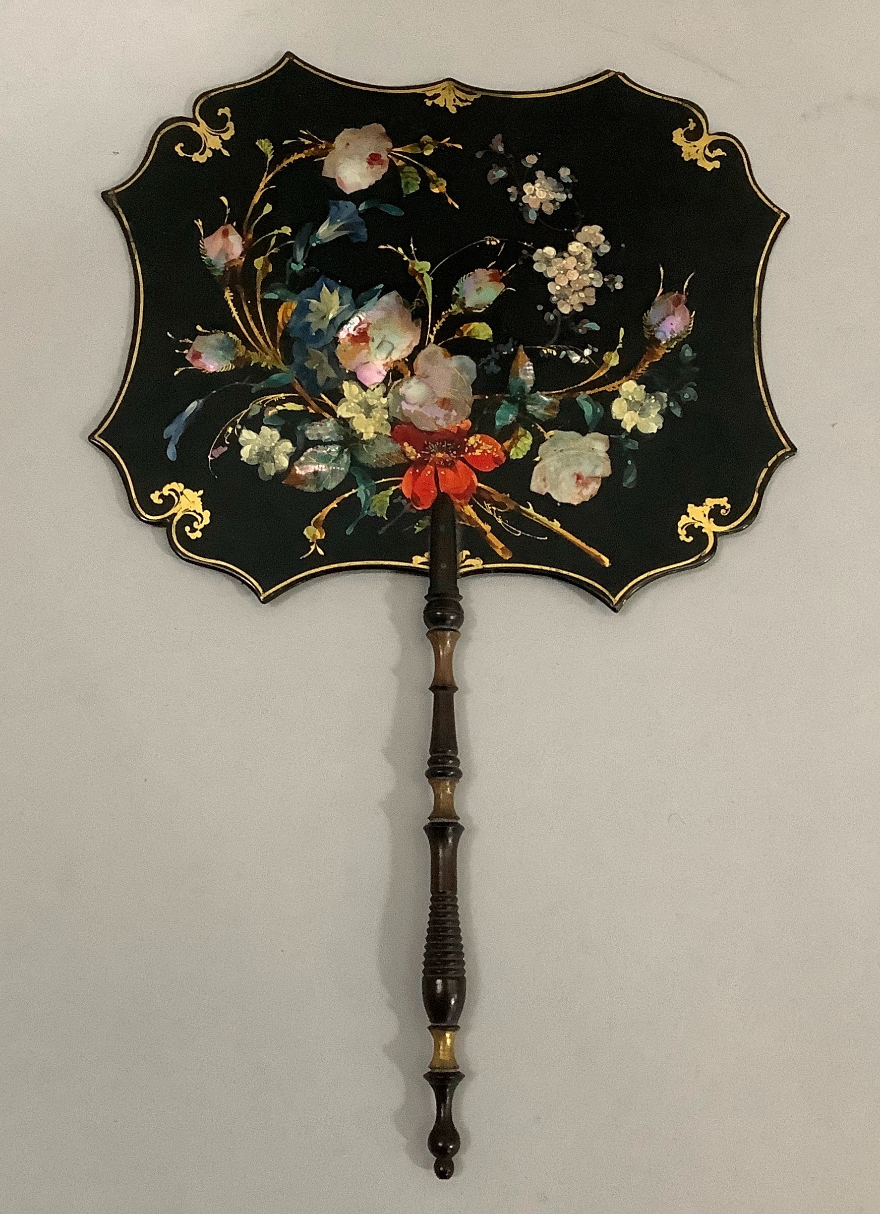 A Victorian papier-mâché face fan inlaid and painted with flowers on a turned and gilded handle