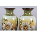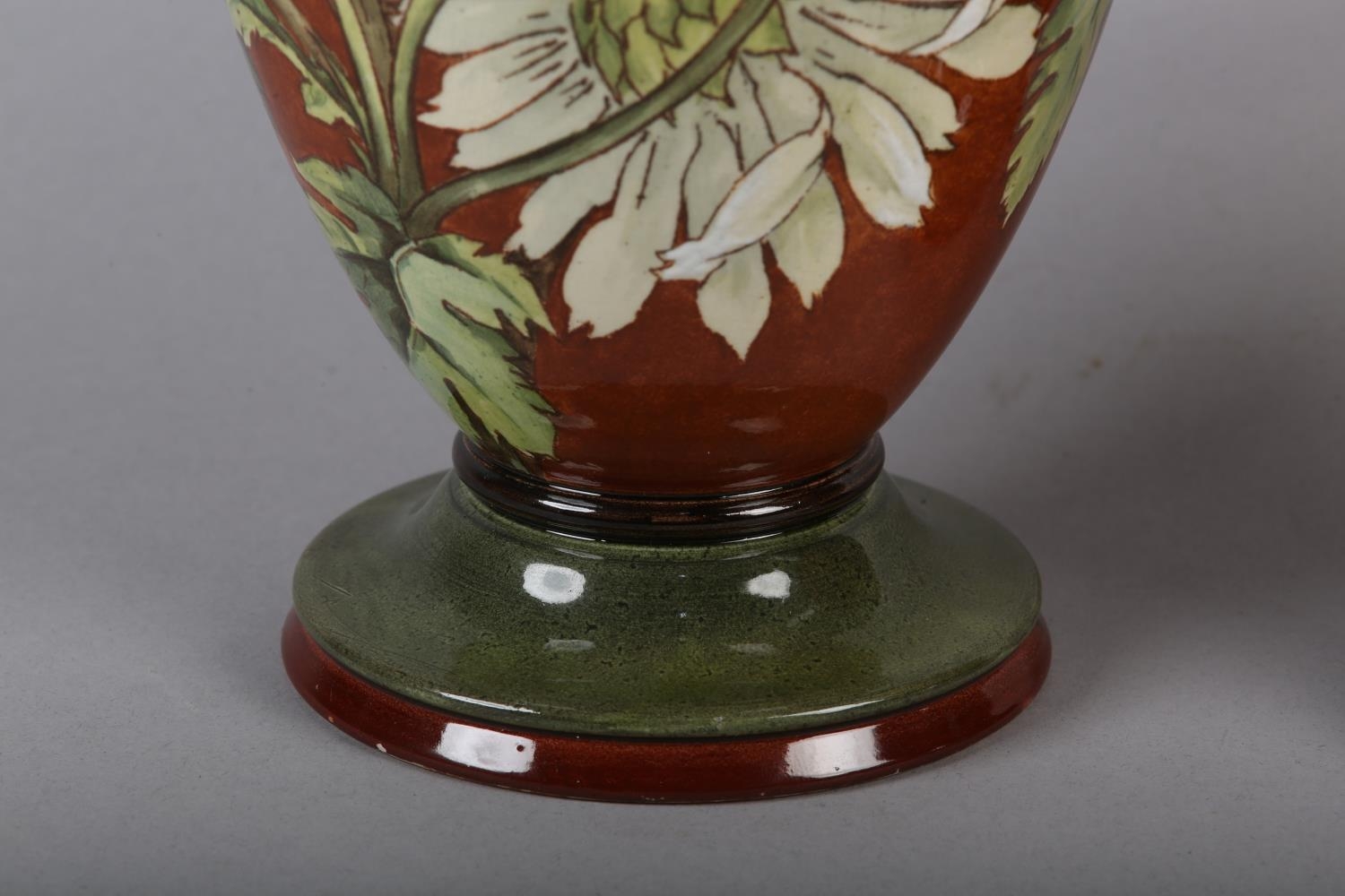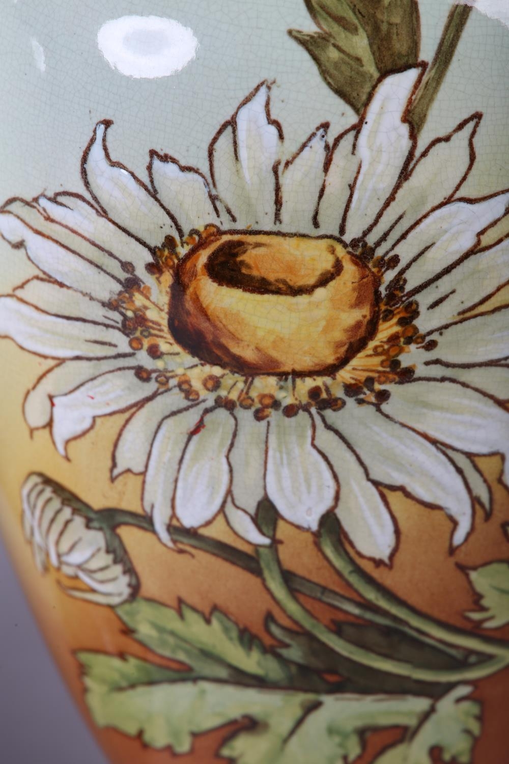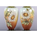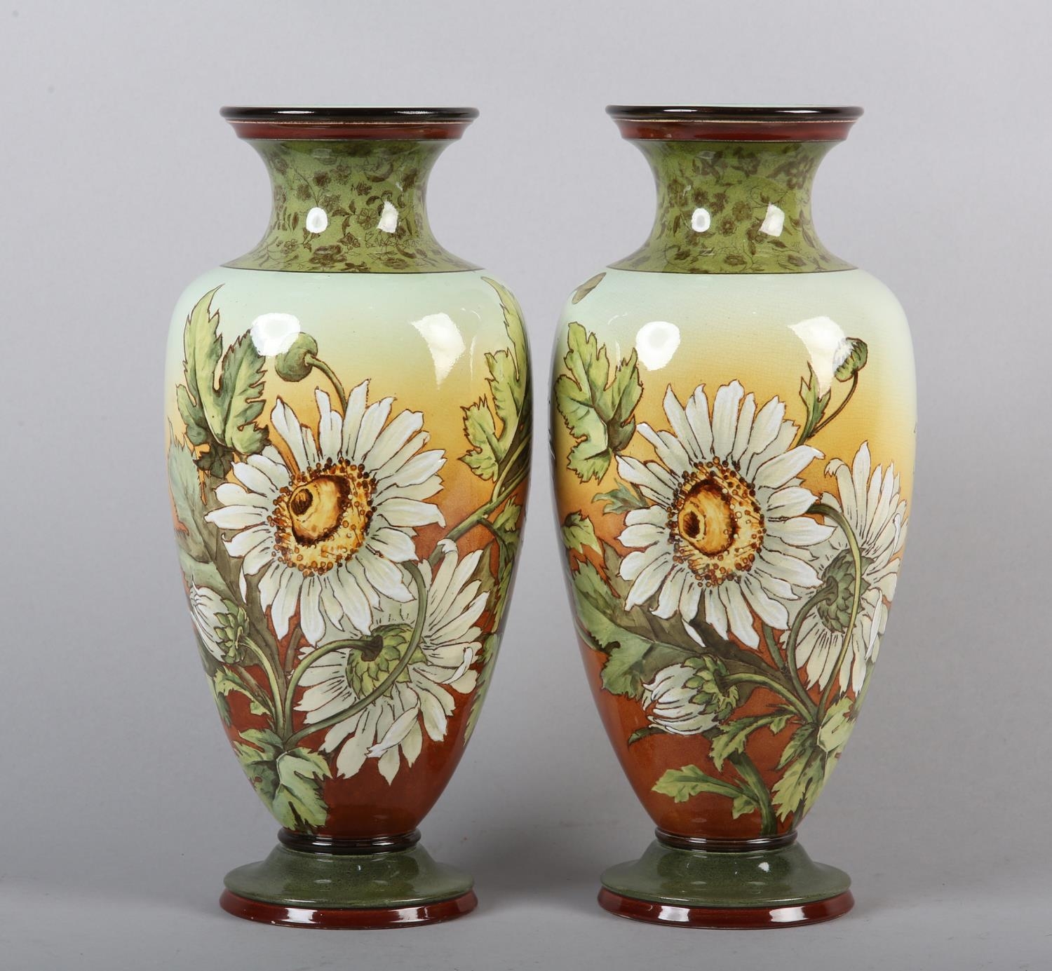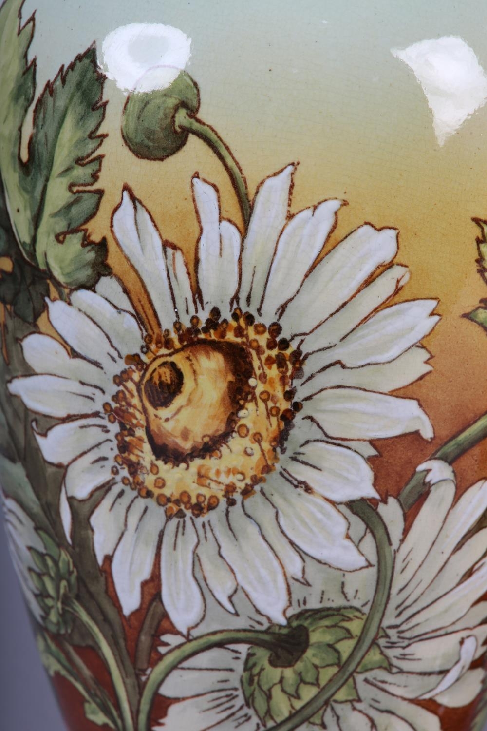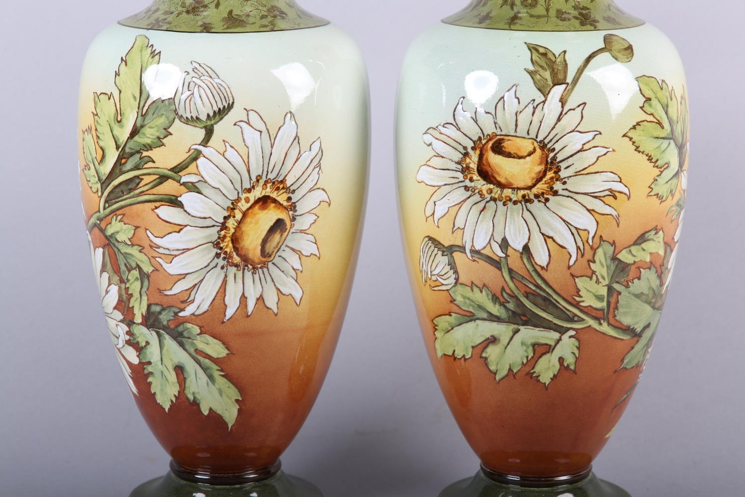 A 19TH CENTURY PAIR OF DOULTON LAMBETH FAIENCE VASES of baluster form, printed and enamelled with asters on a brown/amber tinted ground, between green borders, printed and impressed marks and no. 2622, painted II 144E, 32.5cm high