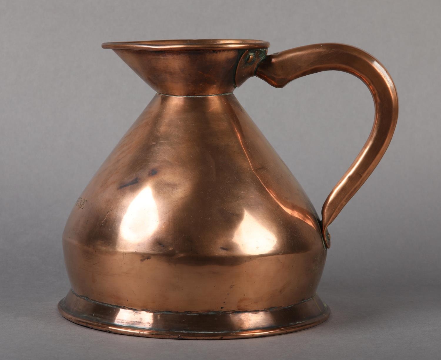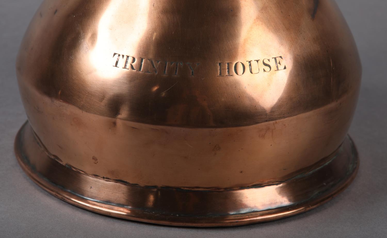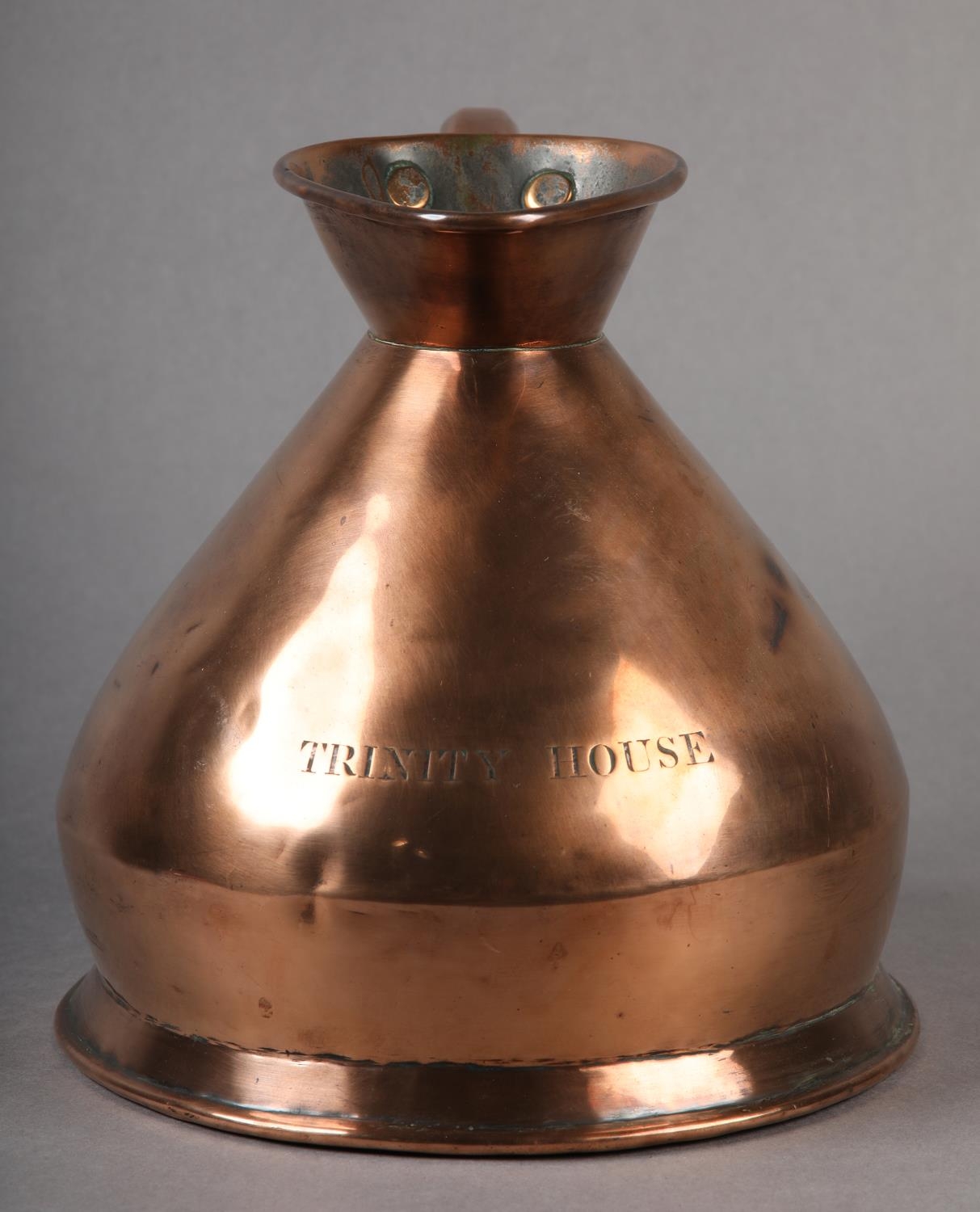 A 19TH CENTURY COPPER HALF GALLON MEASURE, engraved 'Trinity House' and stamped '1/2 Imperial' to underside, 19.5cm high