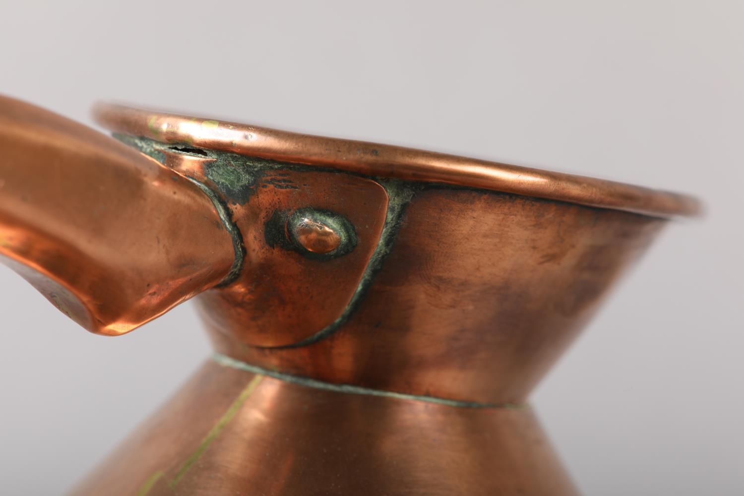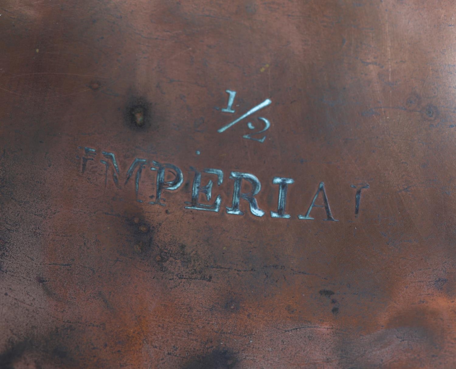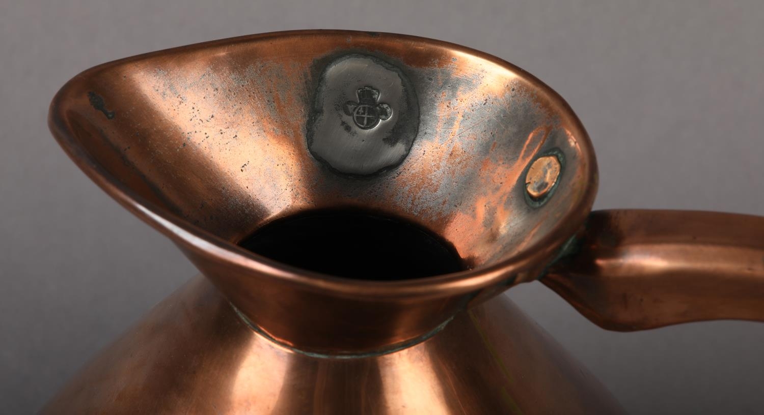 A 19TH CENTURY COPPER HALF GALLON MEASURE, engraved 'Trinity House' and stamped '1/2 Imperial' to underside, 19.5cm high