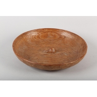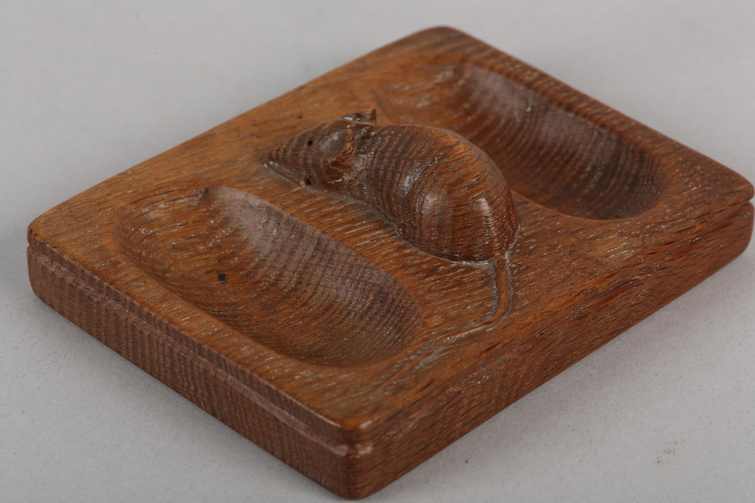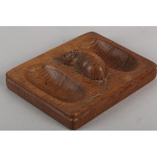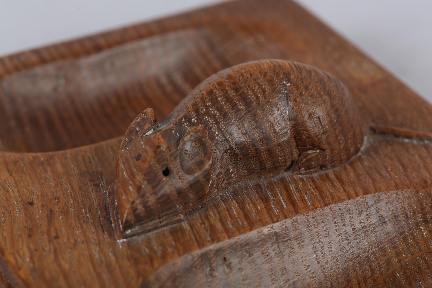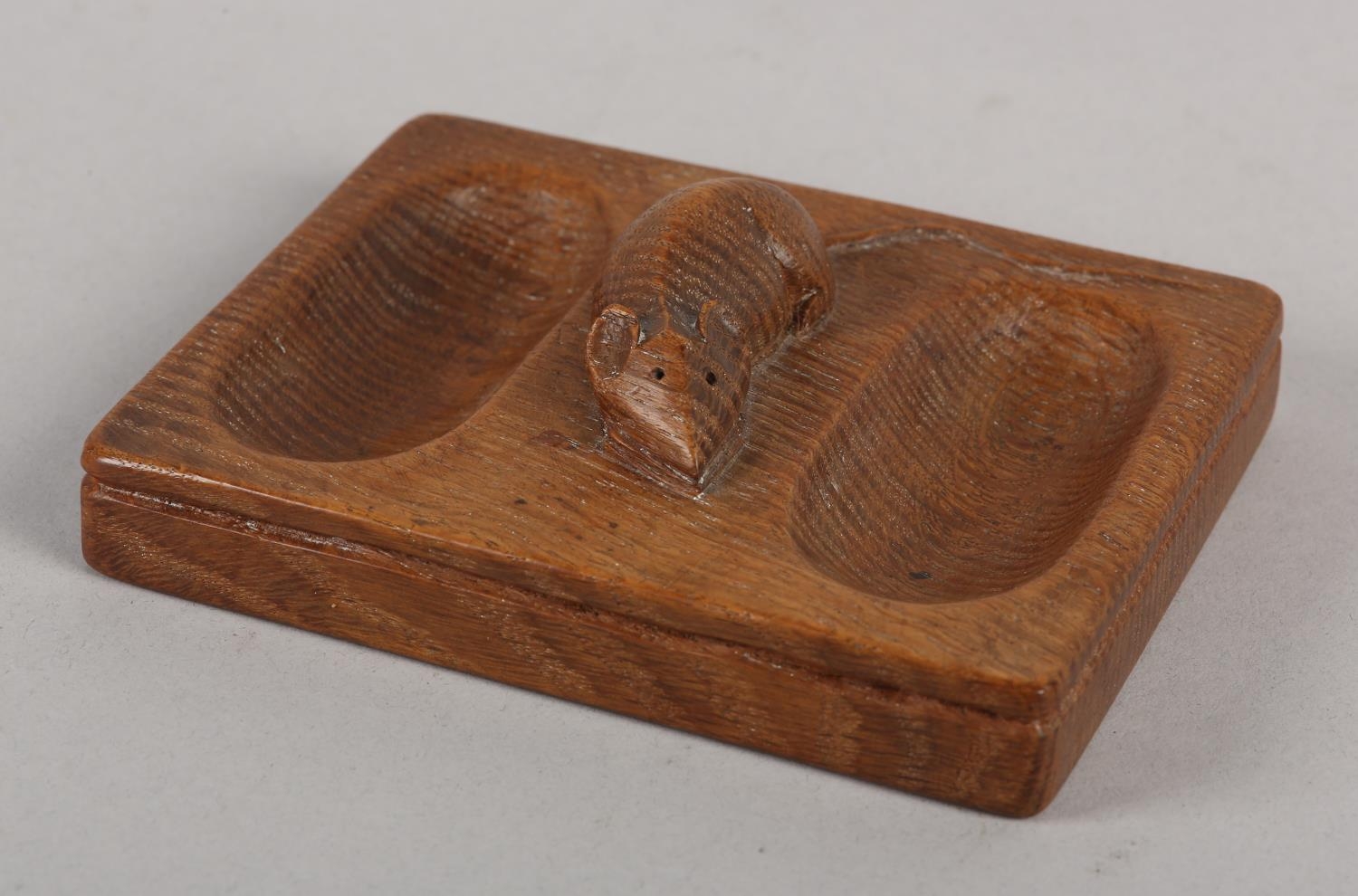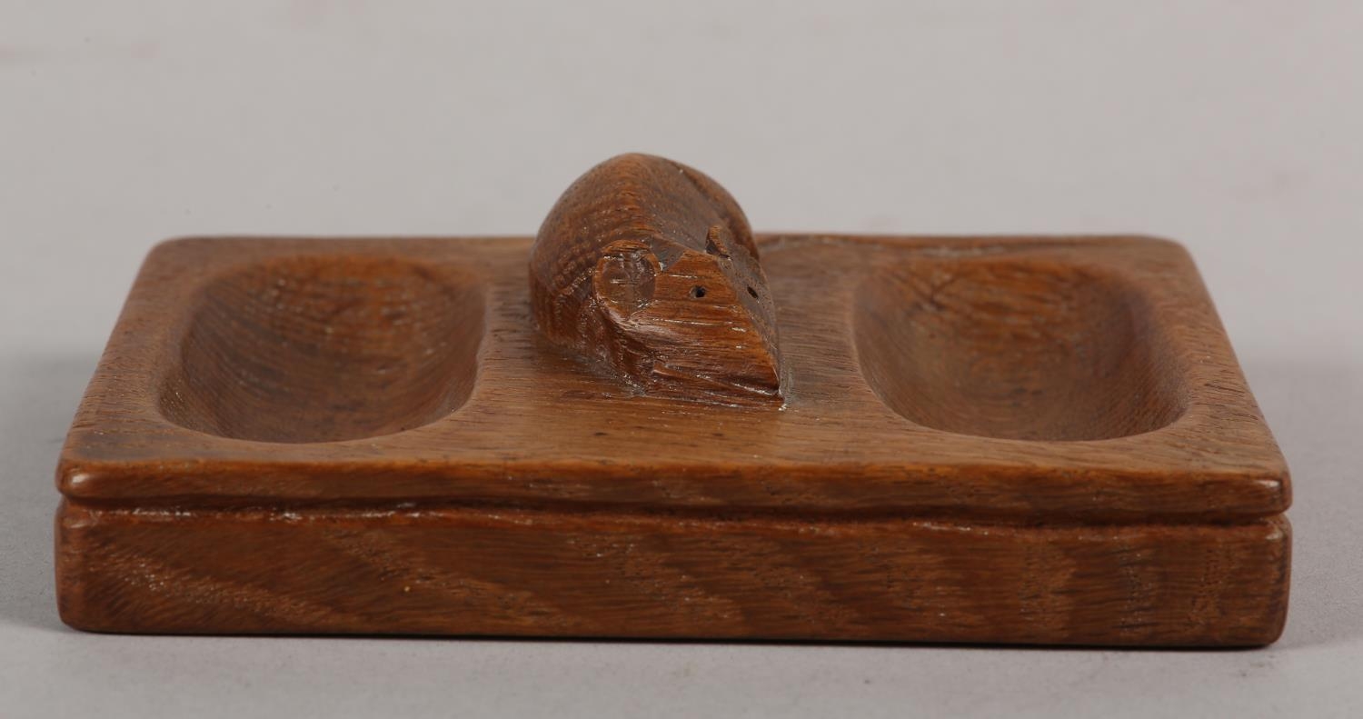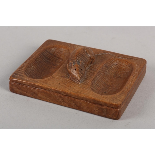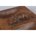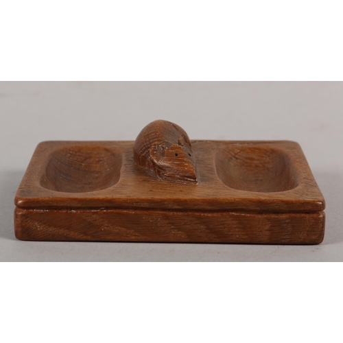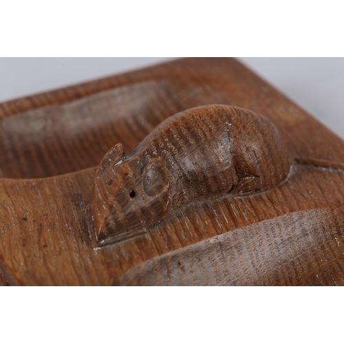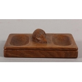 WORKSHOP OF ROBERT 'MOUSEMAN' THOMPSON OF KILBURN, an English oak desk tidy, having two recesses flanking a mouse carved in relief, 12cm x 10cm