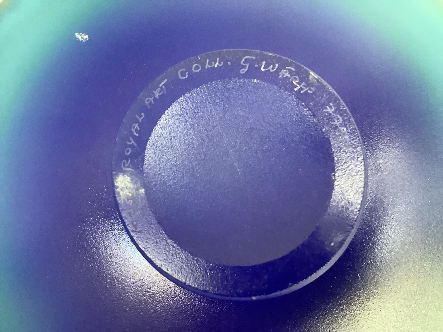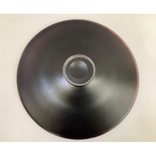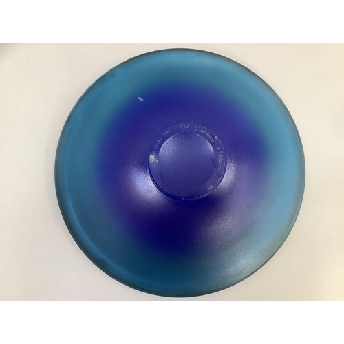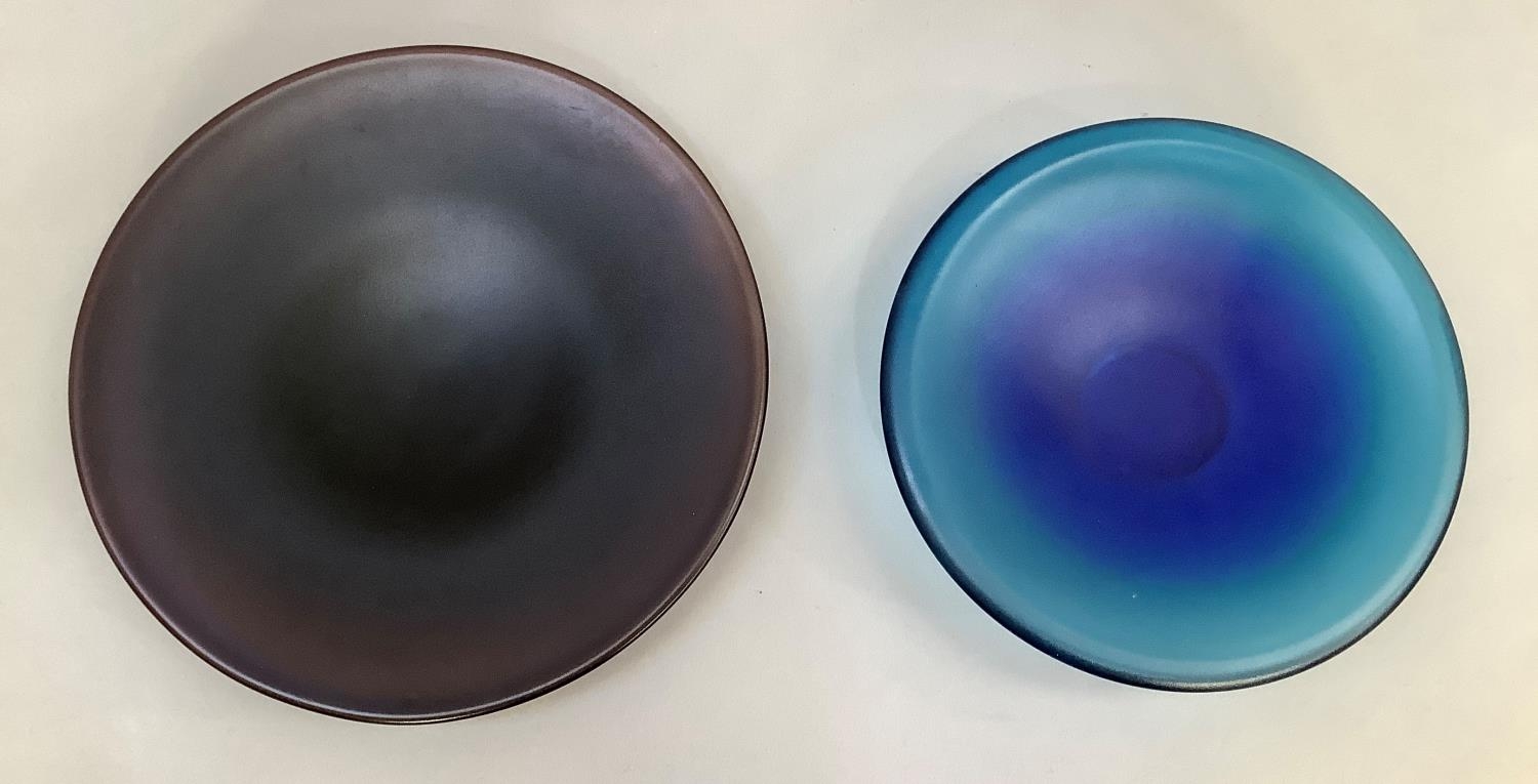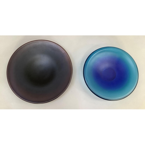 Goran Worff for Kosta Royal Art Collection, A blue acid finished textured glass comport, on pedestal foot, signed and no. G Warff, 26.5cm diameter x 7.5cm high, together with an amethyst glass comport of similar design, 32.5cm x 4.75cm high (2)