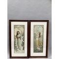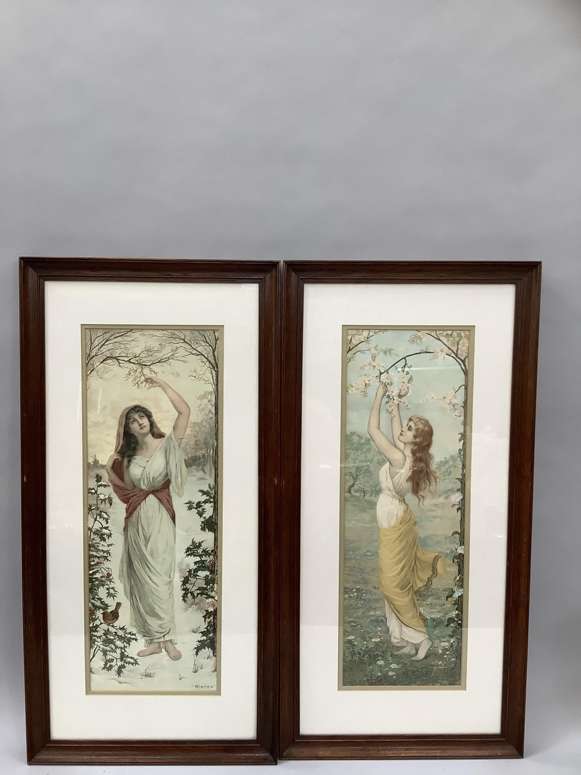 Two chromolithograph portraits, allegorical of Spring and Winter in oak frames, 78cm x 38.5cm overall with frames