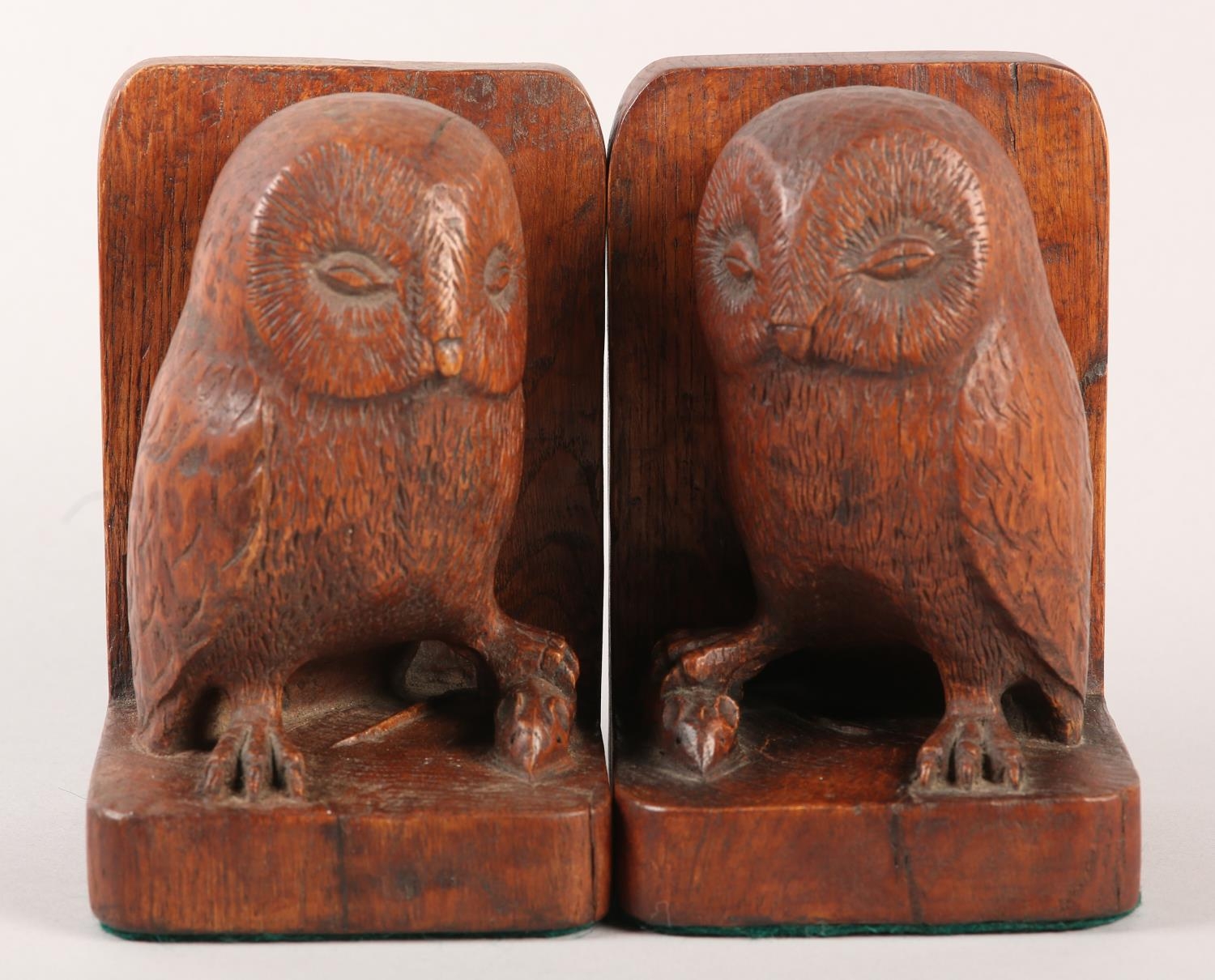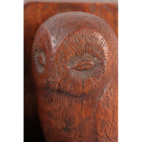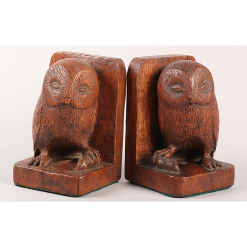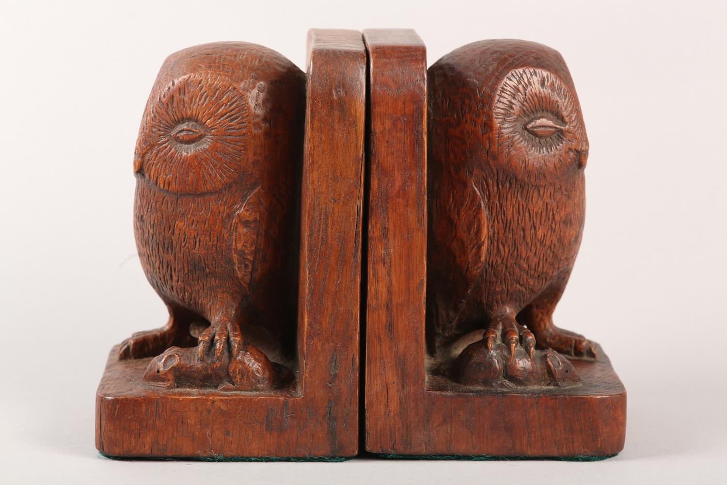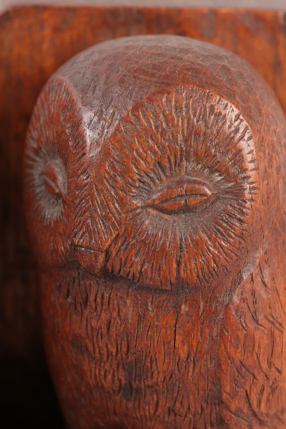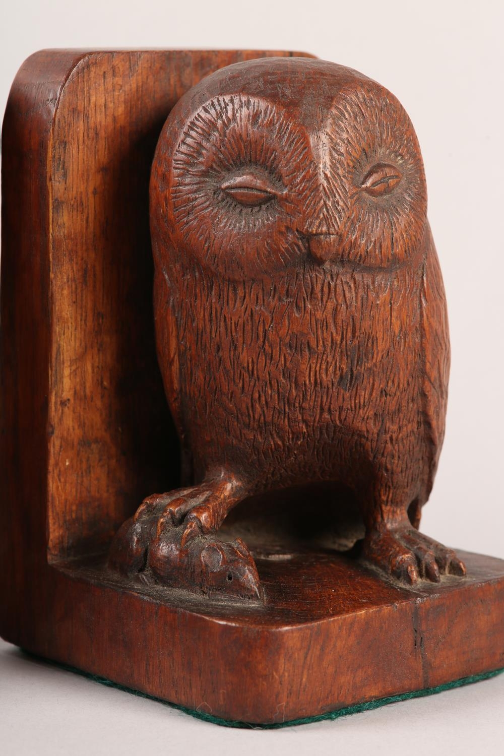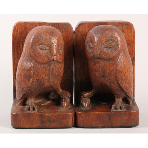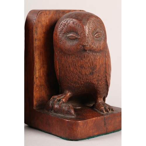 WORKSHOP OF ROBERT 'MOUSEMAN' THOMPSON OF KILBURN, a pair of carved English oak owl bookends, each standing, holding a mouse under it's claw. 17cm high x 11cm wide x 11cm deep