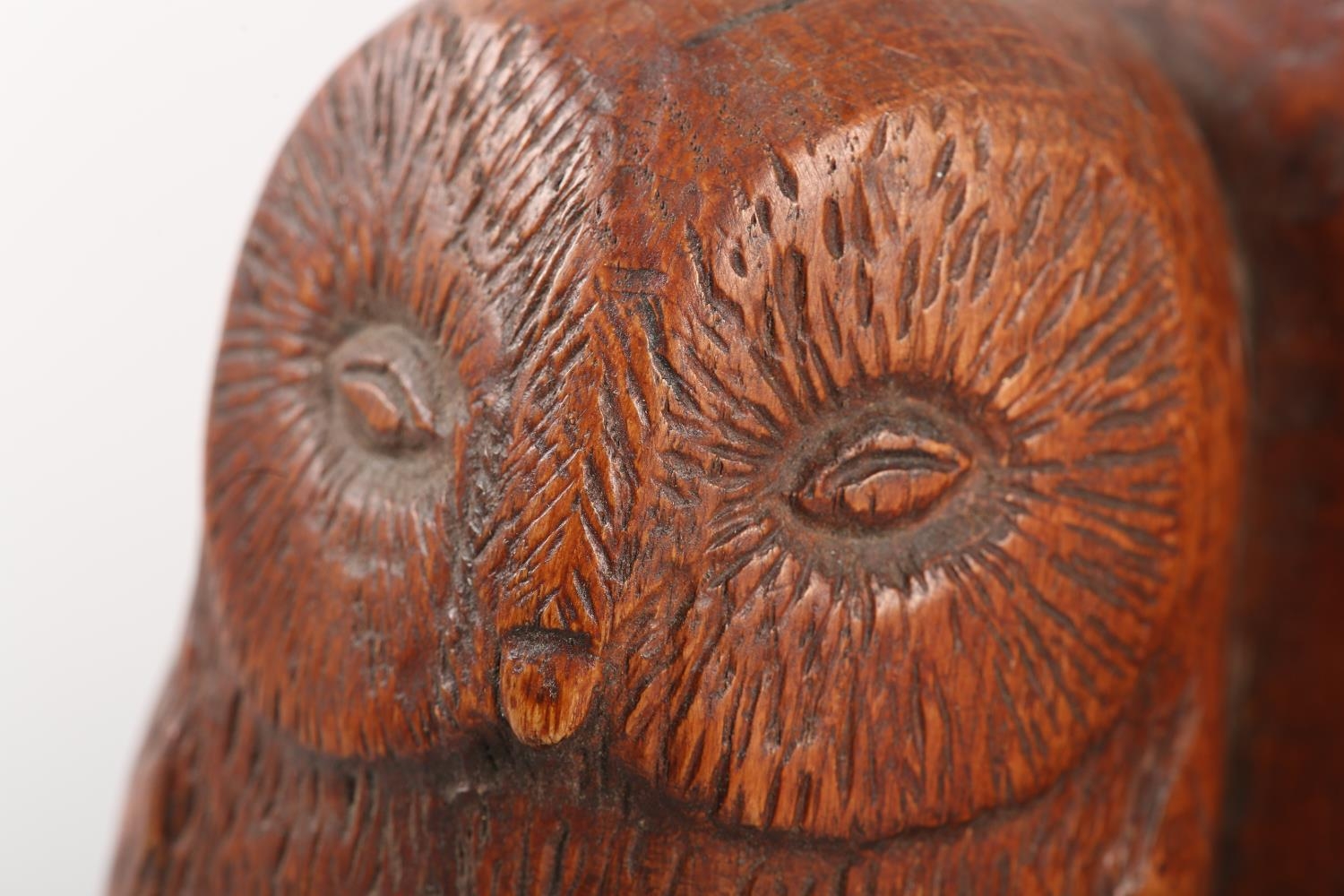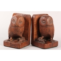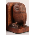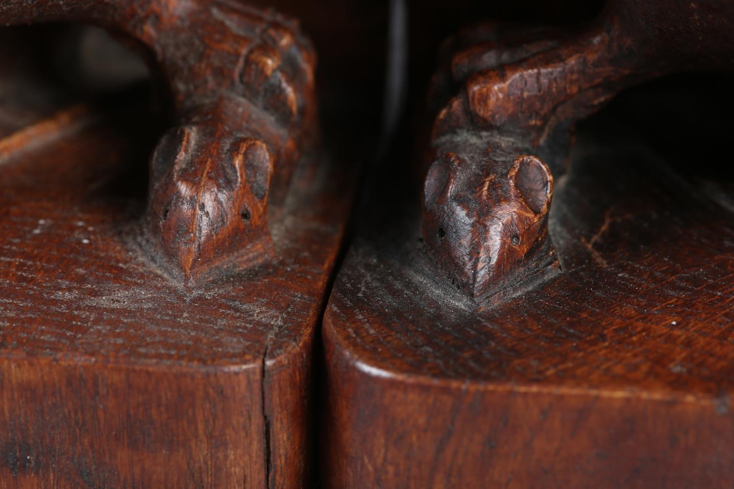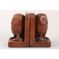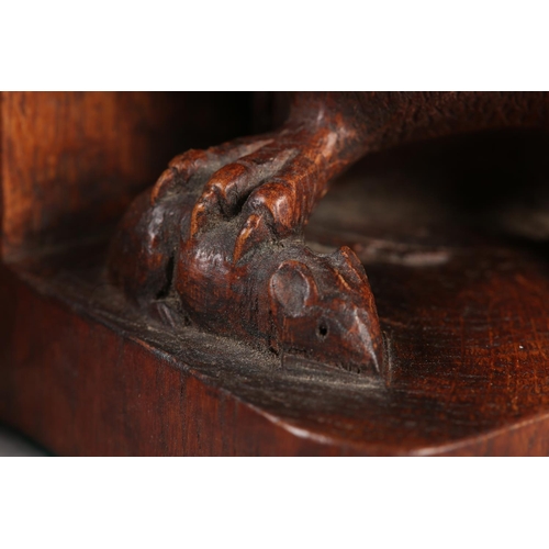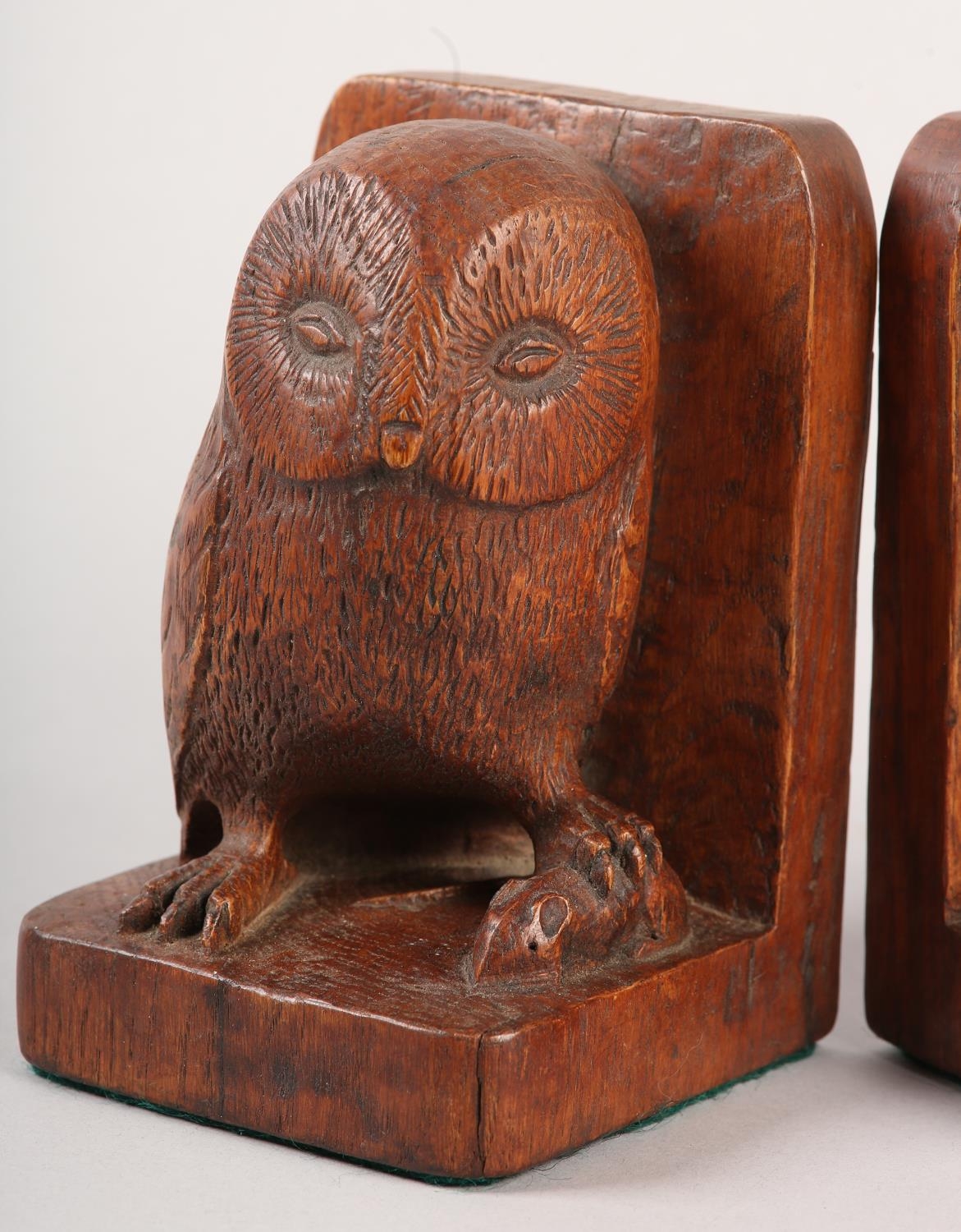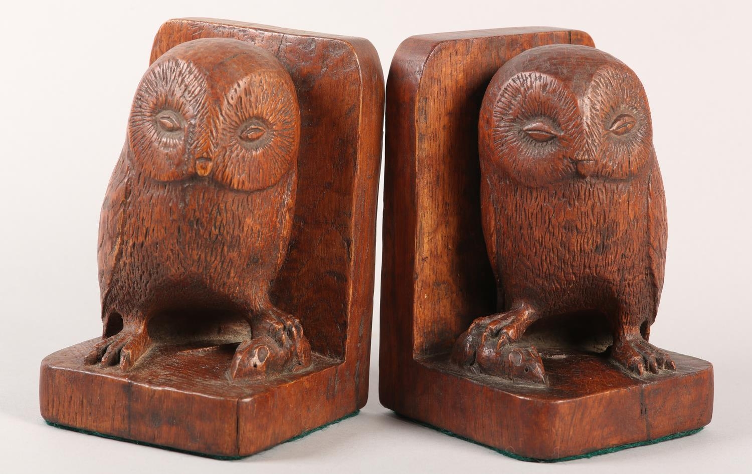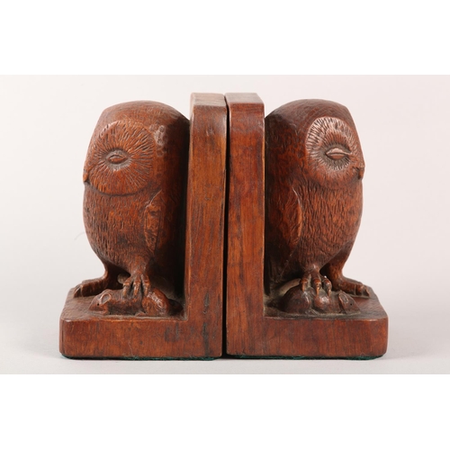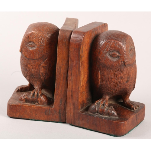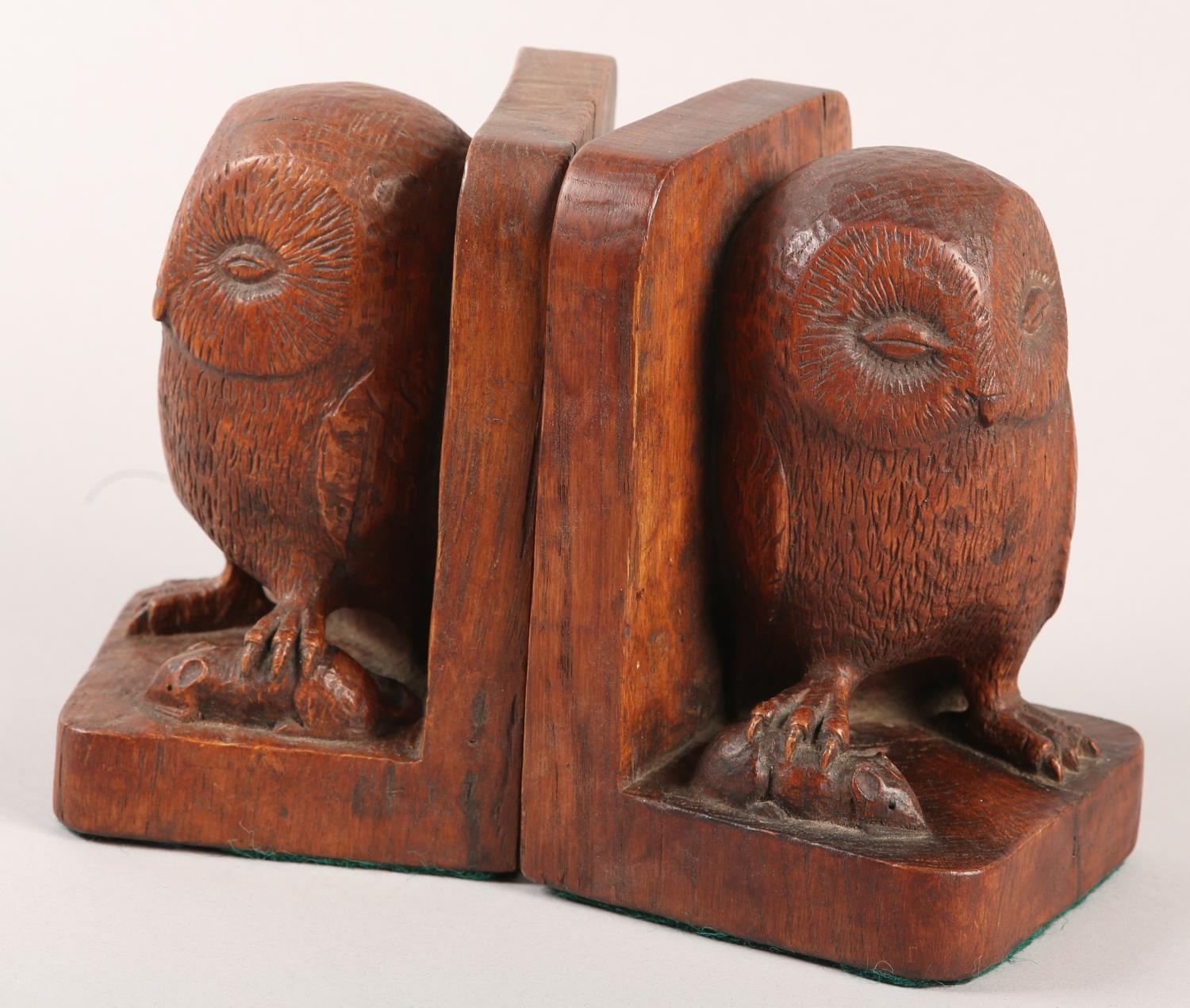 WORKSHOP OF ROBERT 'MOUSEMAN' THOMPSON OF KILBURN, a pair of carved English oak owl bookends, each standing, holding a mouse under it's claw. 17cm high x 11cm wide x 11cm deep