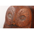 The upright has a thin crack on the right hand corner approximately 6cm vertical. Couple of old dents on the back face of the upright. Left hand side has a full length thin crack in the depth of the back. There is a closed line or crack vertical on front edge of the base. There is a crack on the right hand corner of the front edge of the base. There is a fine crack running with the radials on the top of the owl's head, 5cm.