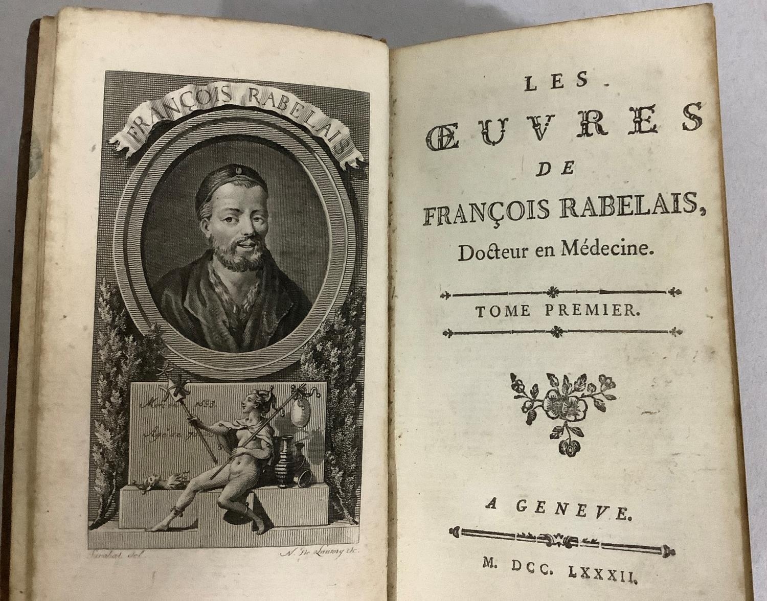 RABELAIS, FRANCOIS - OEUVRES DE RABELAIS DOCTEUR EN MEDECINE, pub. Genève 1782, vols 1, 3 and 4, full calf; together with D'Heister, L. - L'Anatomie D'Heister avec des Essais de Physique vol III only new ed. pub. 1753 pub Vincent, Paris, all fold-out illus. present, full calf
