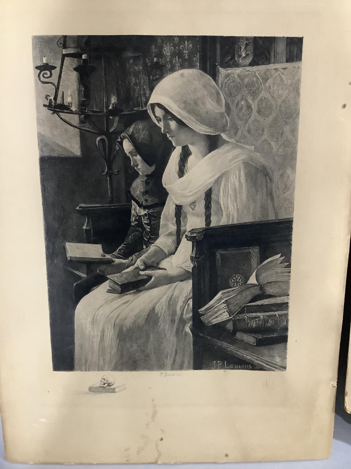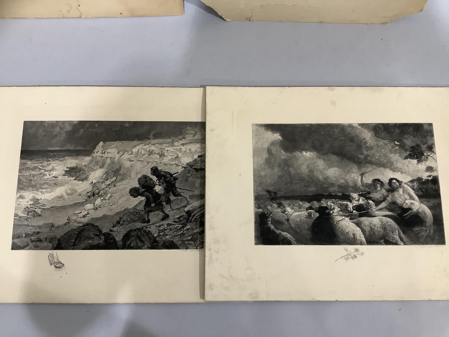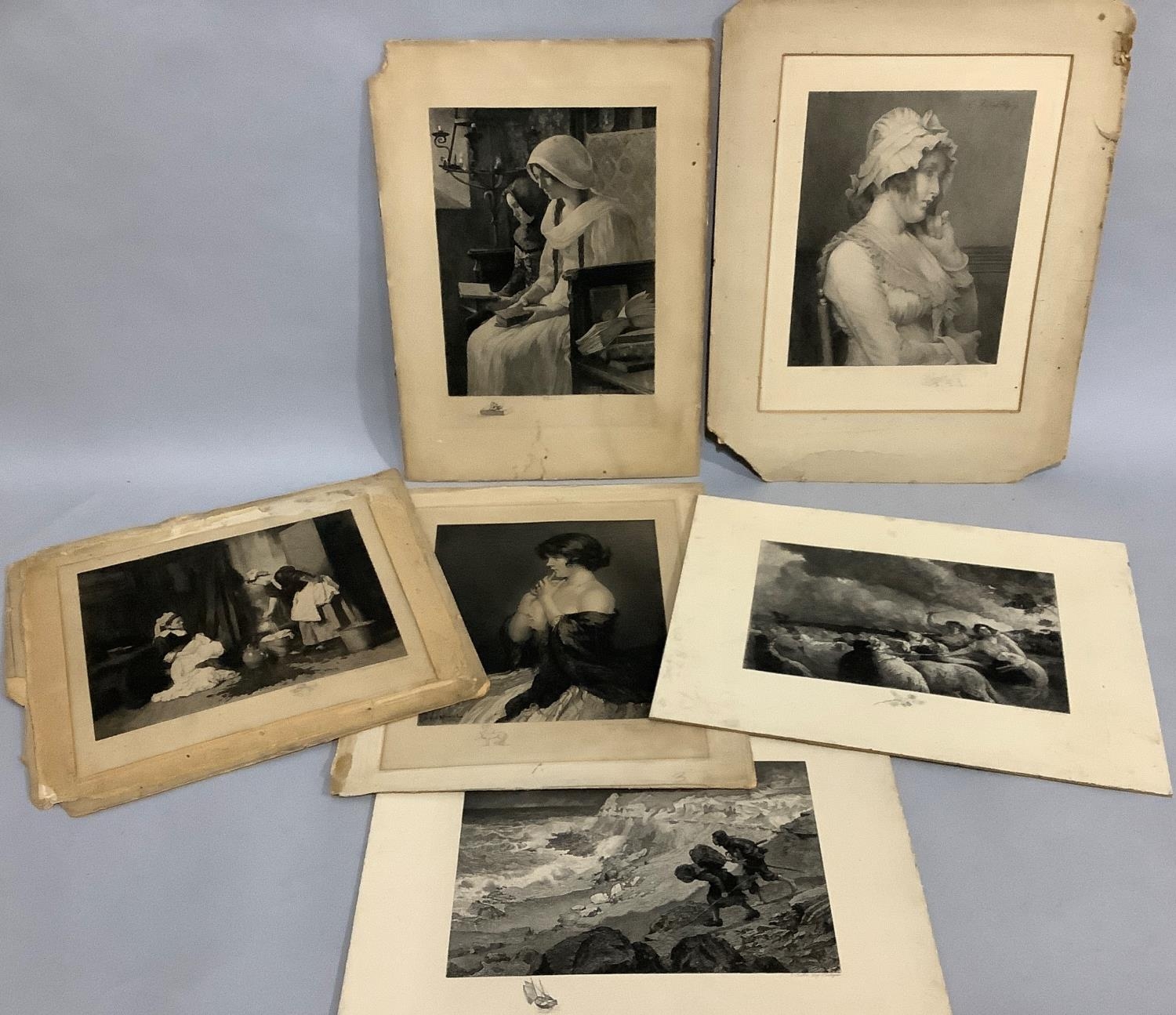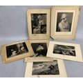 Six various late nineteenth and twentieth century engravings, three being portraits of women, coastal landscape, shepherd and shepherdess with flock, and an interior scene, all with original mounts but unframed