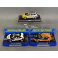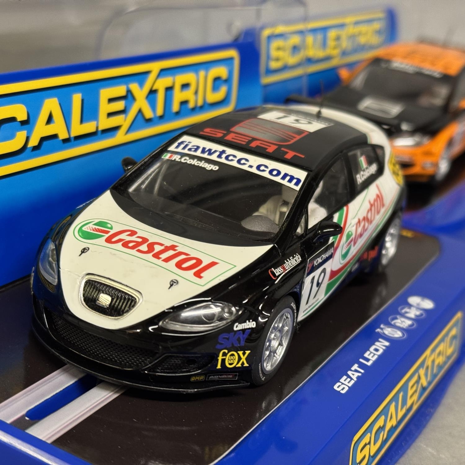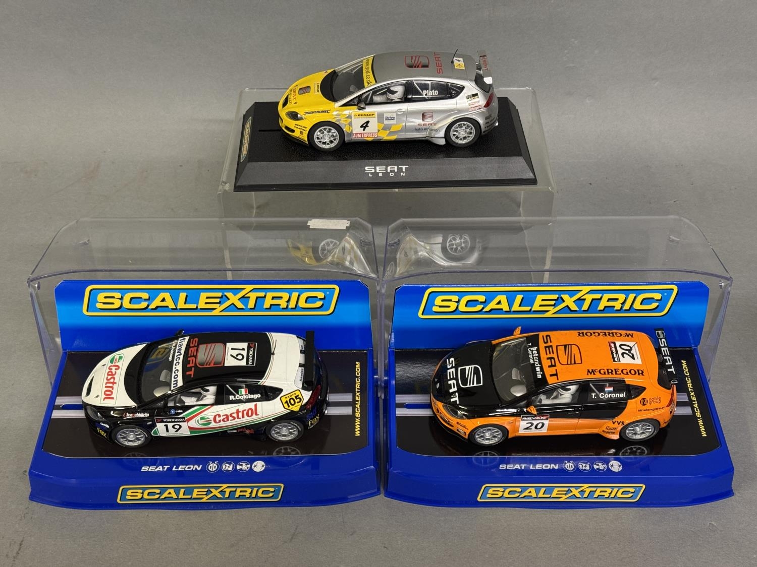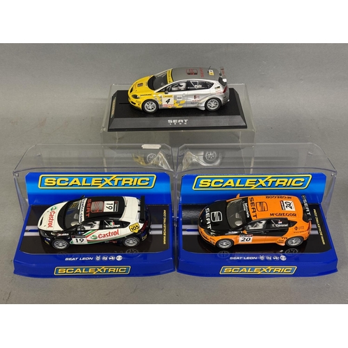 Three Scalextric BTCC model cars, including a R Colciago Castrol Seat Leon, a T Coronel Seat Leon and a J Plato Seat Leon, all boxed