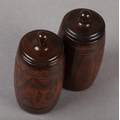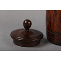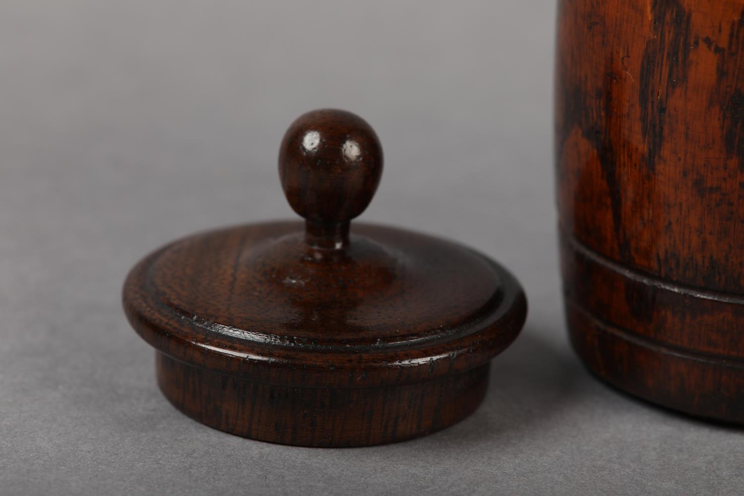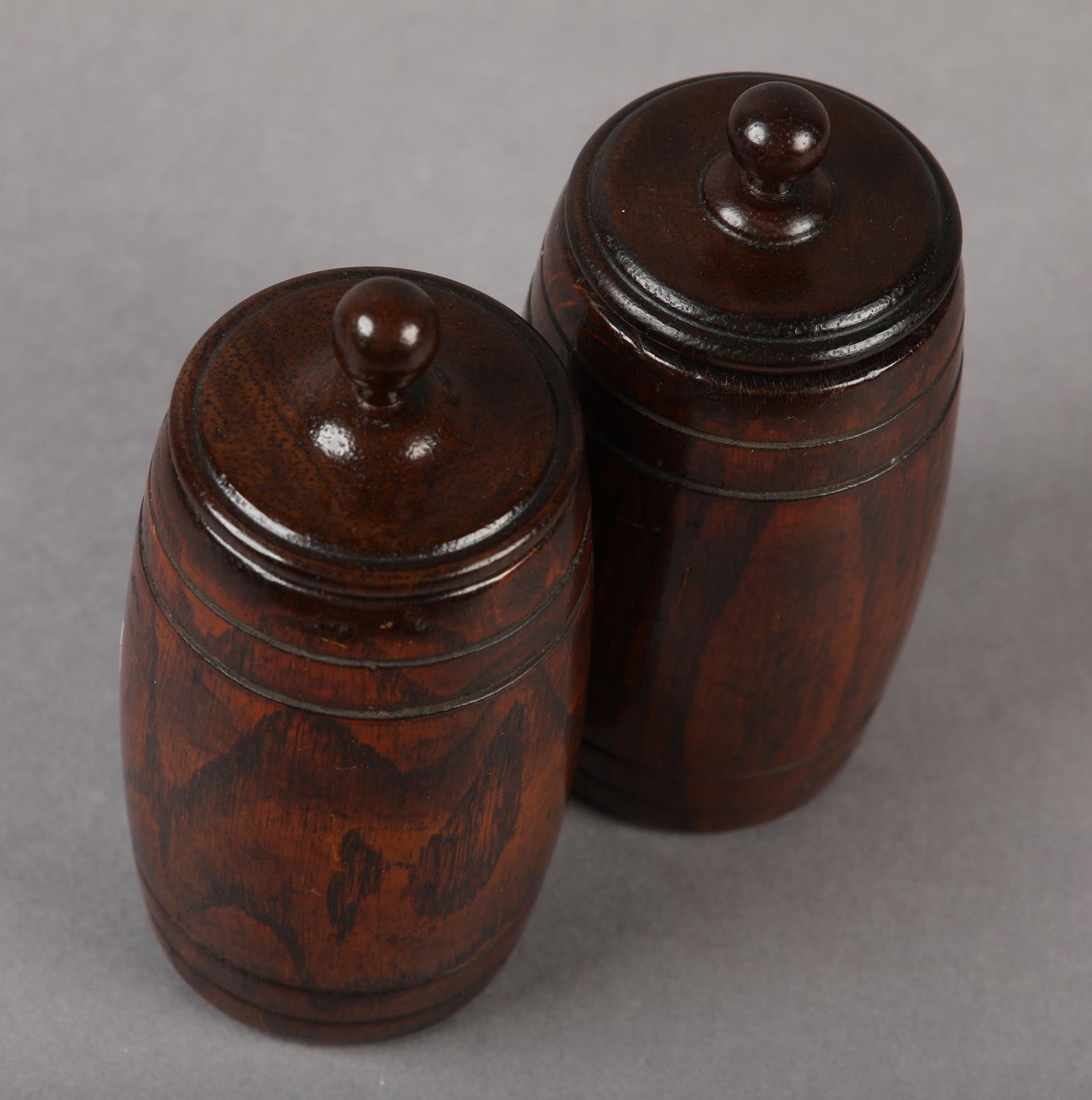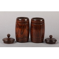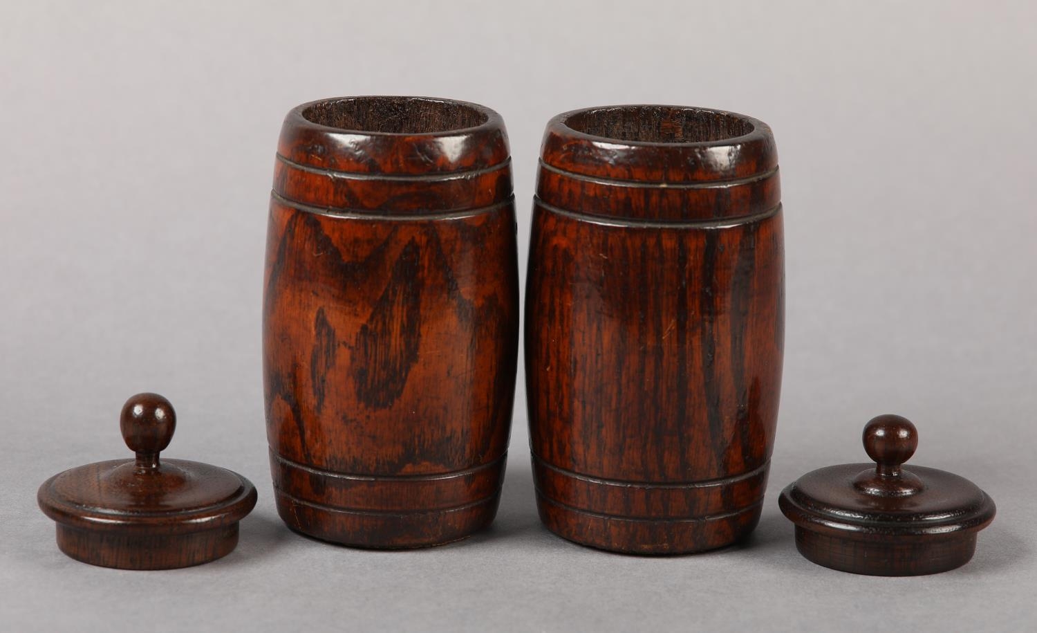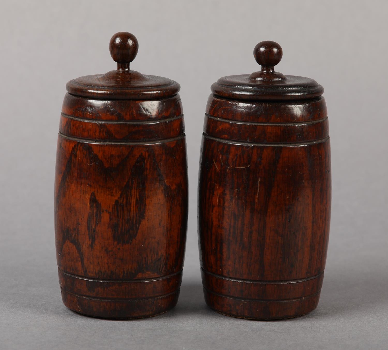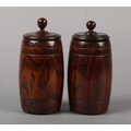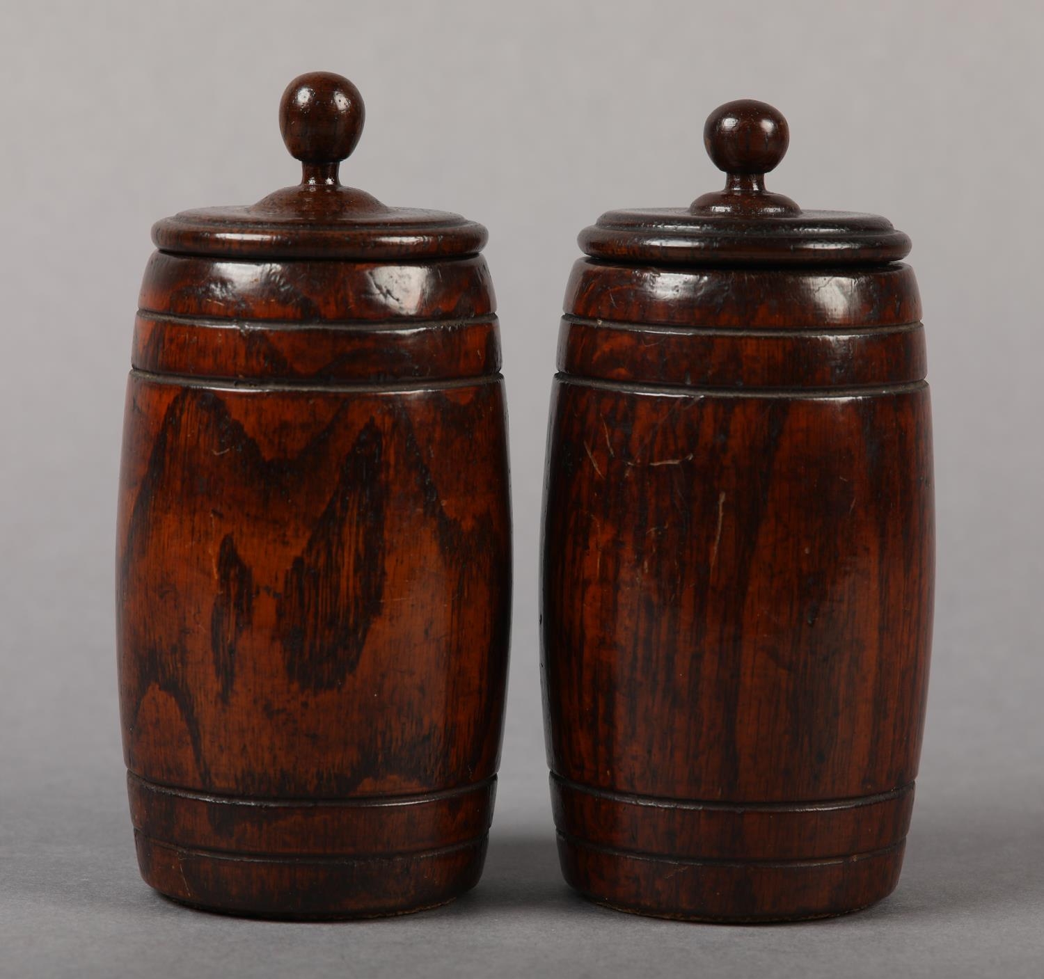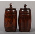 TWO LATE VICTORIAN TURNED ELM SPICE BARRELS AND COVERS with knop finials, 12.5cm high