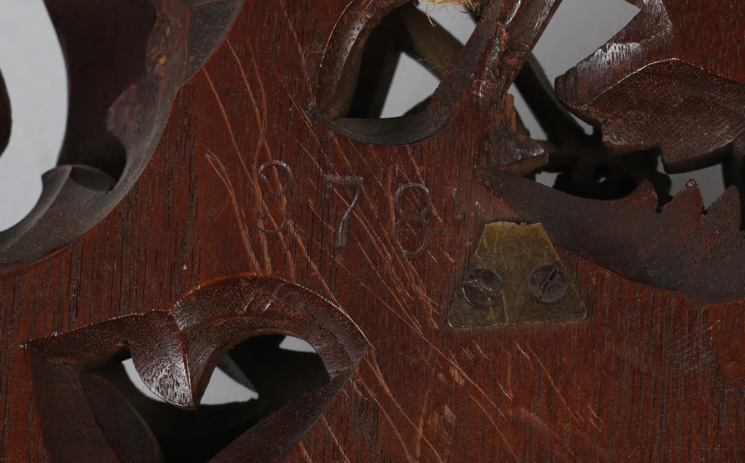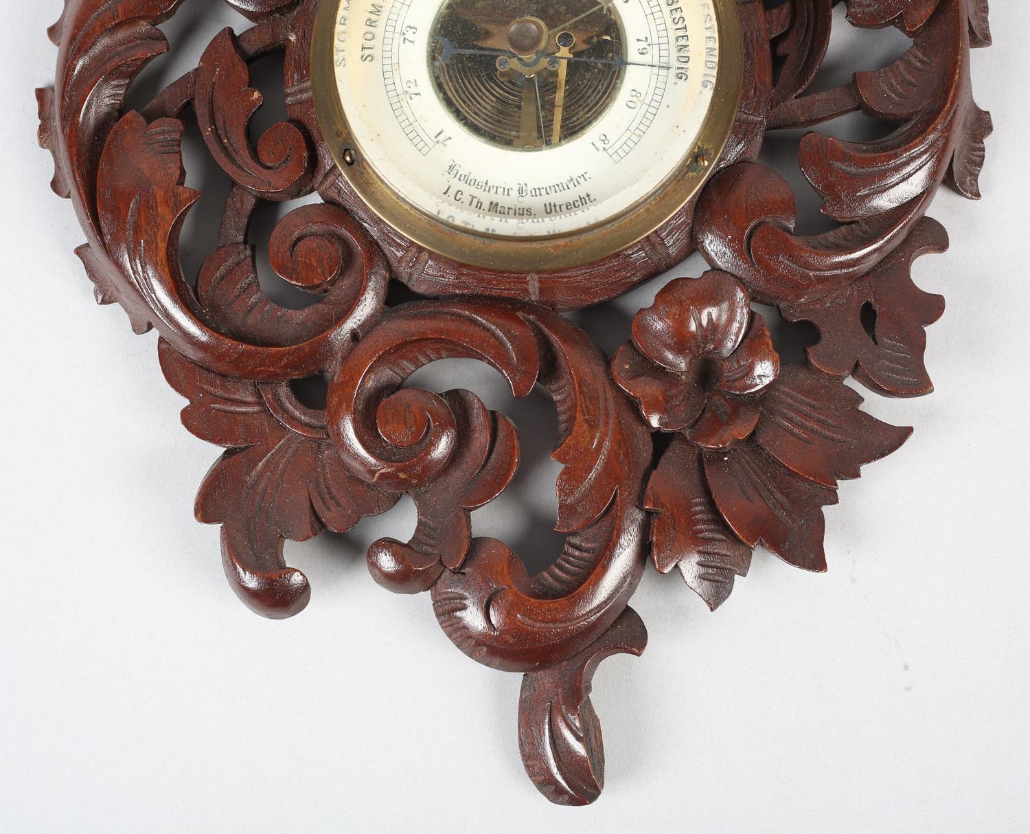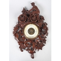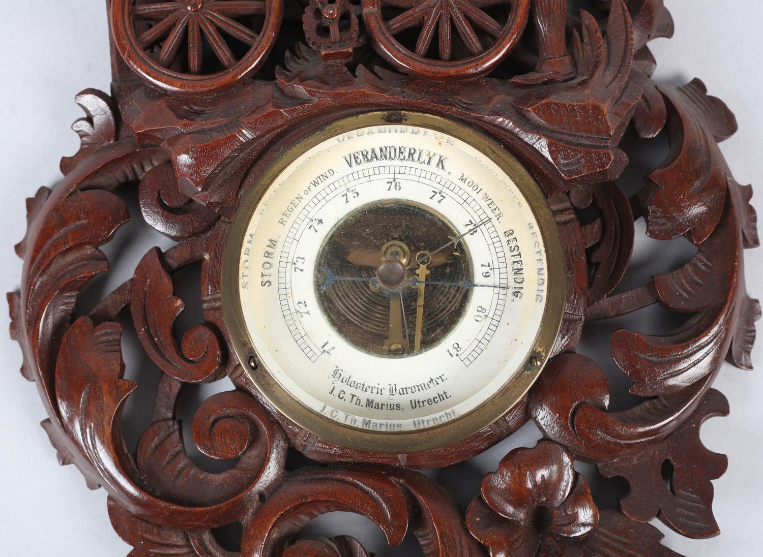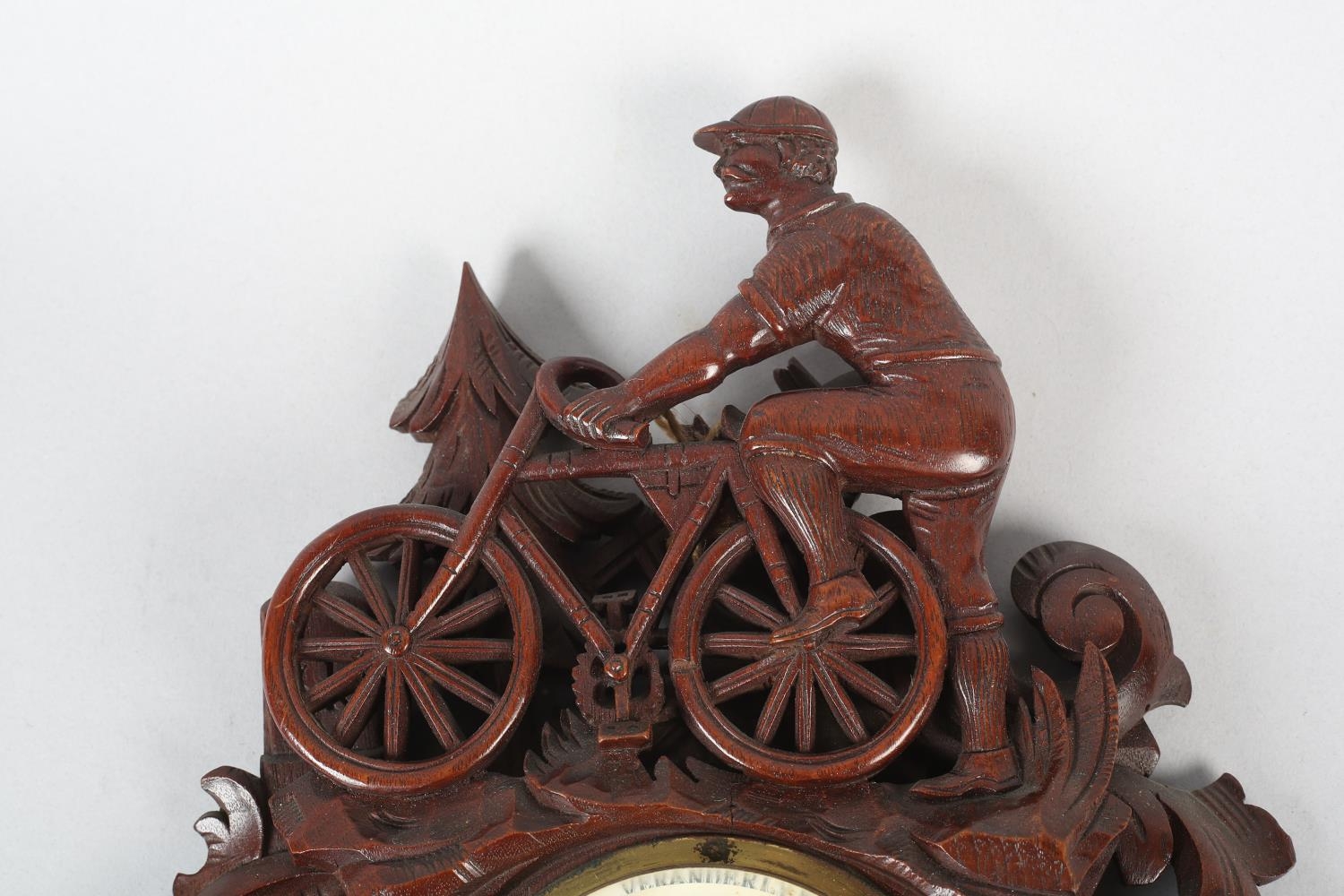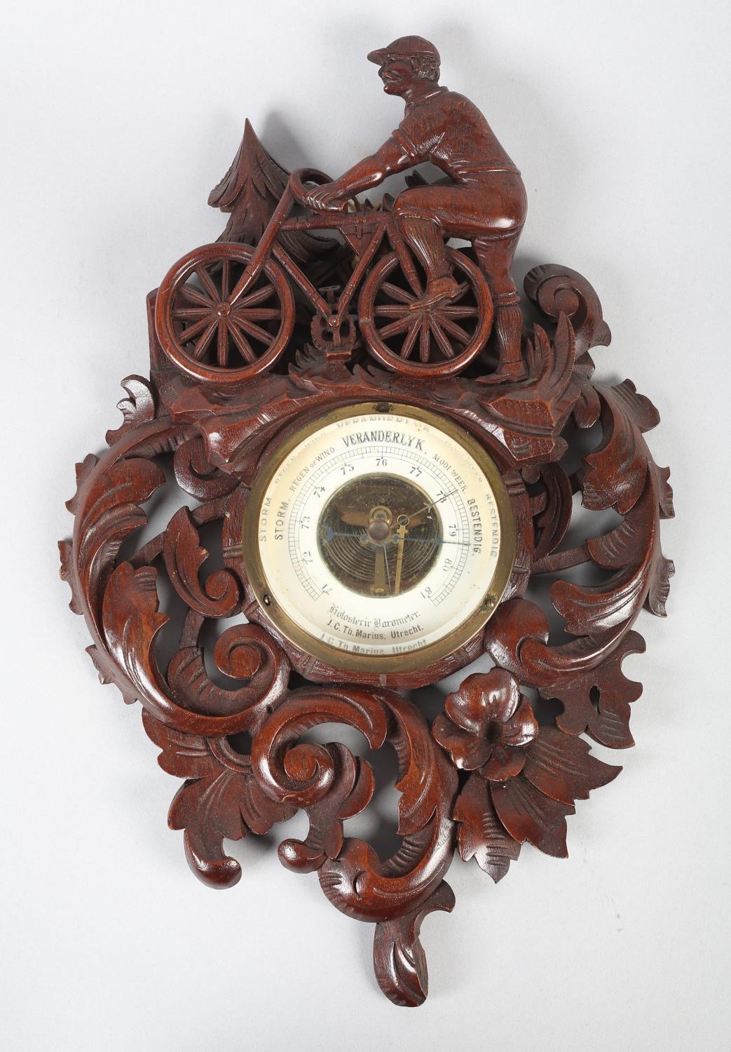 A GERMAN BLACK FOREST CARVED CYCLIST'S BAROMETER, the instrument signed to the dial Vanderlyk Holosterie Barometer J C Th Marius Utrecht, held in a foliate carved frame surmounted with a cyclist and bicycle, stamped no. 378 to back, 39cm high x 25cm wide