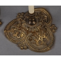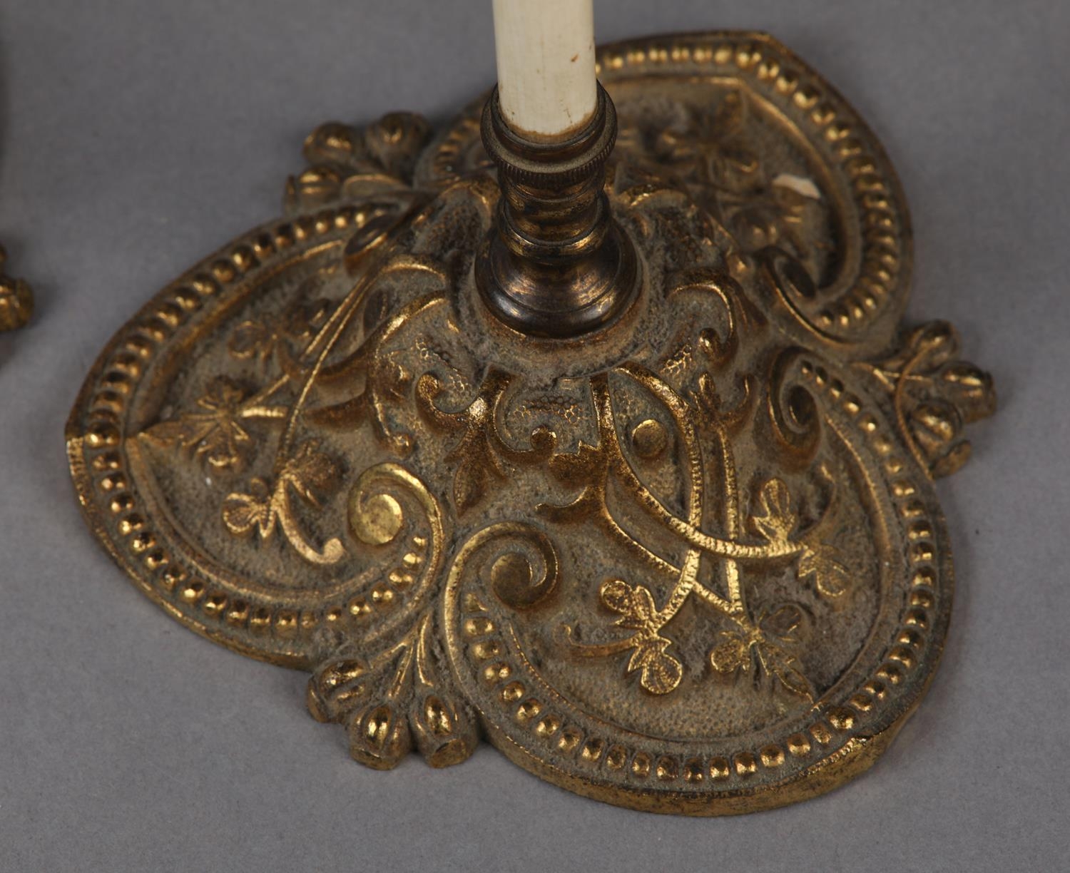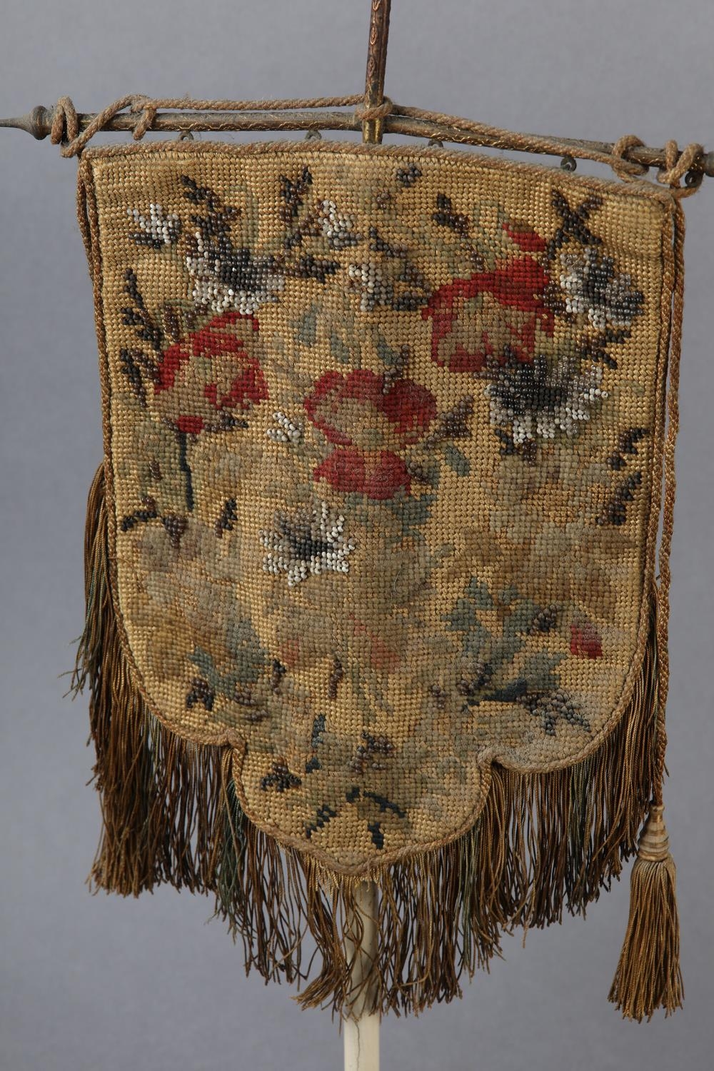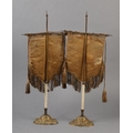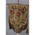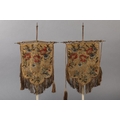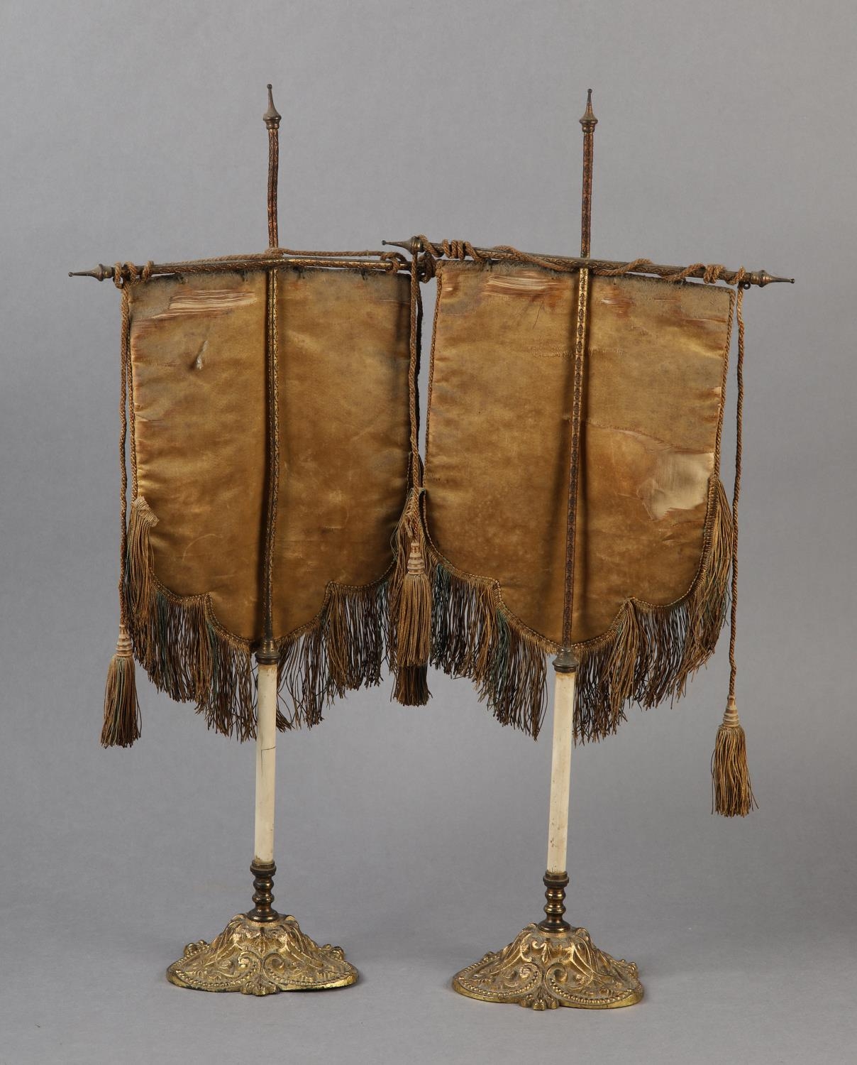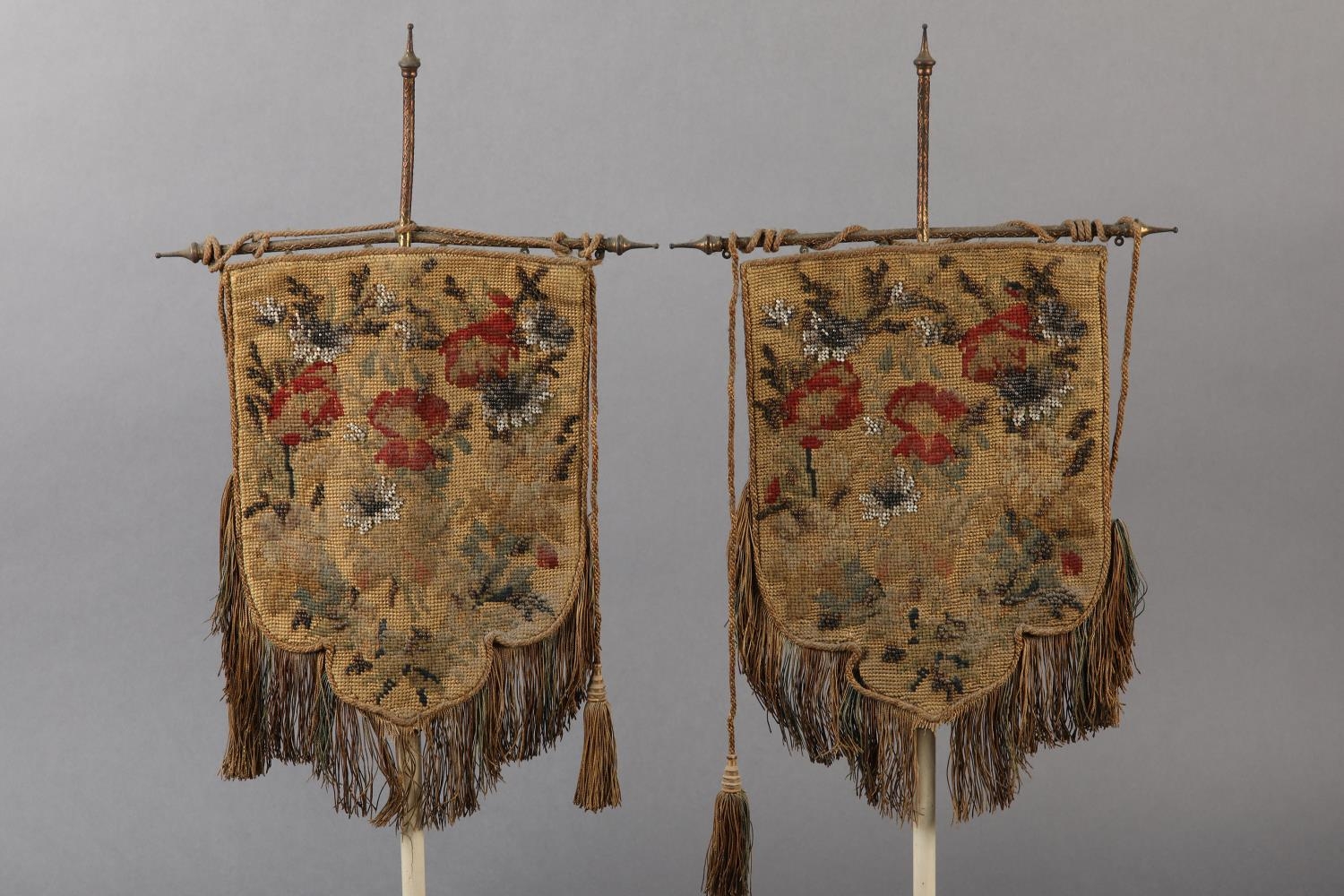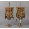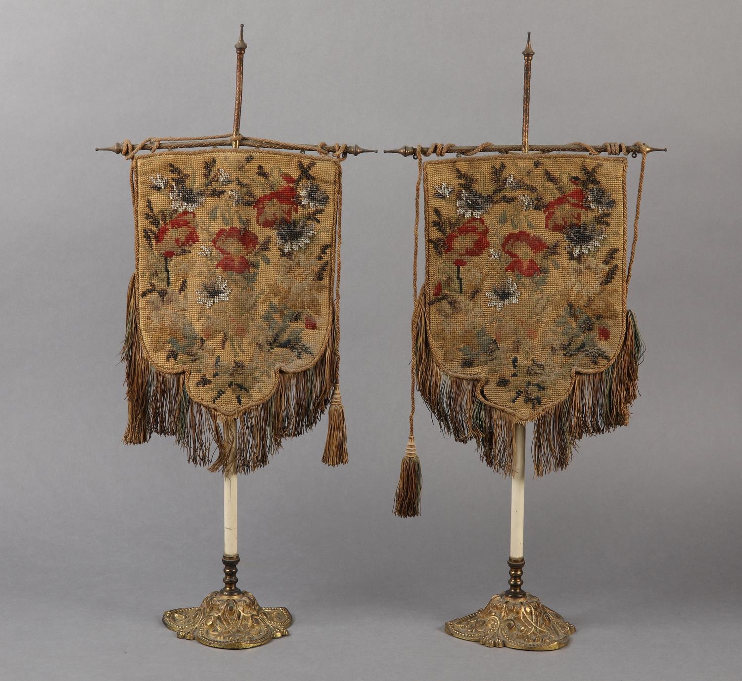 A PAIR OF VICTORIAN GILDED CAST METAL FACE FANS each hung with a shield shape floral needlework banner with fringe and tassels, 53cm high