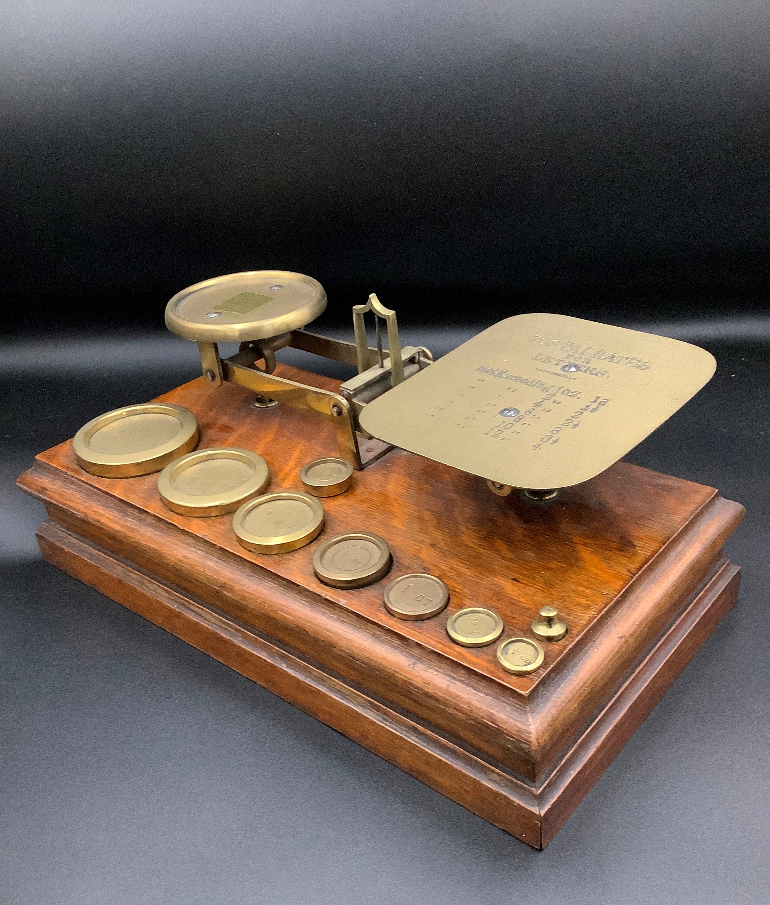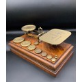 A LATE VICTORIAN SET OF OAK AND BRASS POSTAL SCALES and eight weights (some associated)