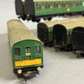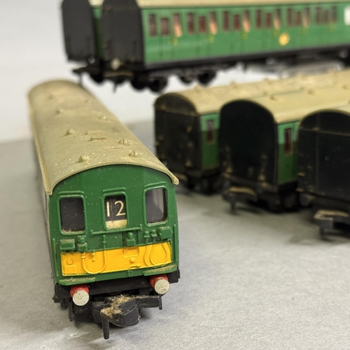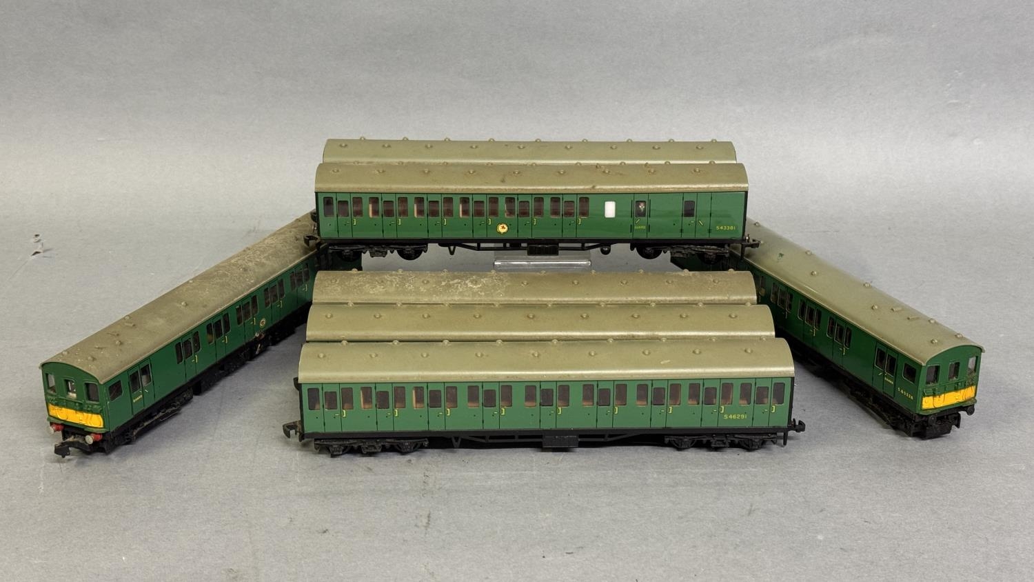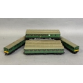 Two Hornby Dublo 3250 Suburban Motor Coaches, along with Five 4150 Trailing Cars