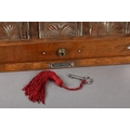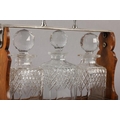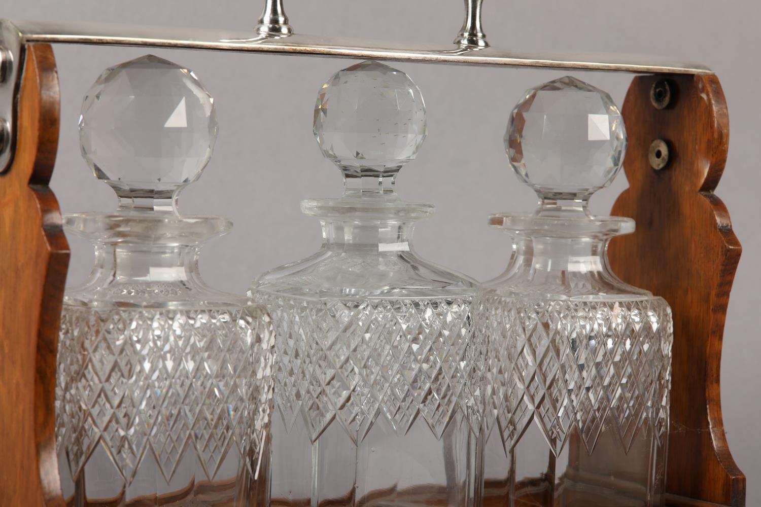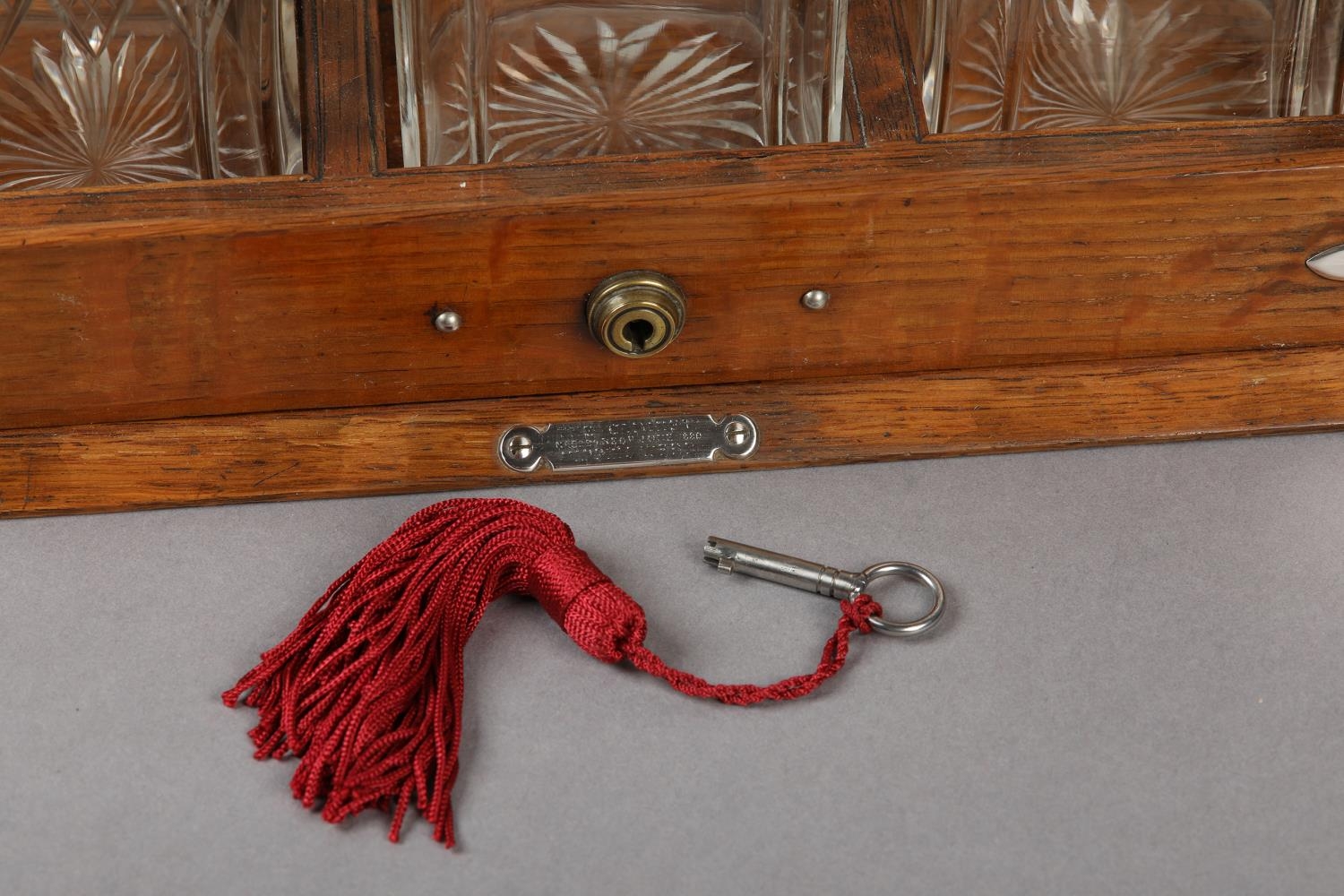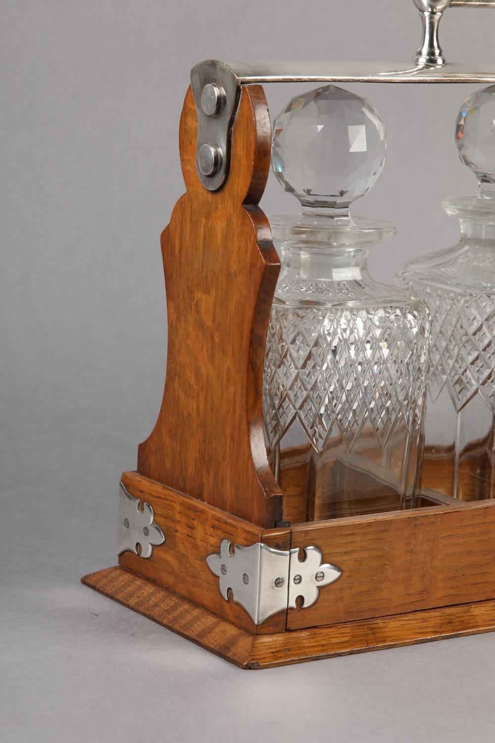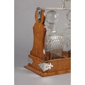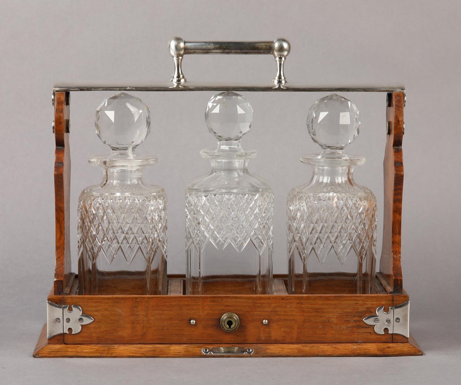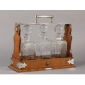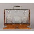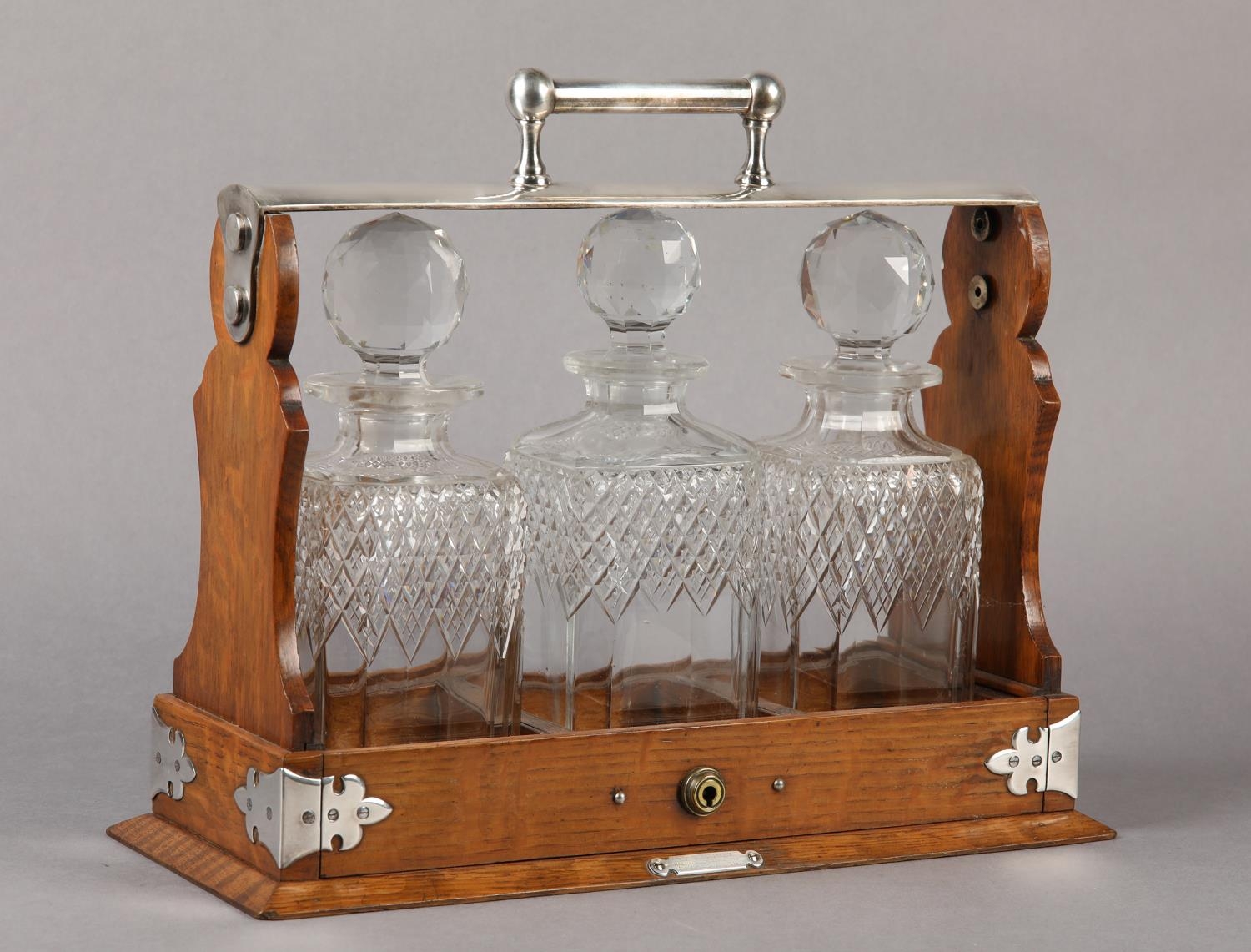 AN EDWARD VII SILVER PLATE MOUNTED OAK TANTALUS 'The Cabinet' by Mappin & Webb, c.1880, fitted with three cut glass decanters, with key, Mappin & Webb decal, 28.5cm high x 34cm wide