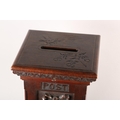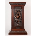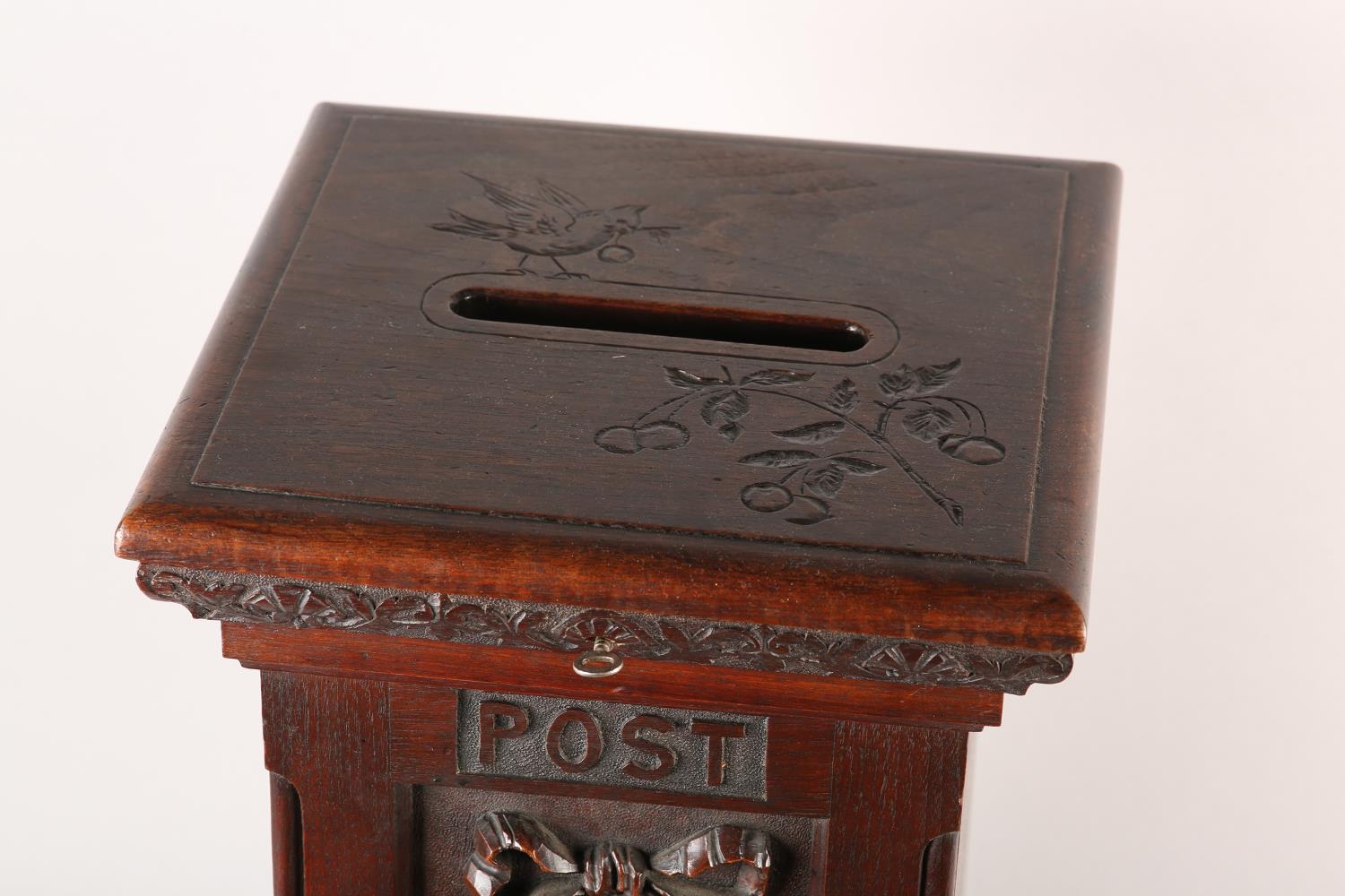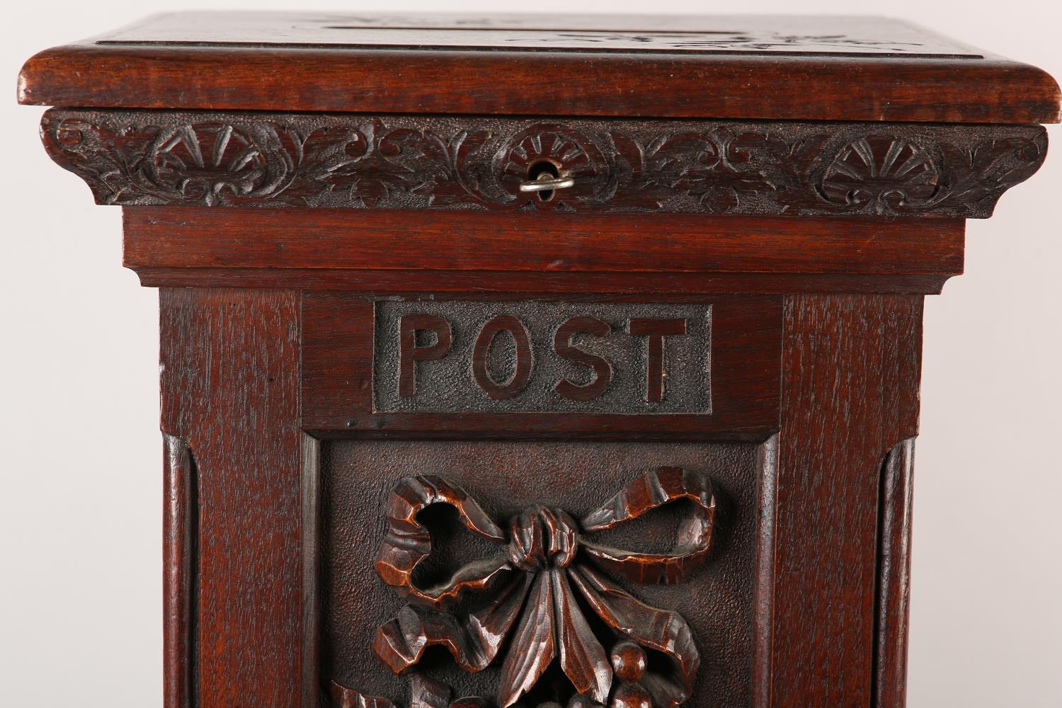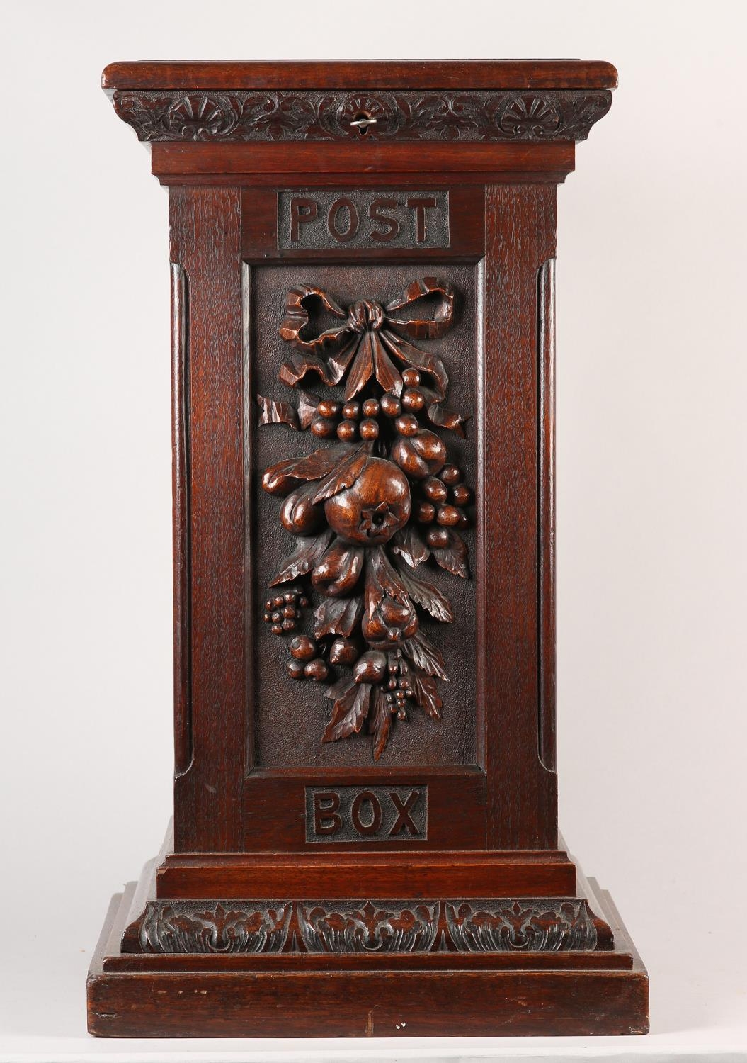 A VICTORIAN STYLE OAK COUNTRY HOUSE LETTER BOX, of square outline, the hinged lid with slot, the front carved in high relief with ribbon tied pendant fruit, between the words Post and Box, stiff leaf carved and stepped base, 33cm square, 62cm high (constructed from period timbers)