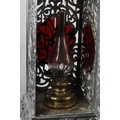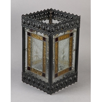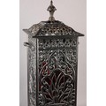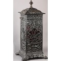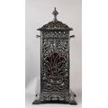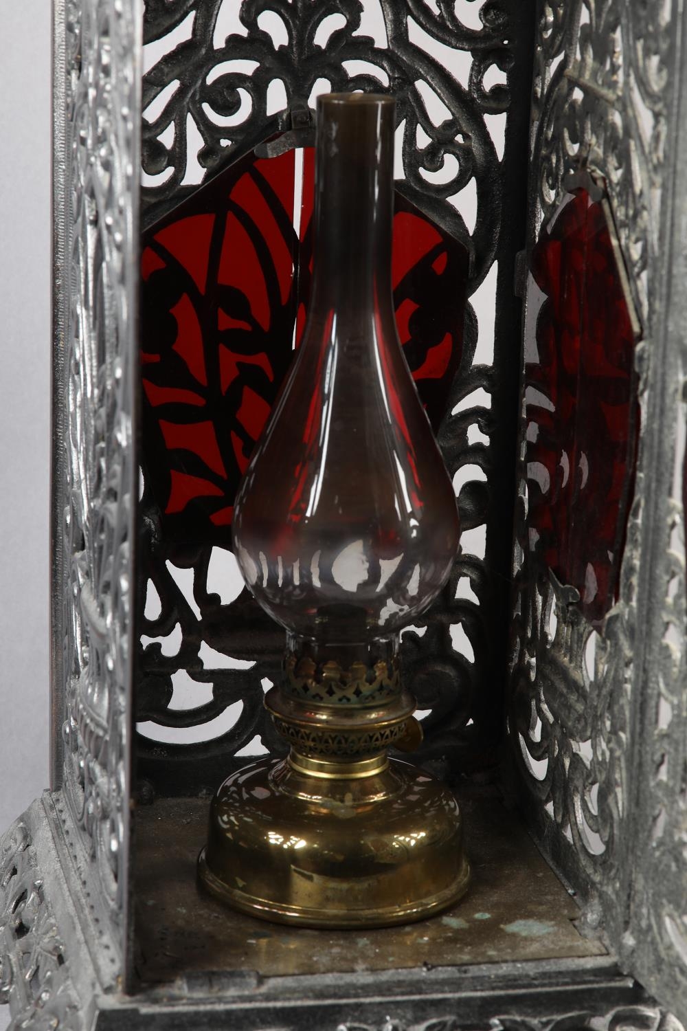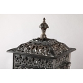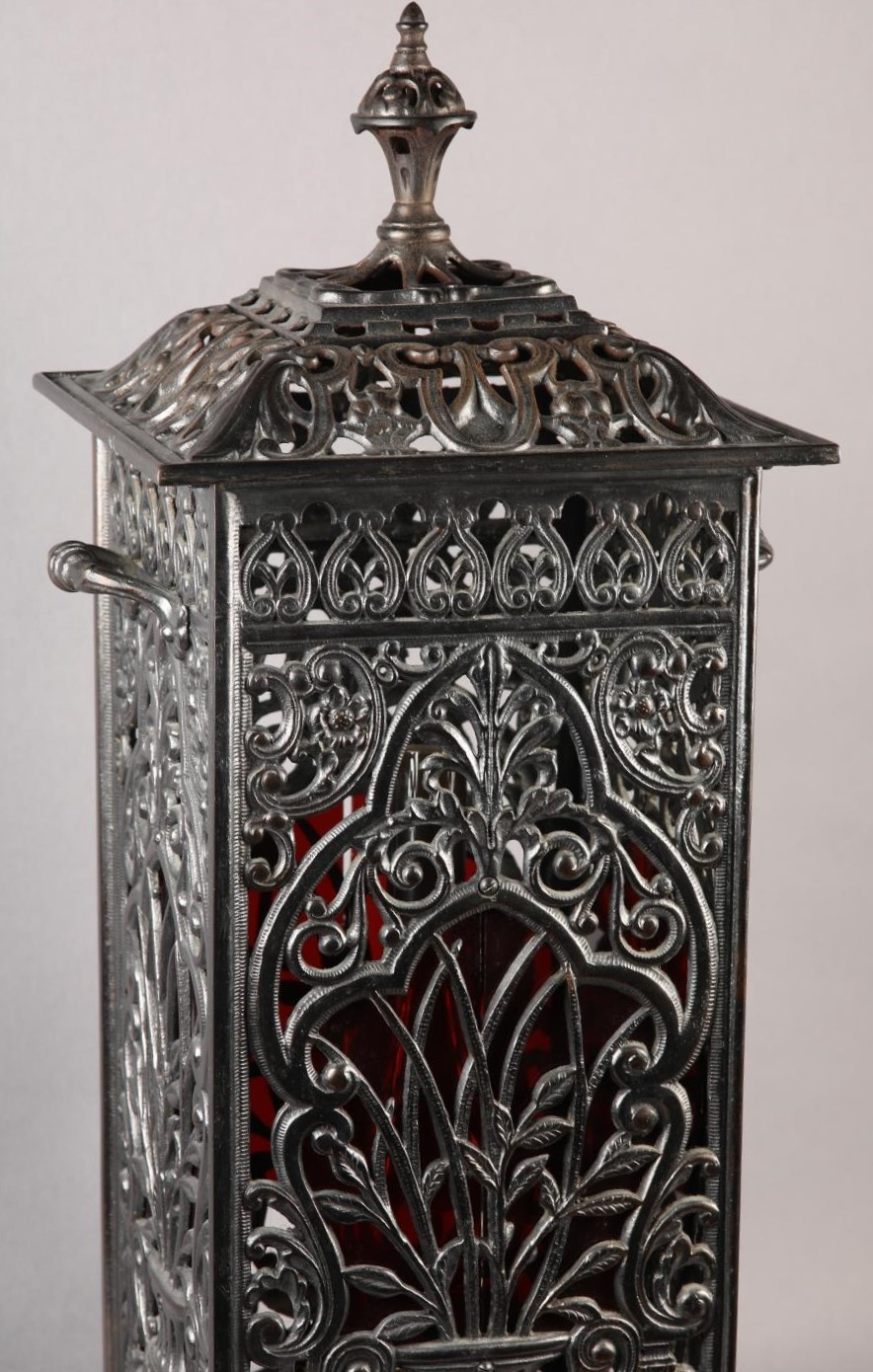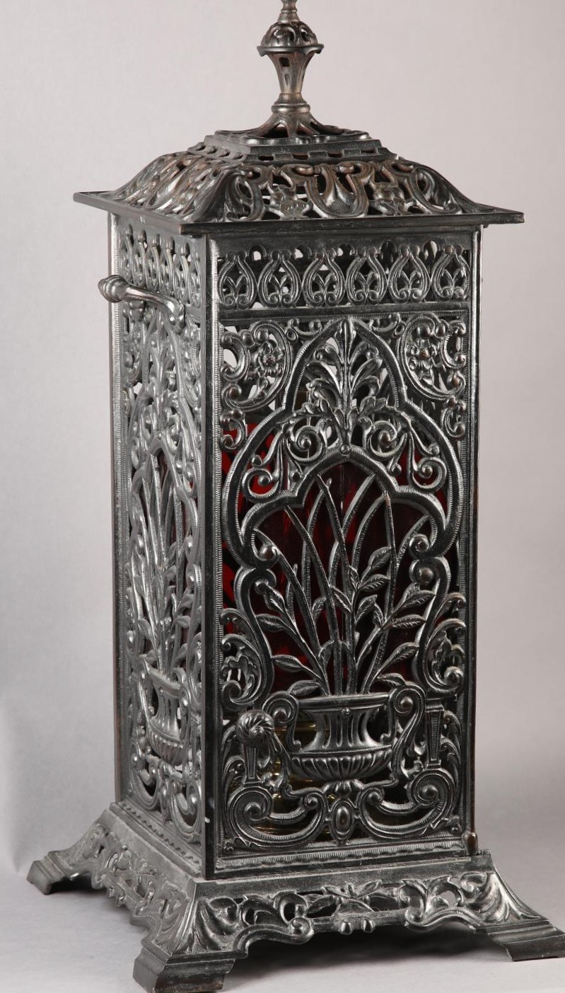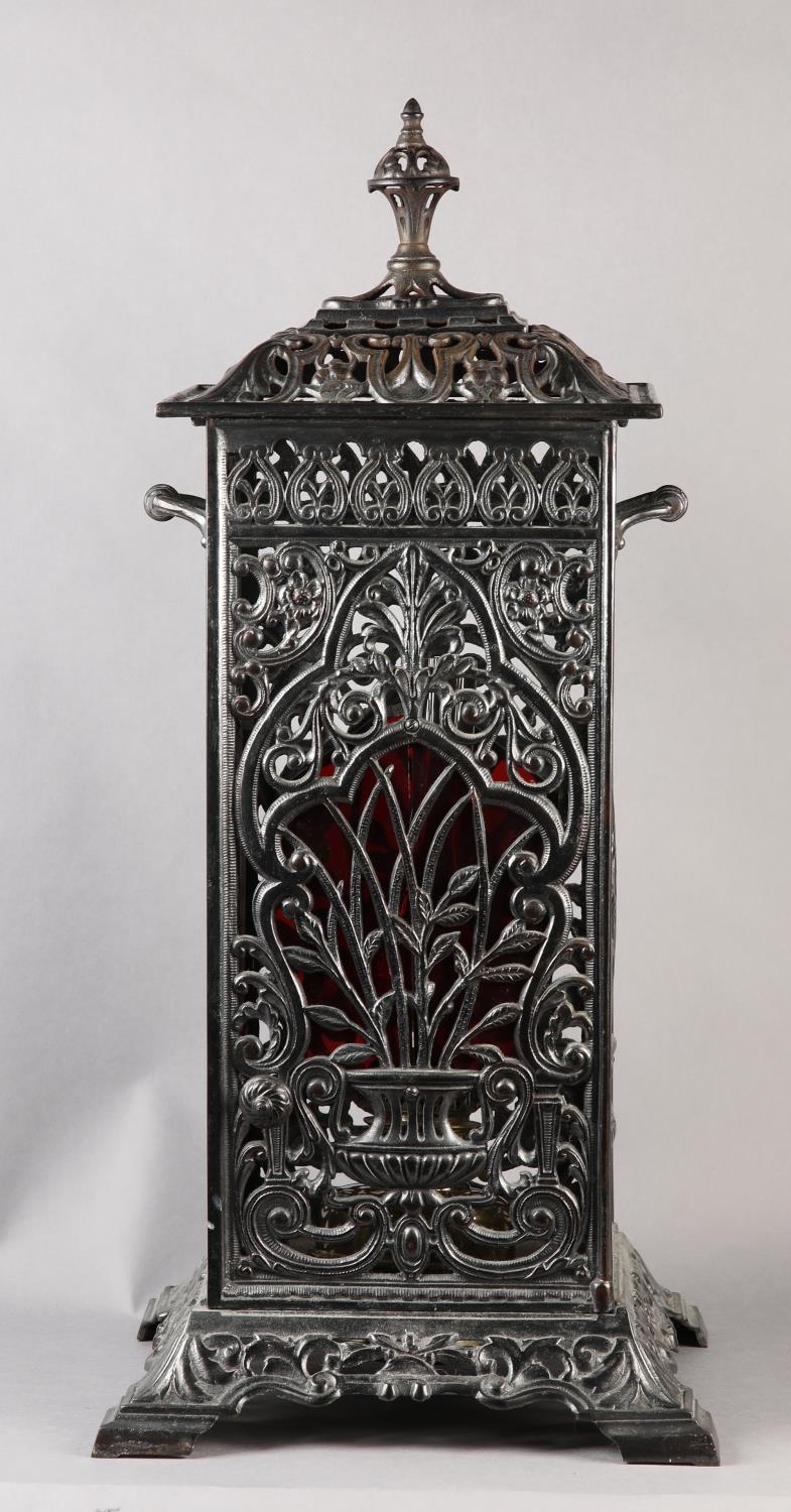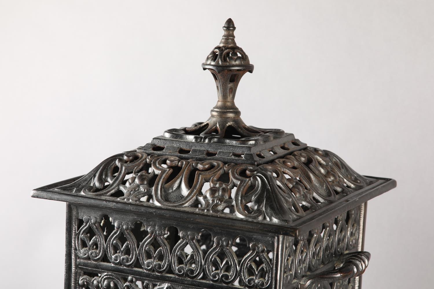 A VICTORIAN CAST IRON CONSERVATORY HEATER pierced with urns of flowers to each side, domed cover with finial, on splayed apron with basket feet, complete with brass oil lamp fitted to interior, 36cm square x 76cm high