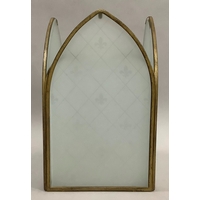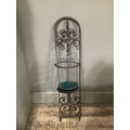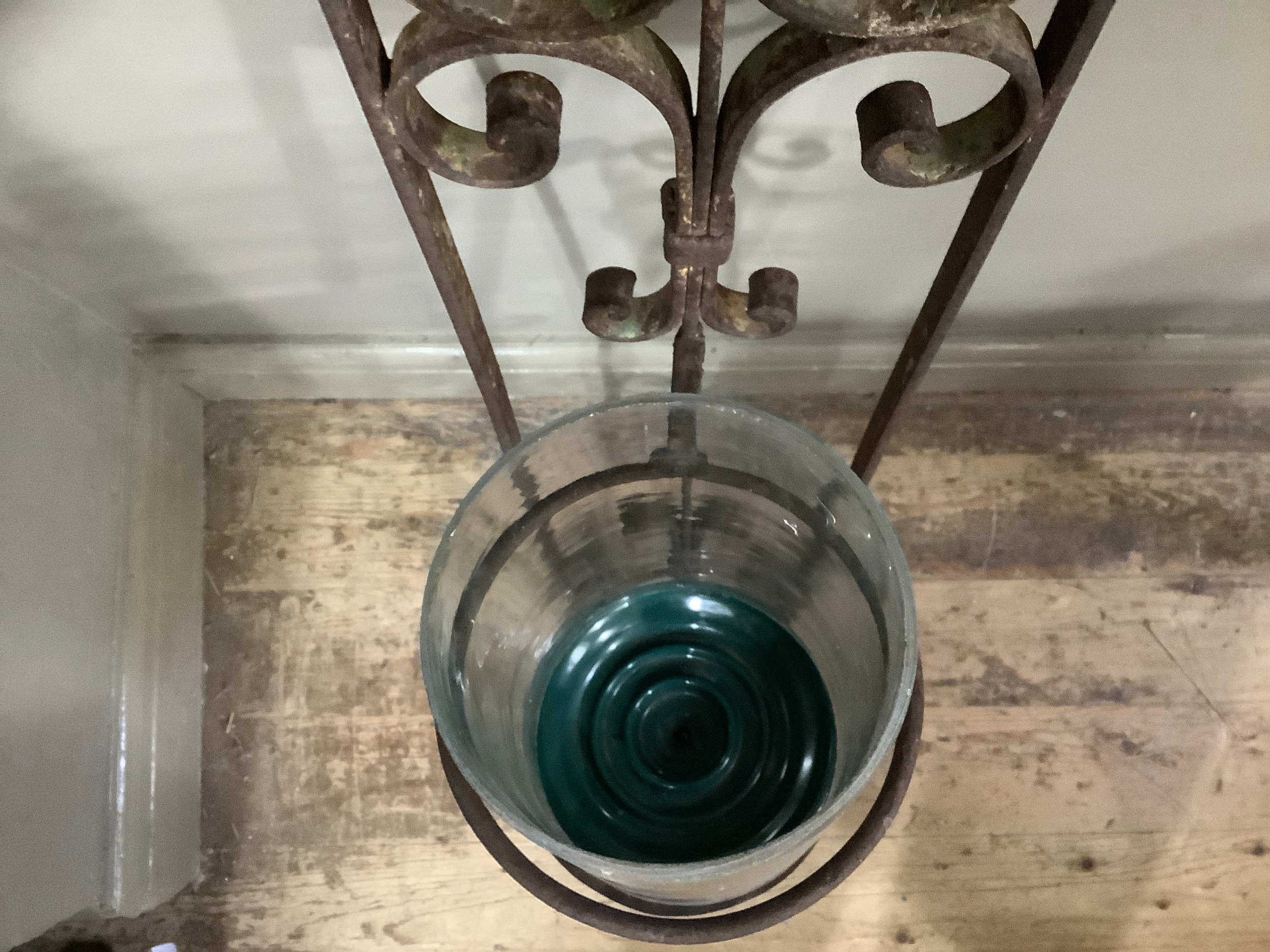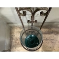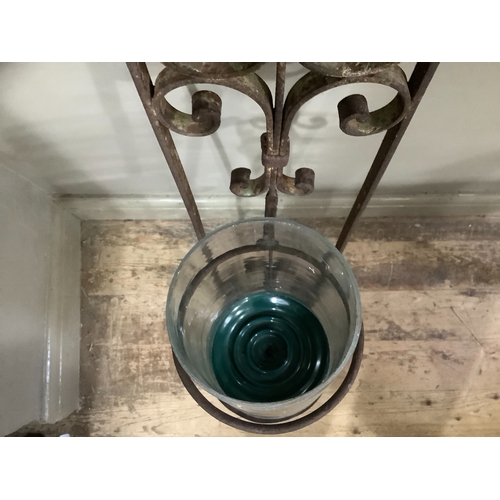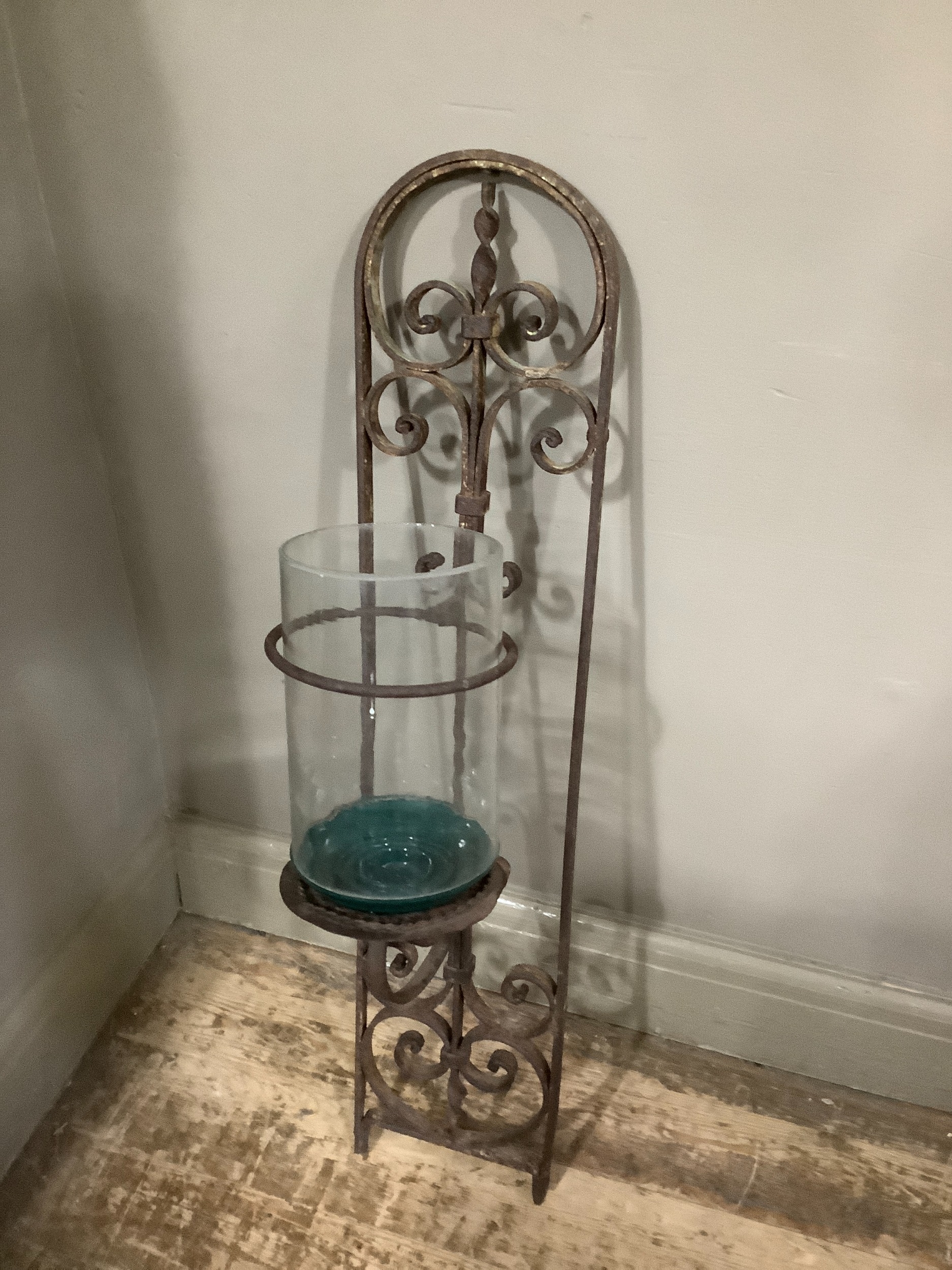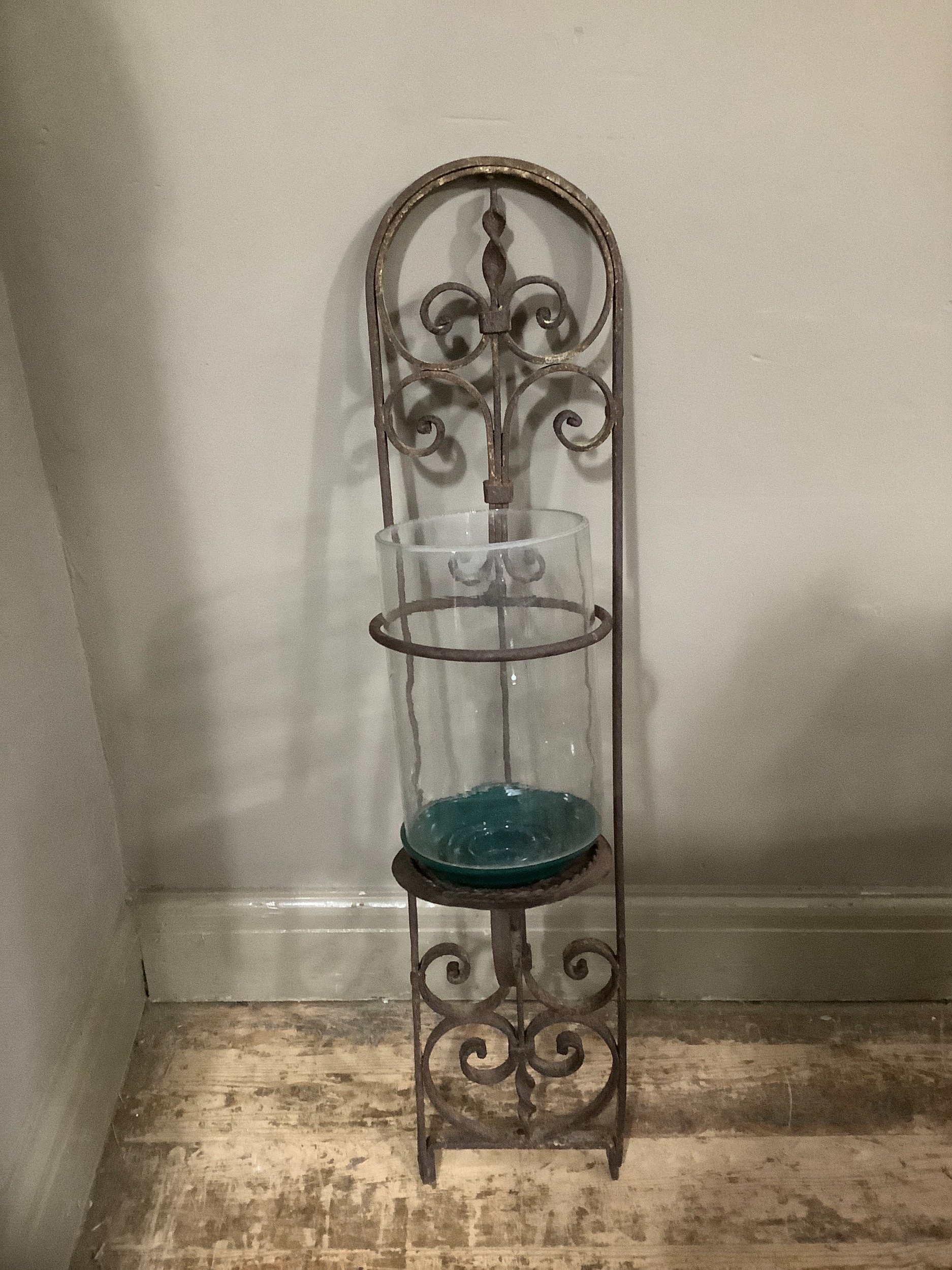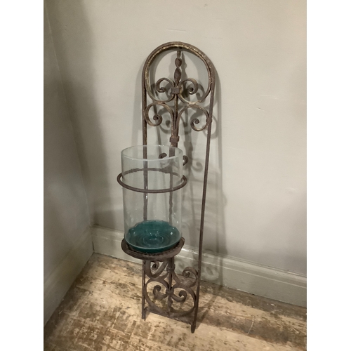 A wrought iron and glass candle holder of scroll design, 95cm high