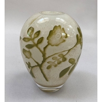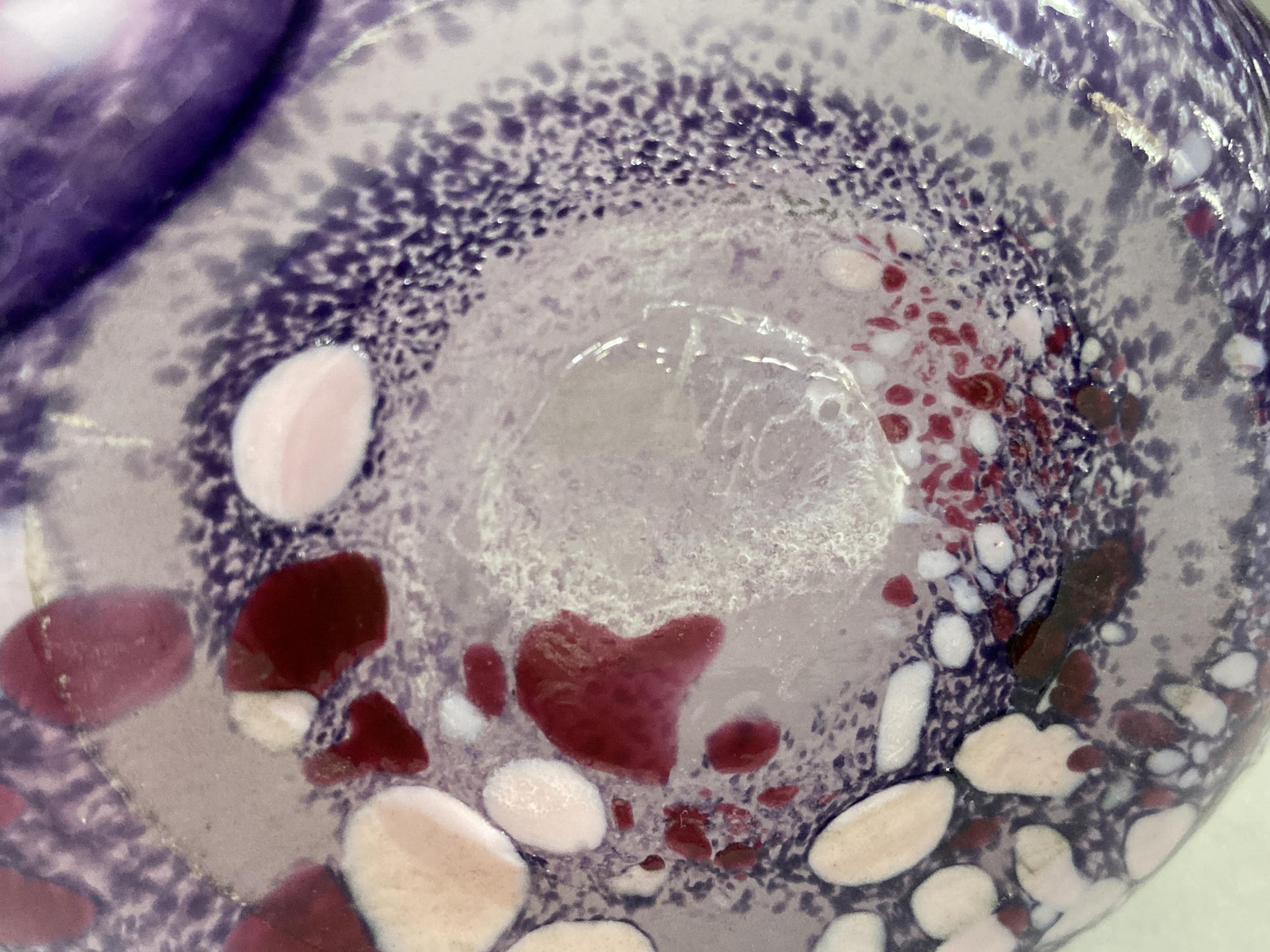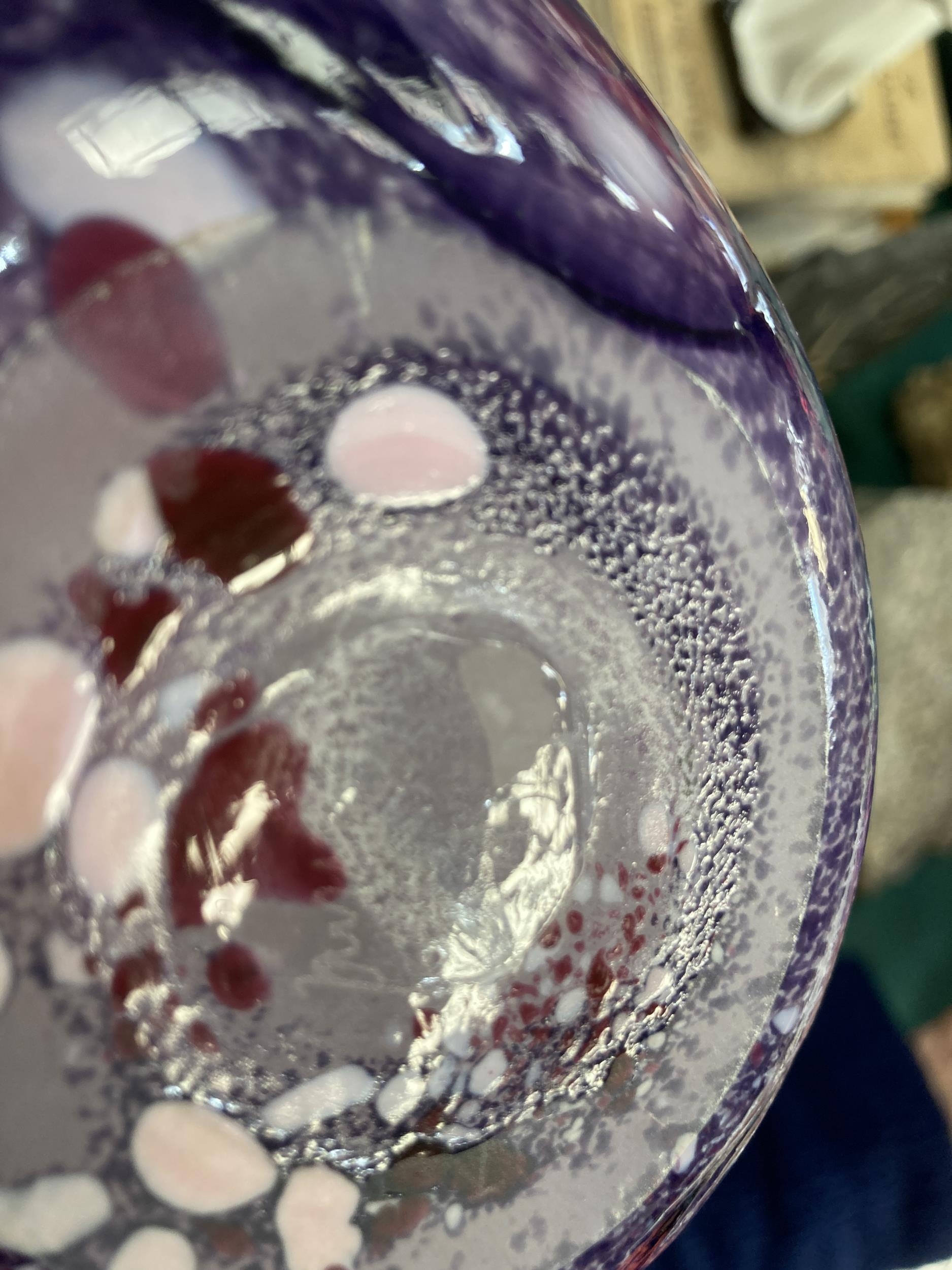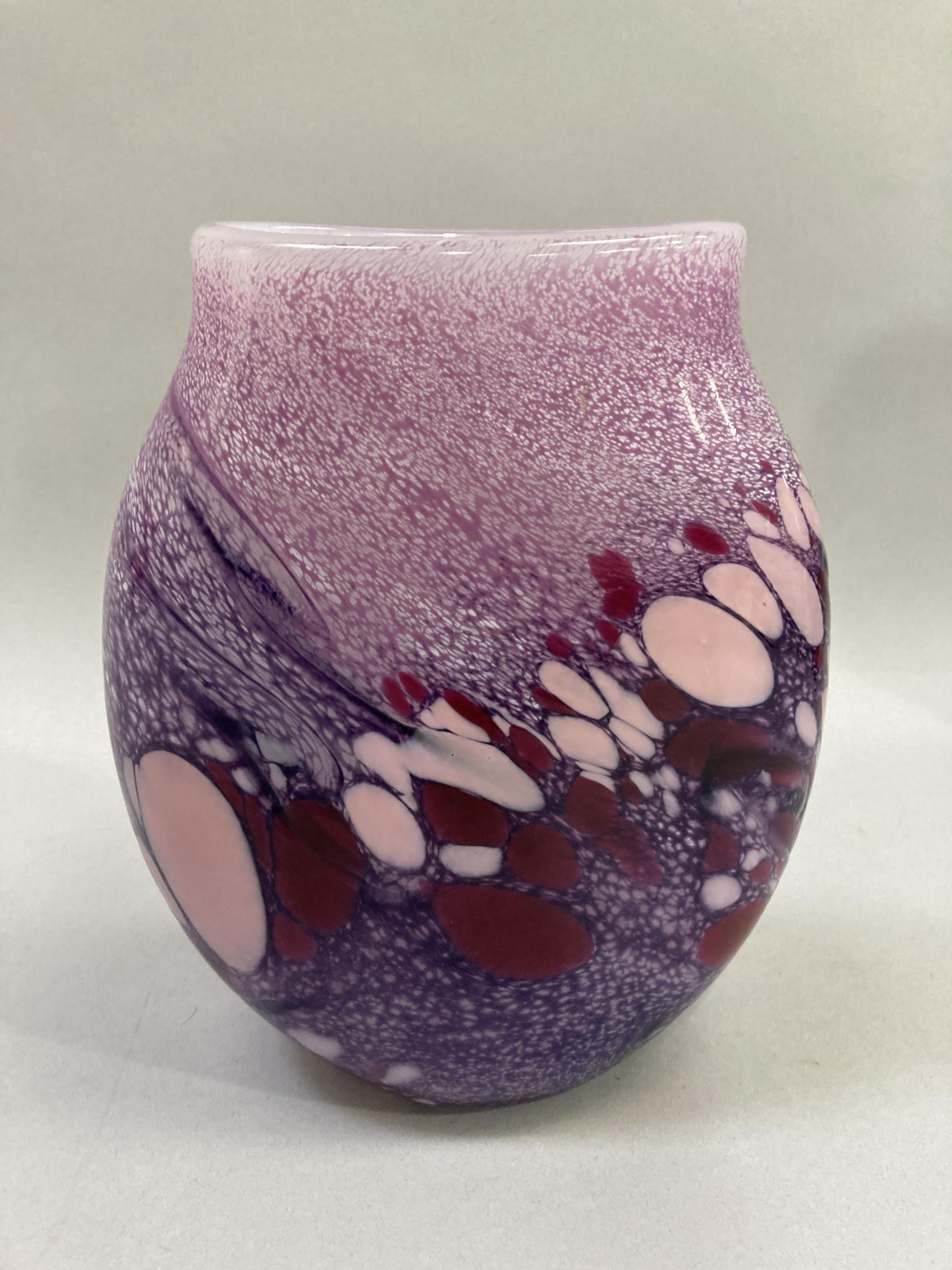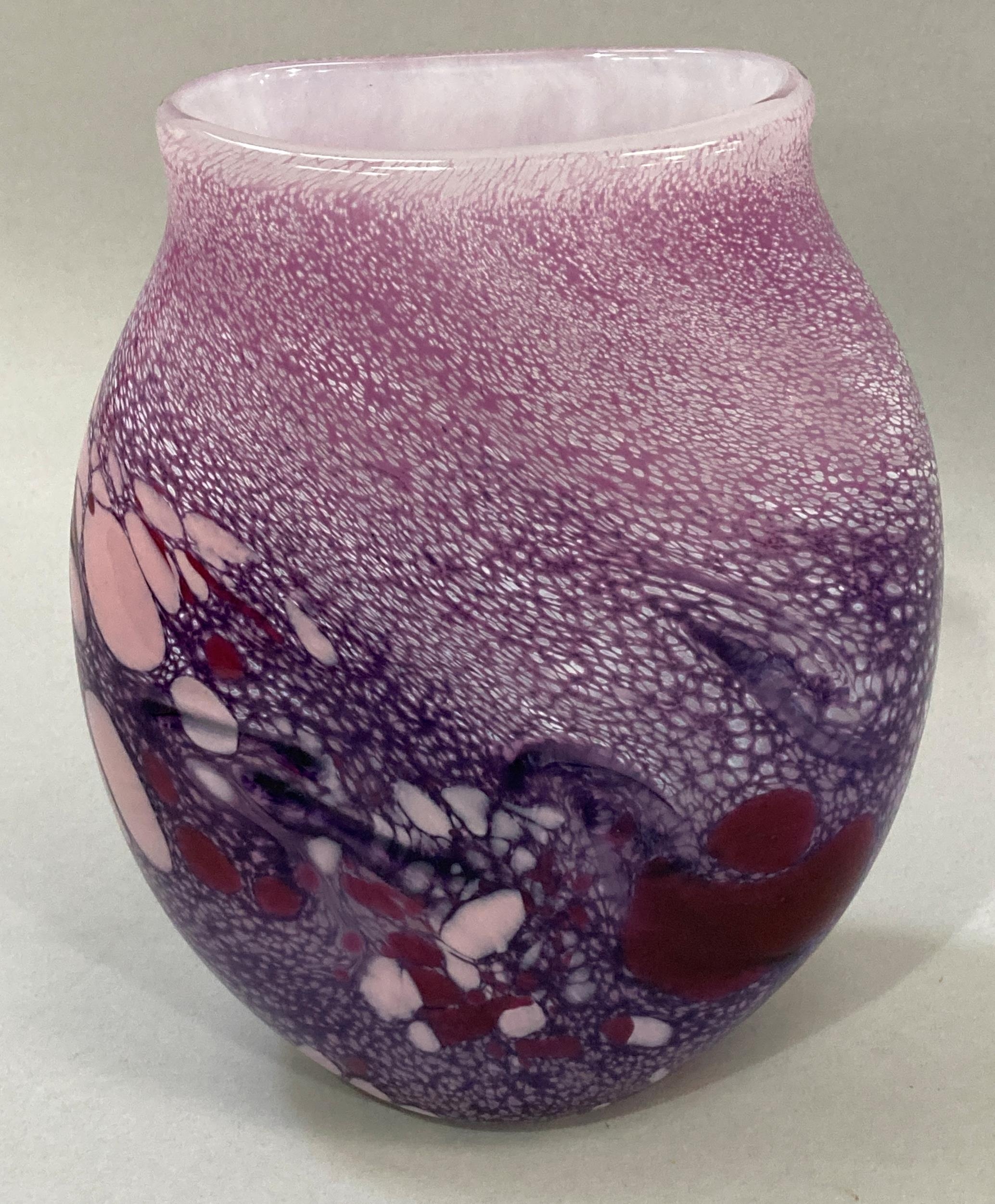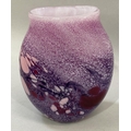 A studio glass vase form the National Glass Centre of flattened ovoid form, the glass marbled in pink amethyst and crimson, etched signature NGC and indistinct signature etched to base, 23.5cm high