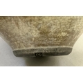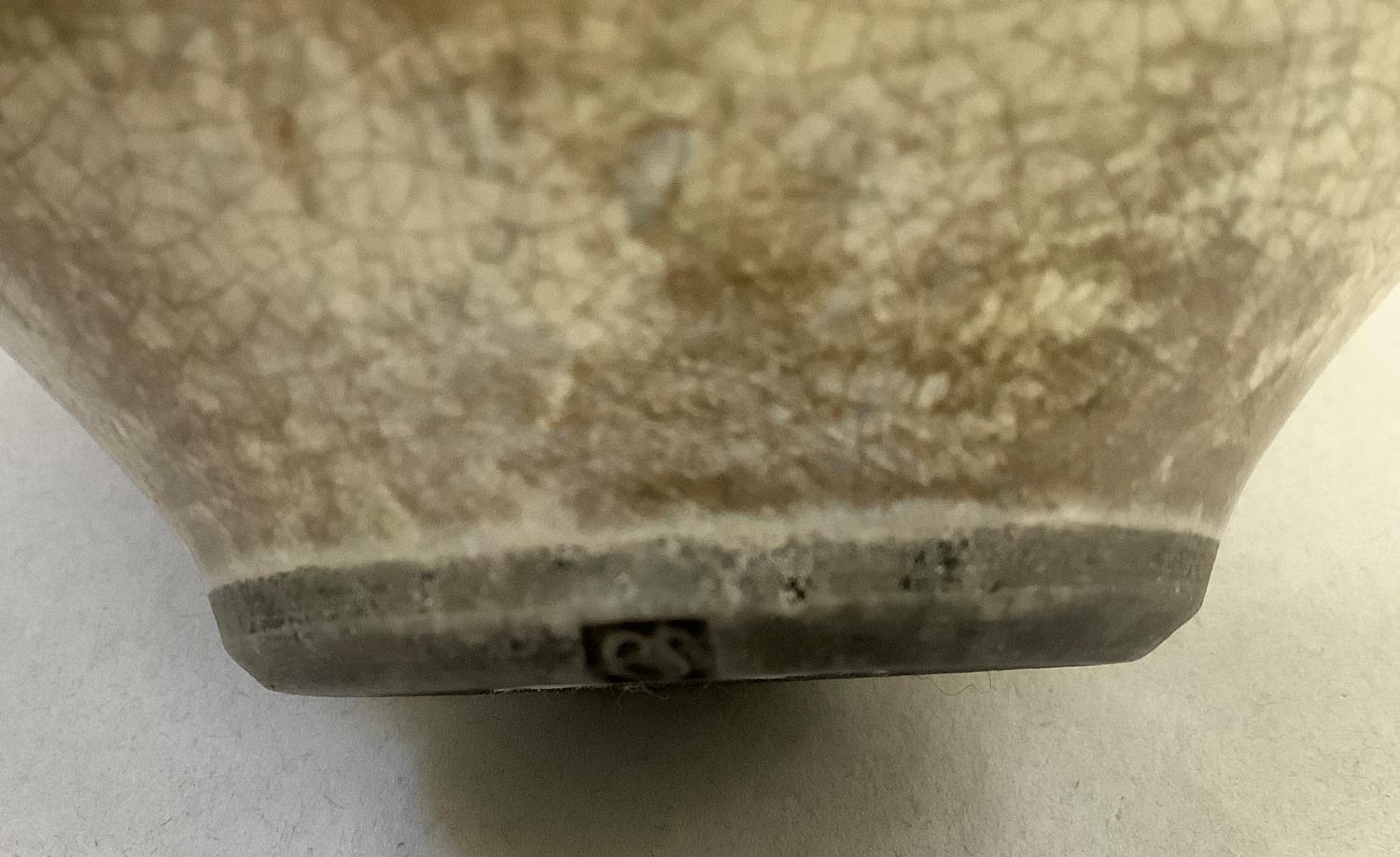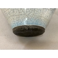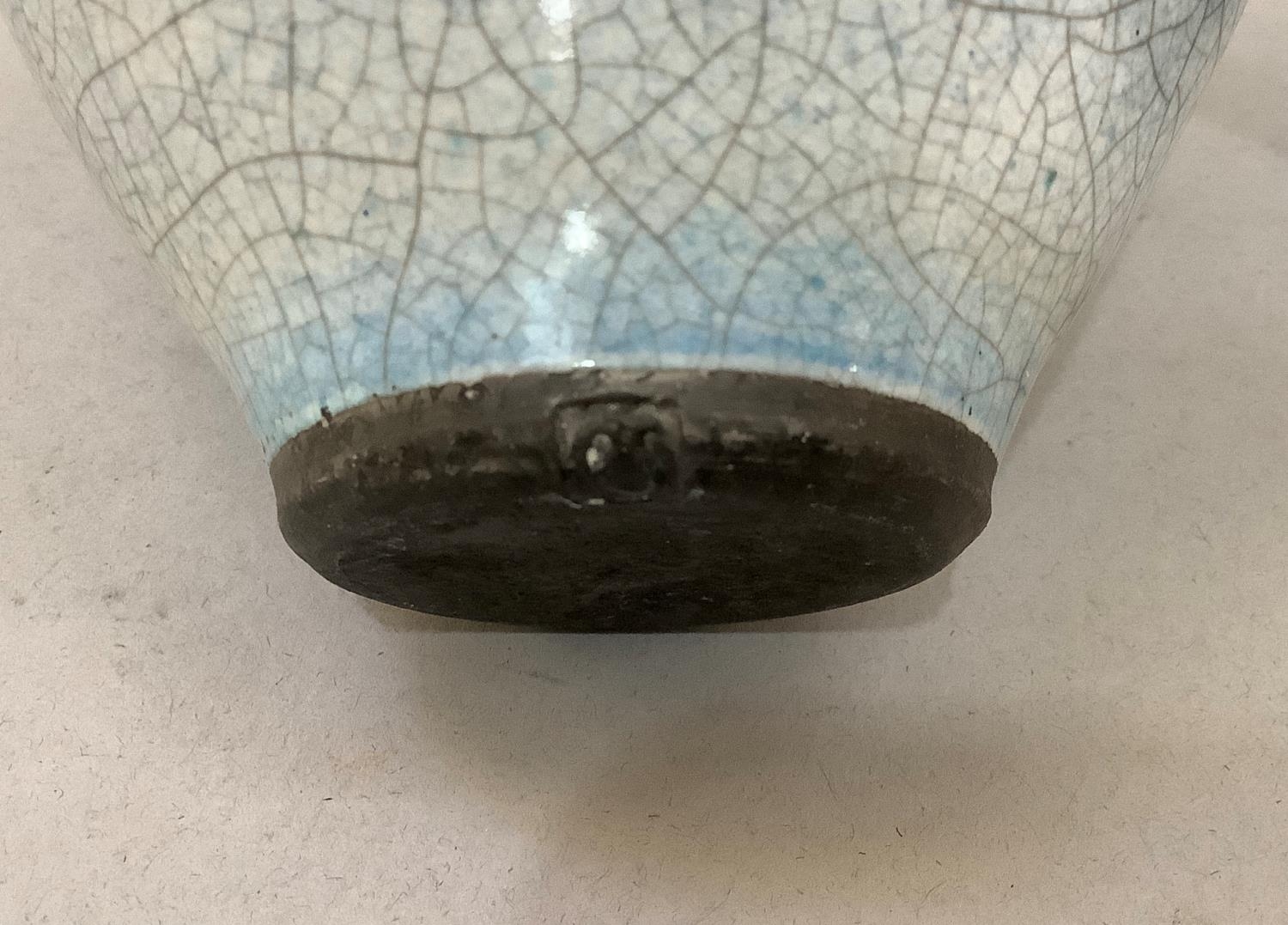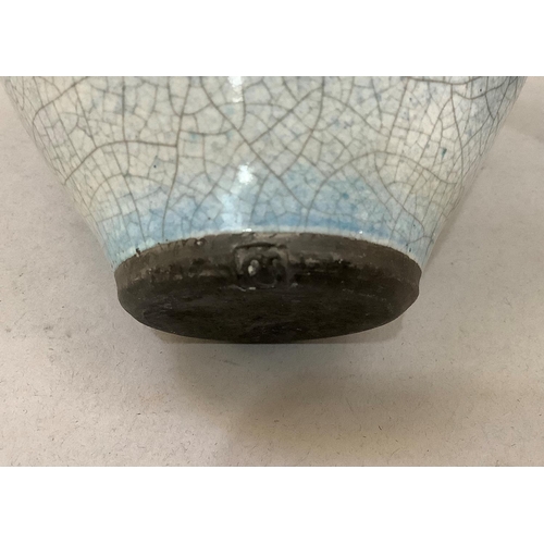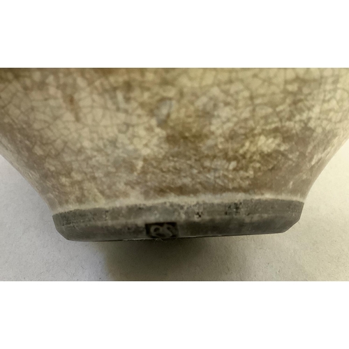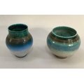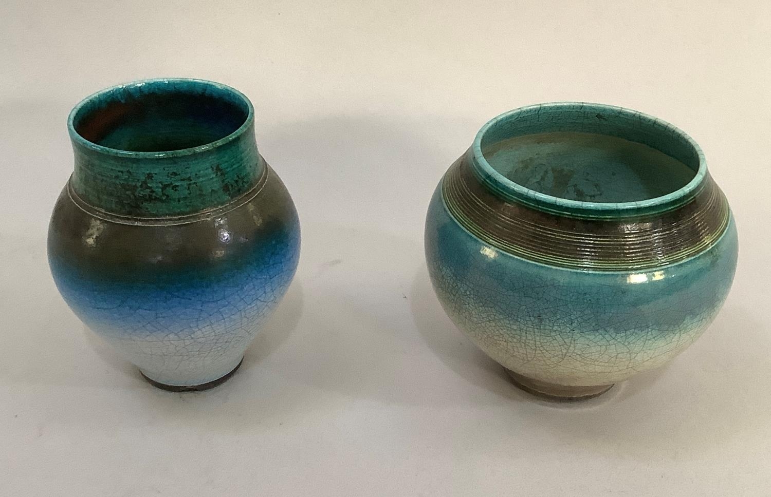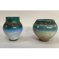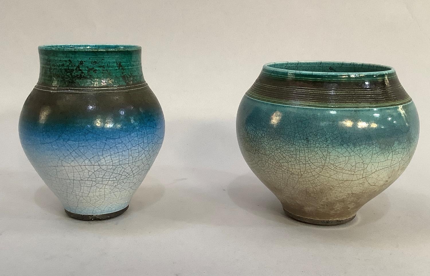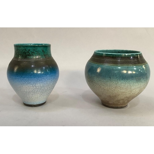Two crackle glaze pottery vases by Peter Sparrey, glazed in green, brown and blue tint with finely reeded lines to the neck each, 11cm high and 10cm high, impressed mark PS