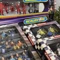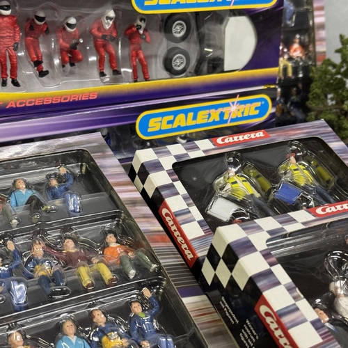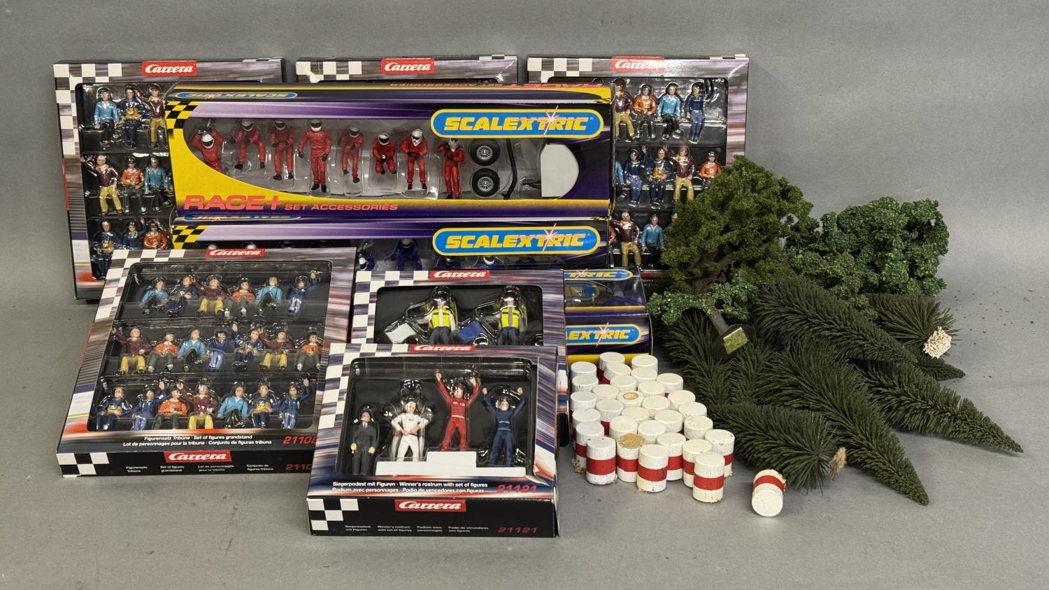 Three Scalextric pit lane crews including fuelling and tyre change, four packs of Carrera spectators (20 to a pack), a Carrera Track Marshall set and a Carrera Winners Podium set, along with a quantity of model trees and crash barrels