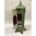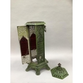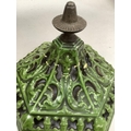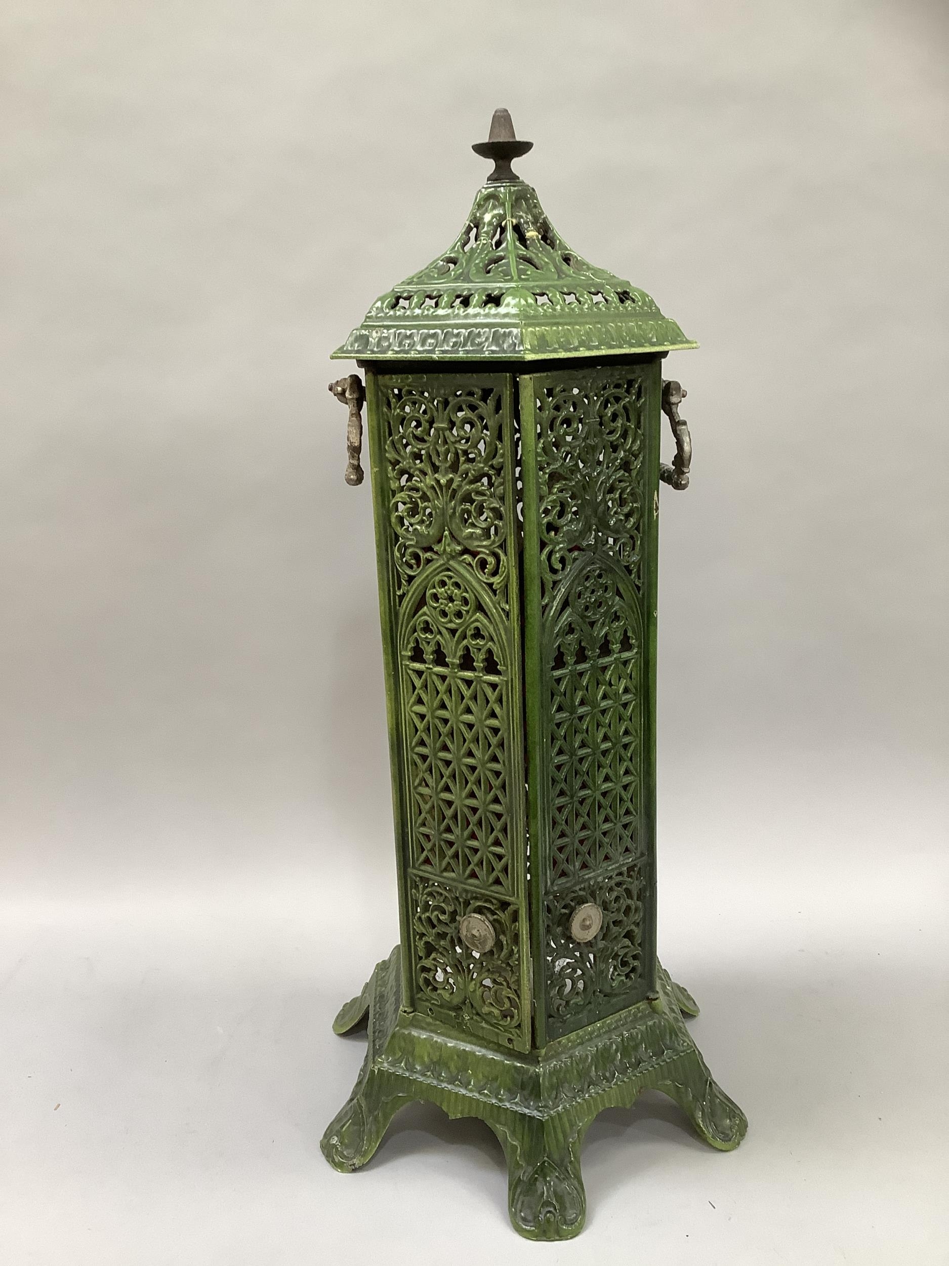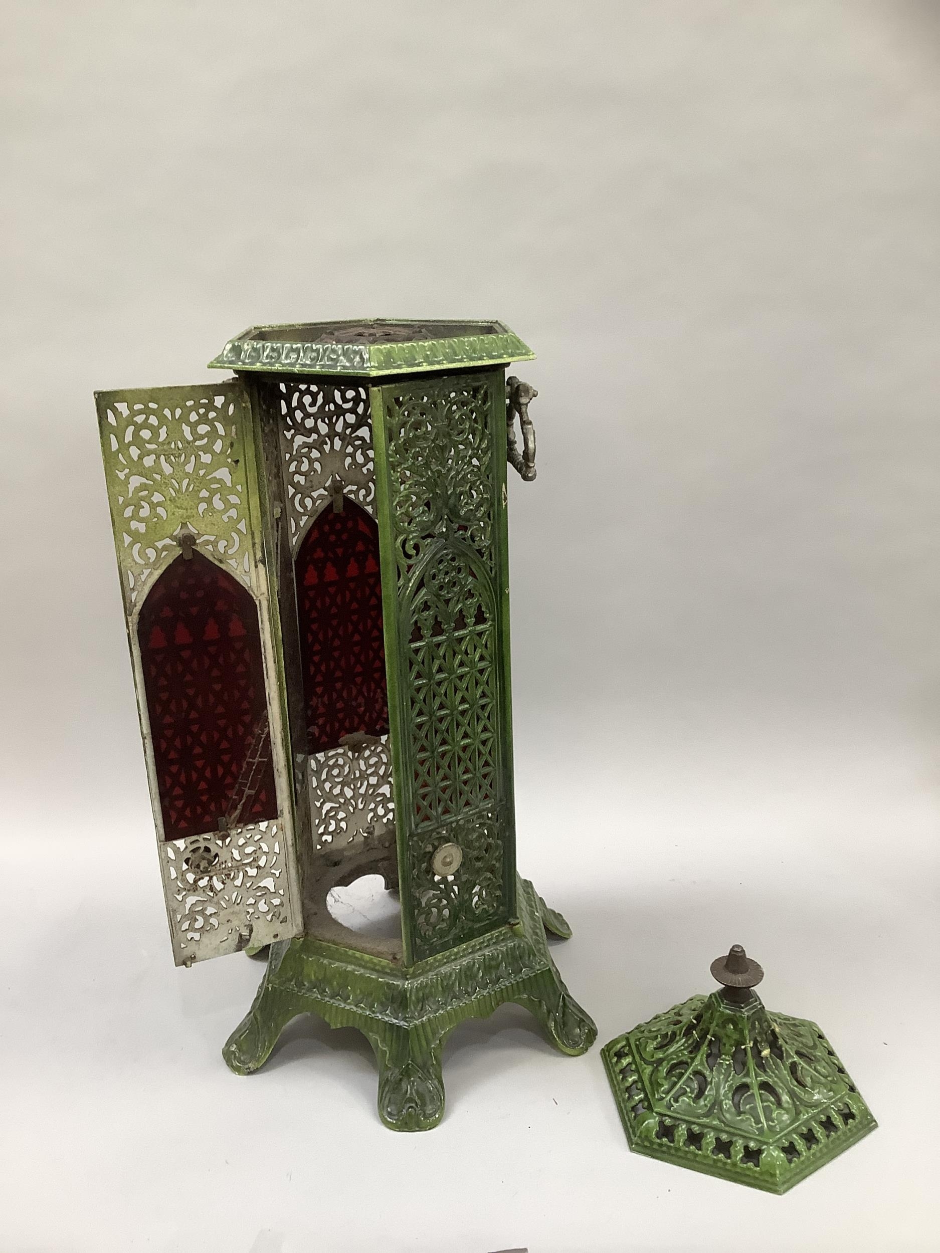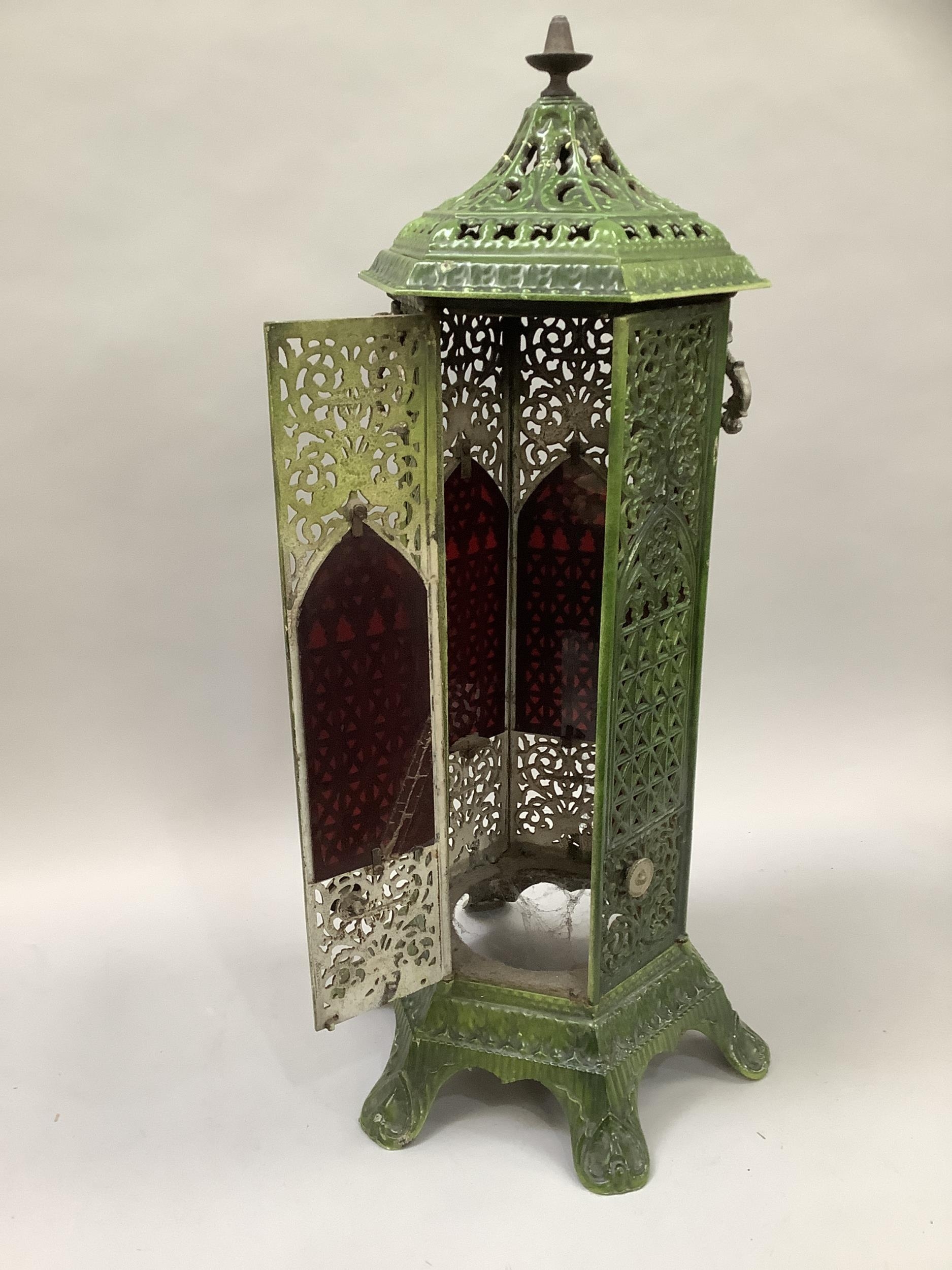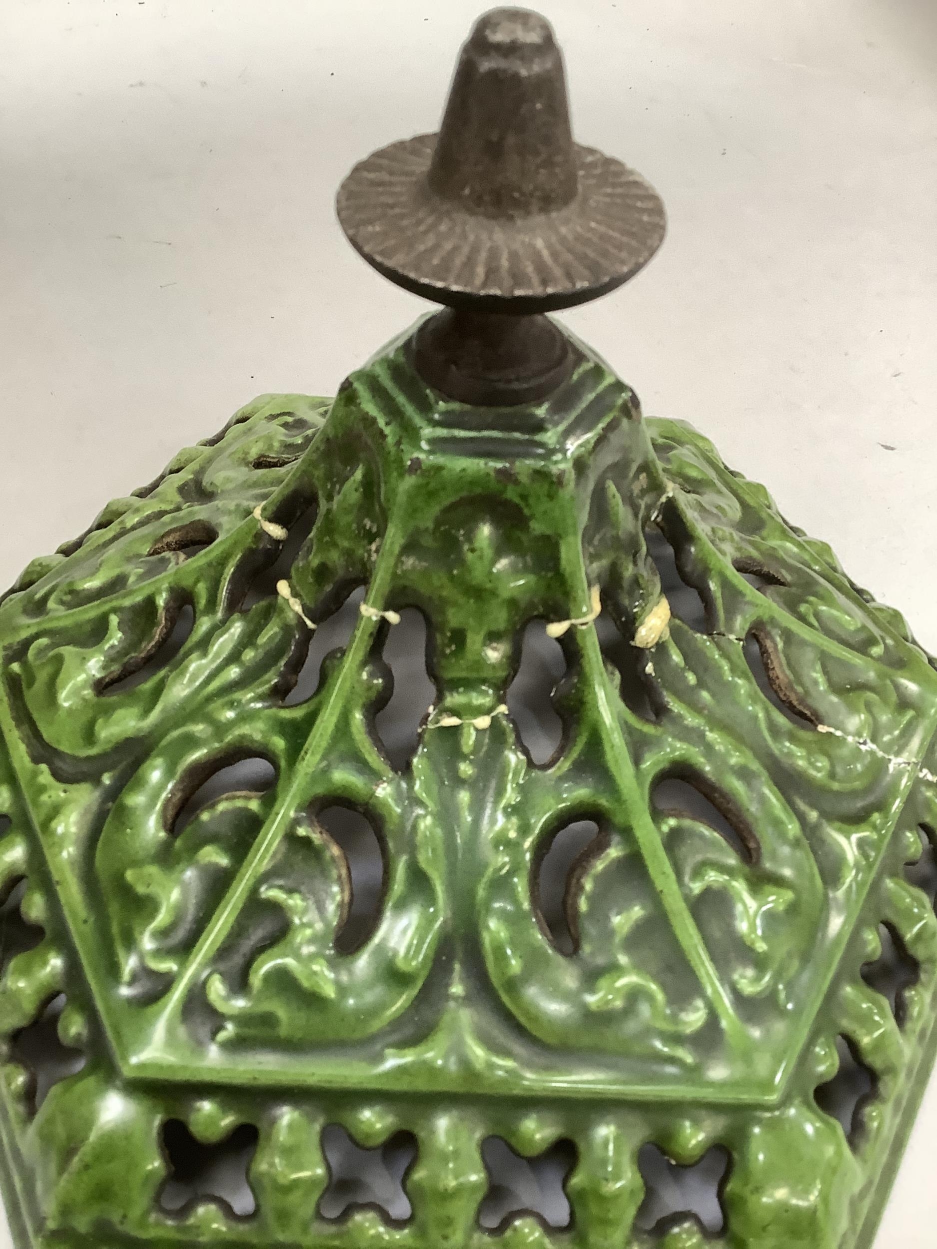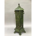 An early 20th century green enamelled cast iron lantern casing of hexagonal outline, pierced in floral and trellis panels with cast loop carrying handles and on six feet, repair to top, 86cm high