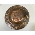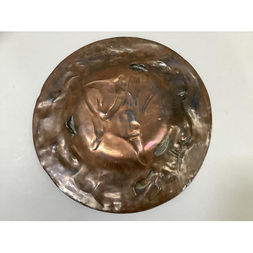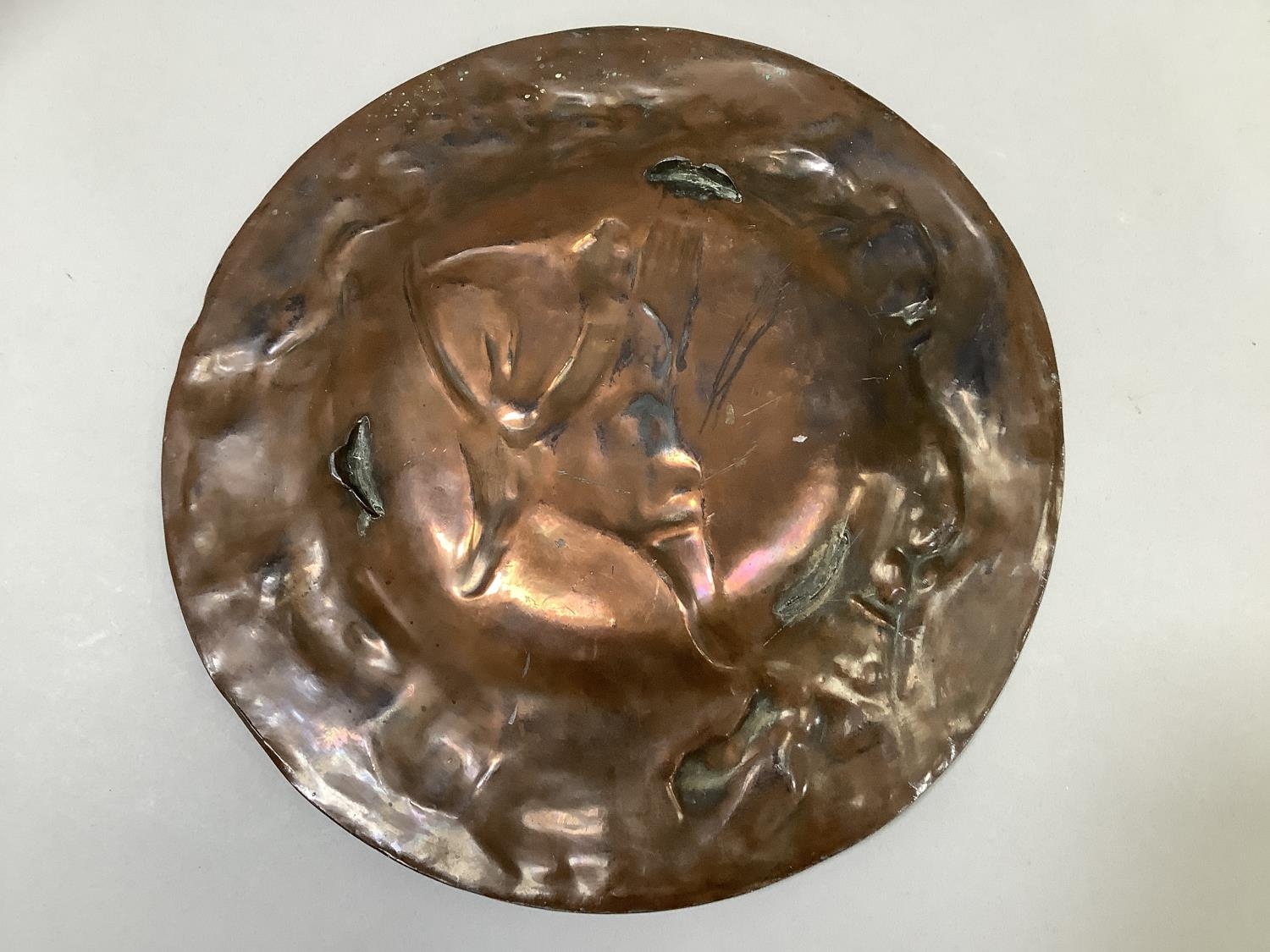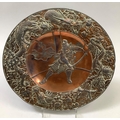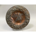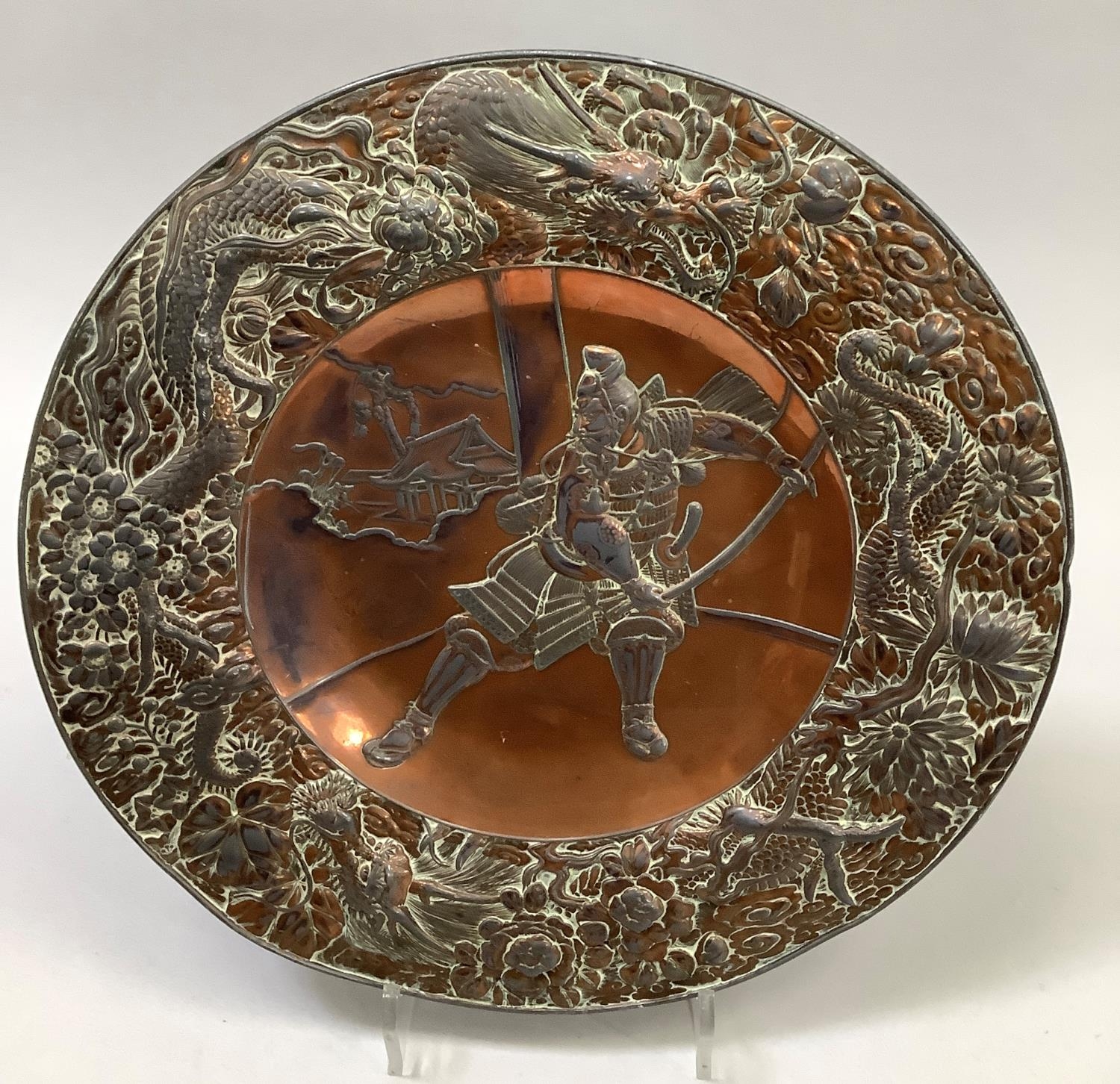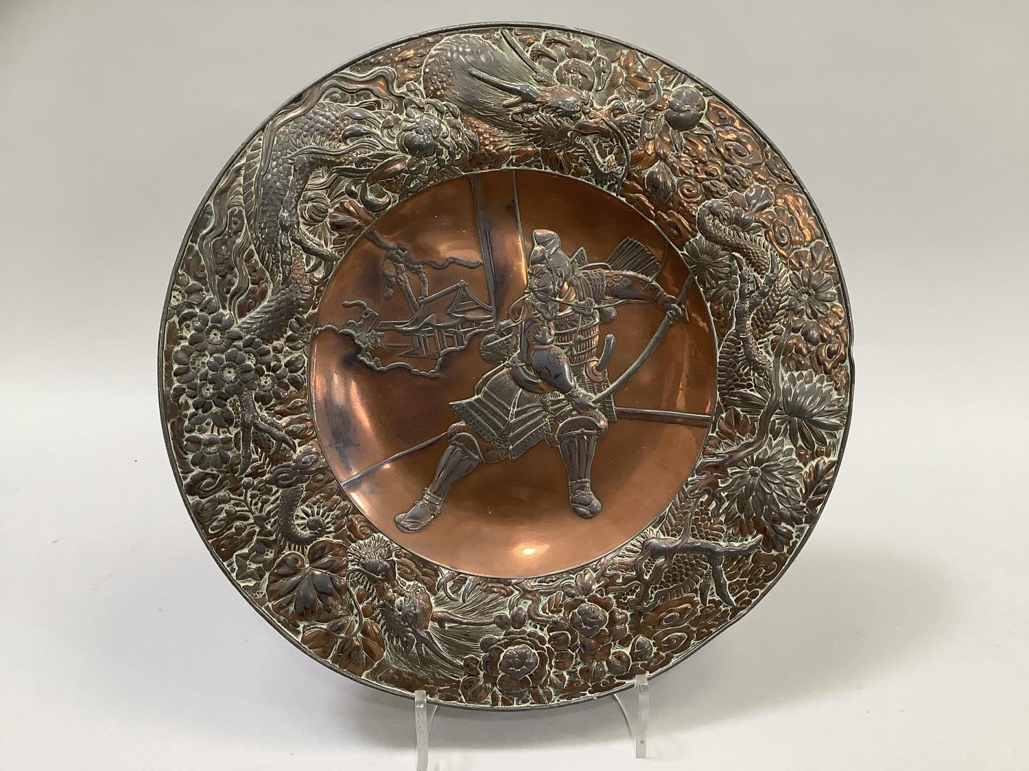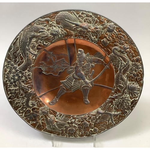 A Japanese plated on copper plaque or dish, Meji period, embossed with a warrior swordsman to the centre within a broad boarder of sinuous dragons amongst peony and chrysanthemums, 31cm