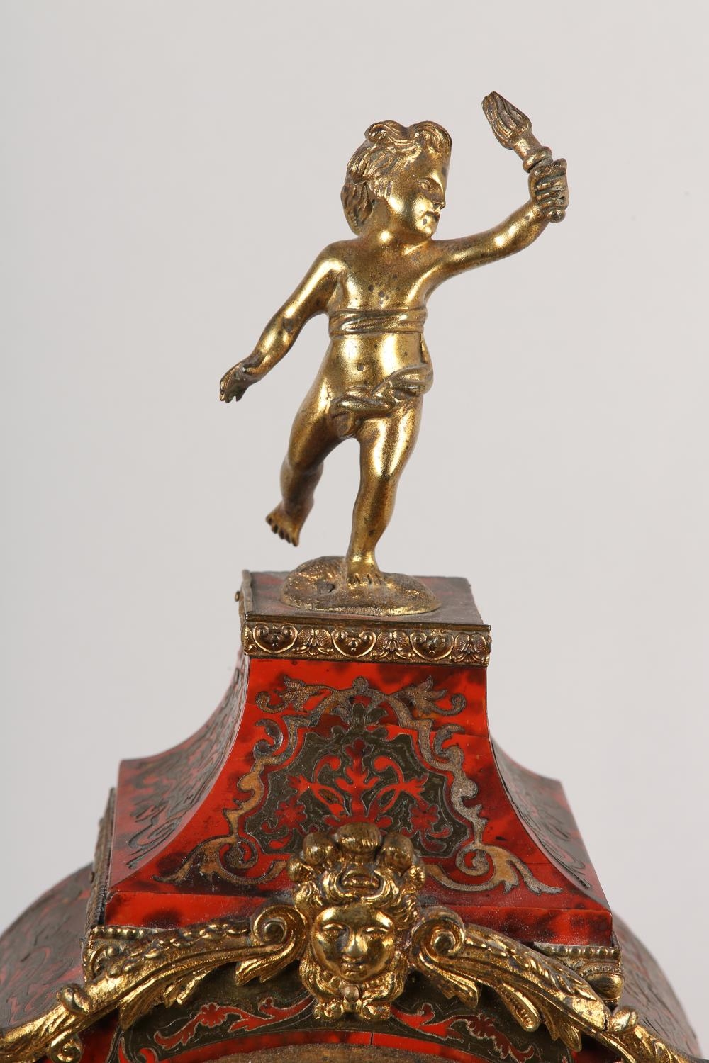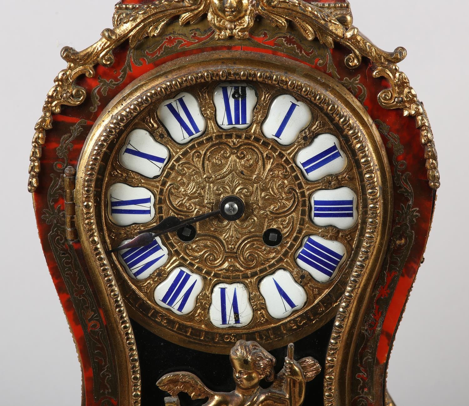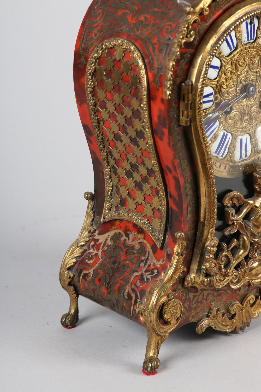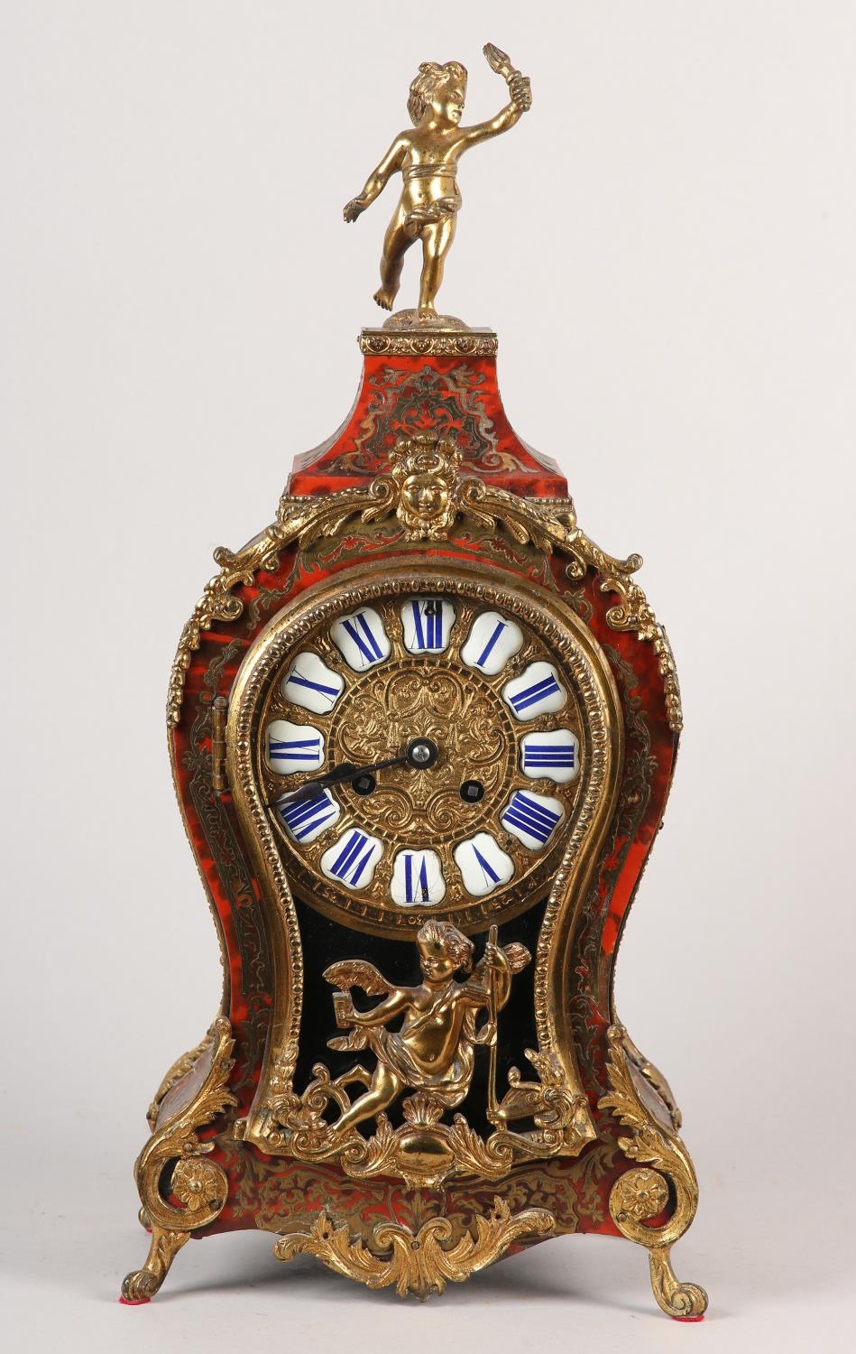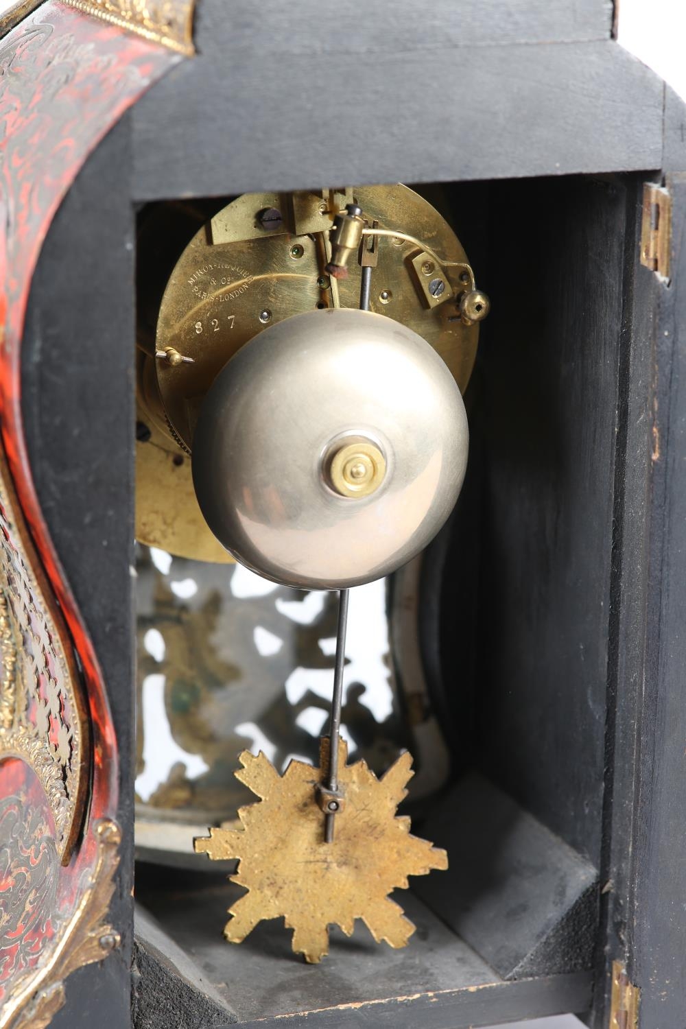 A FRENCH GILT METAL MOUNTED BOULLE BRACKET CLOCK, mid 20th century, the gilt cast face with white enamel cartouche, blue painted Roman numerals, 8-day movement striking on a bell, stamped Miroy Freres Paris & London, no. 827, 47cm high x 22cm