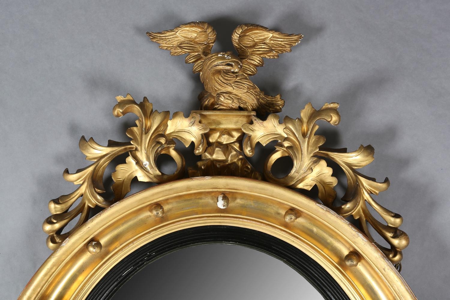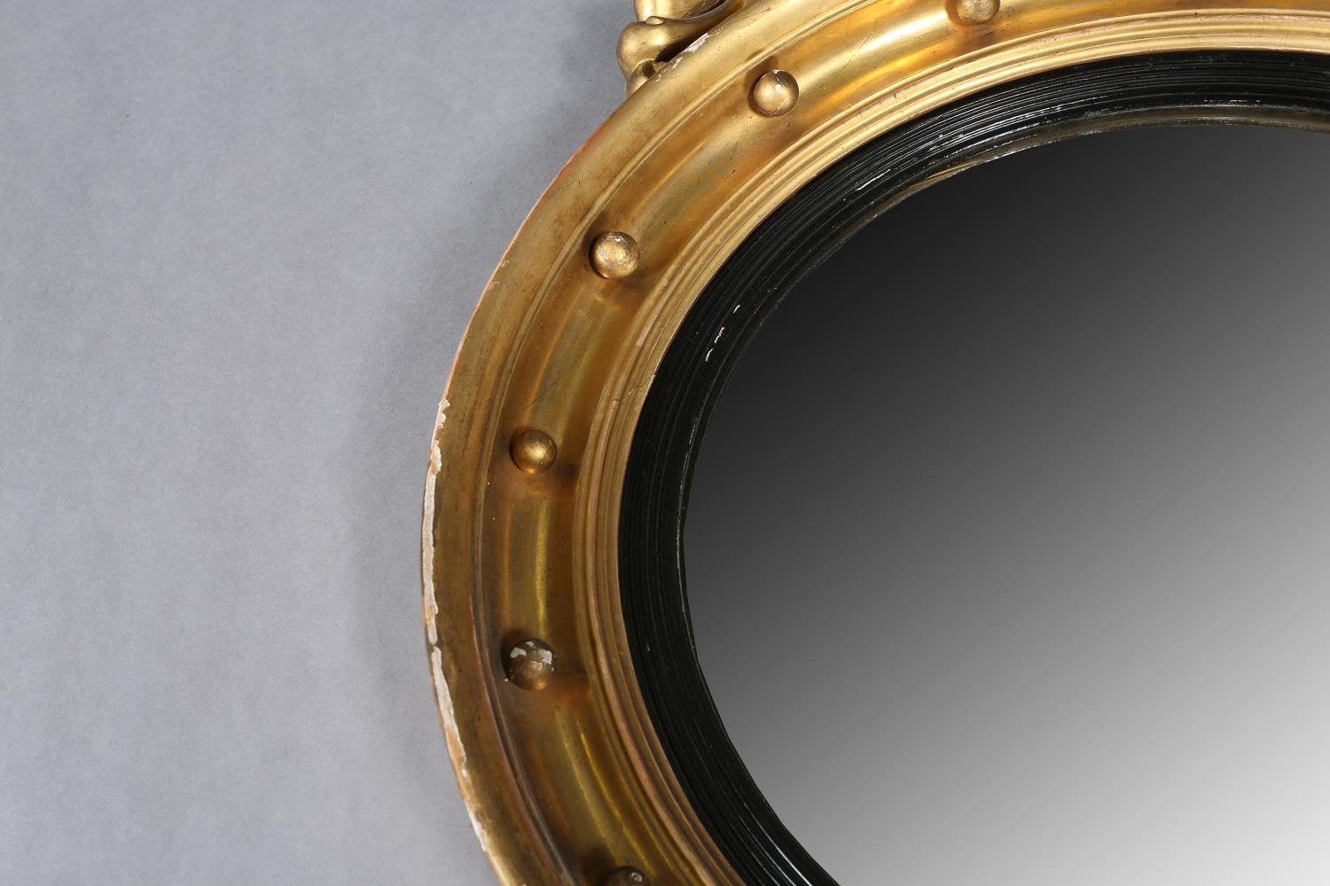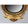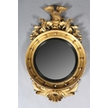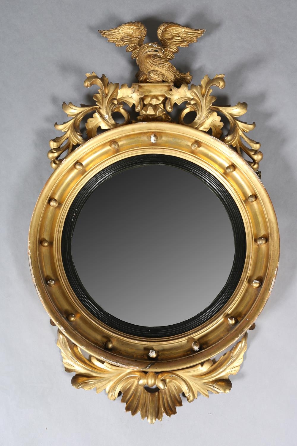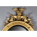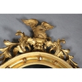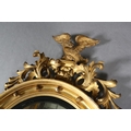 A REGENCY GILT WOOD AND GESSO CONVEX WALL MIRROR, the circular frame applied with spheres and surmounted with an eagle and foliage, conforming apron, 110cm high x 68cm wide
