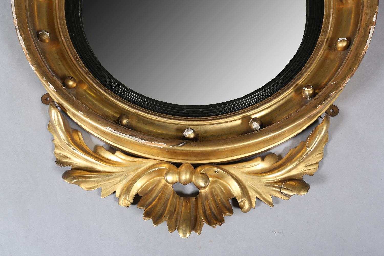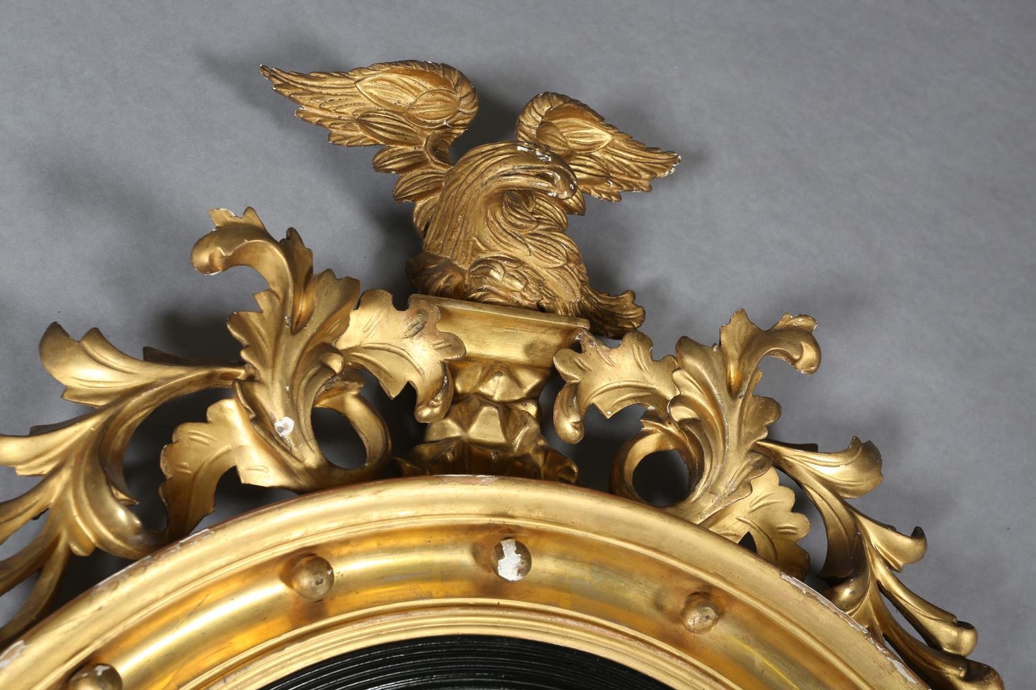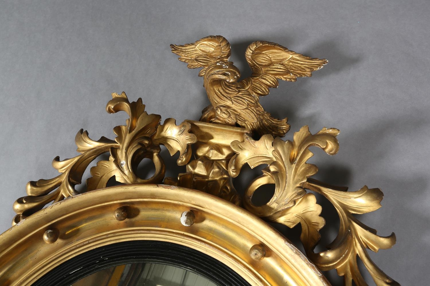 A REGENCY GILT WOOD AND GESSO CONVEX WALL MIRROR, the circular frame applied with spheres and surmounted with an eagle and foliage, conforming apron, 110cm high x 68cm wide