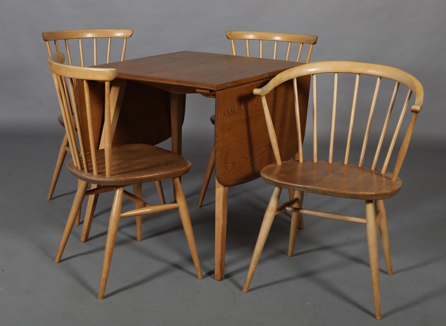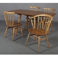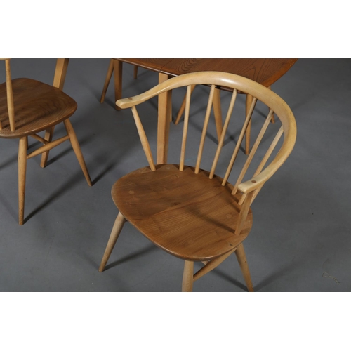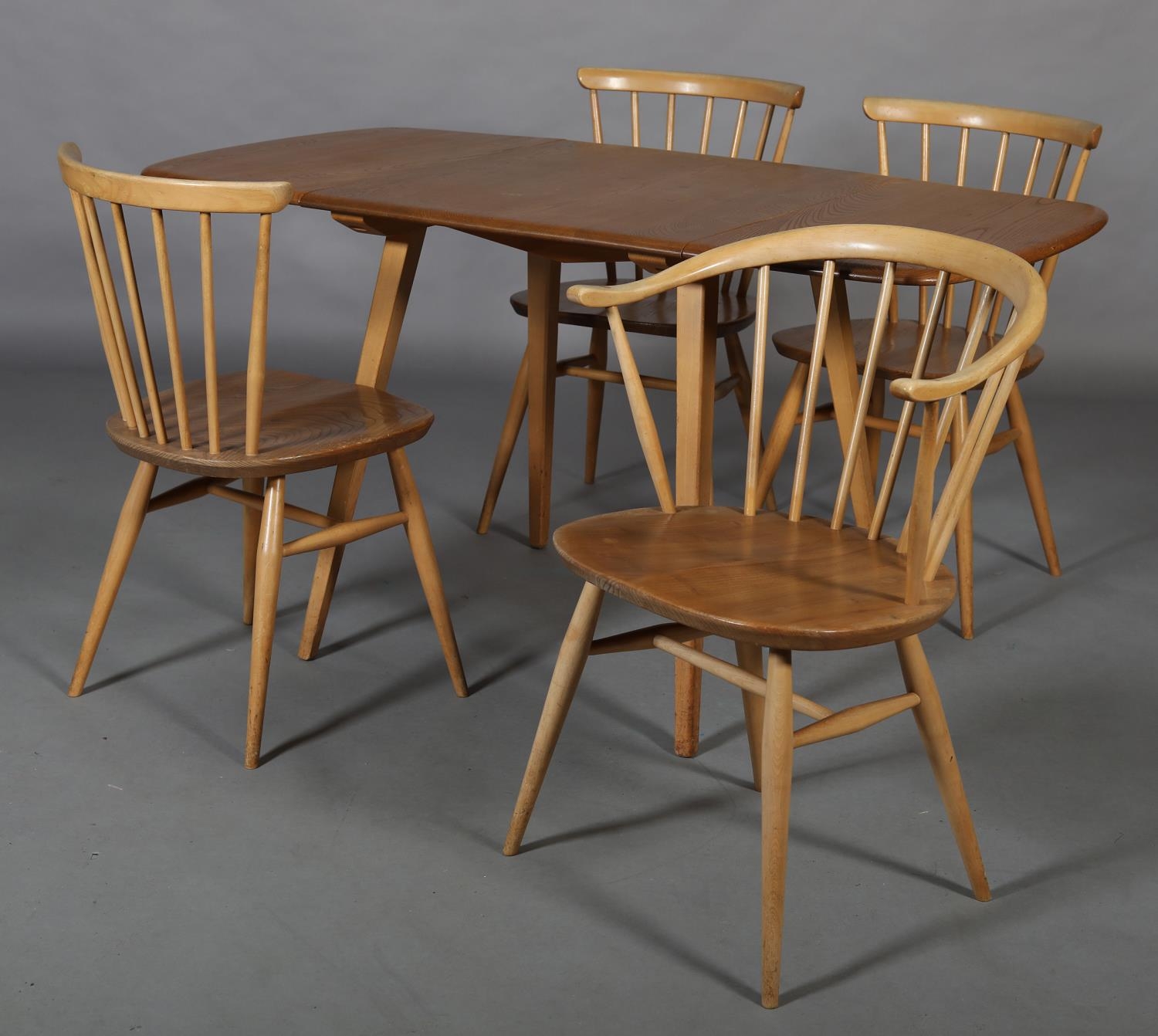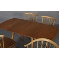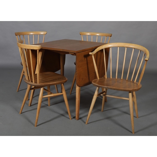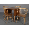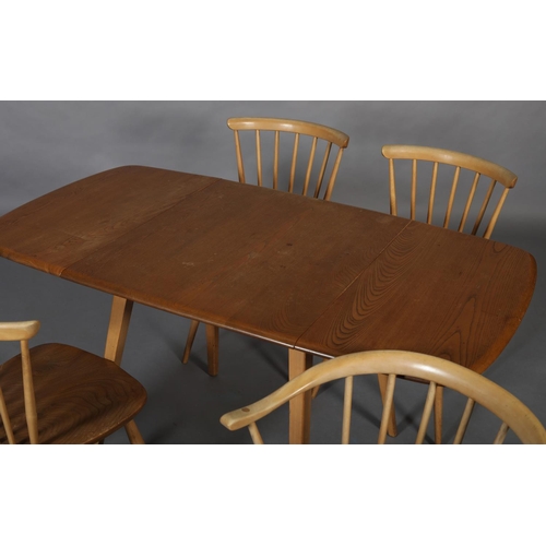 Ercol c1960s, A dropleaf elm and beech dining table and a set of '449' chairs comprising three singles and a 'cowhorn' carver, 138cm x 75cm maximum, 61cm when folded