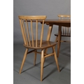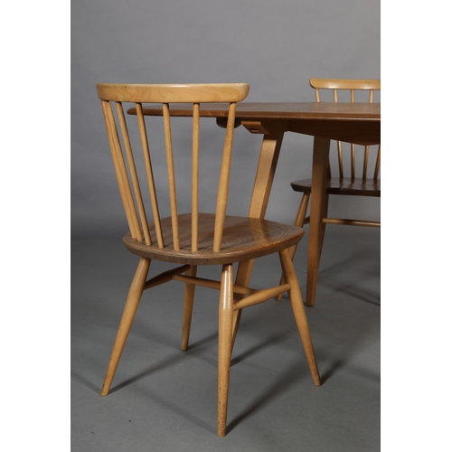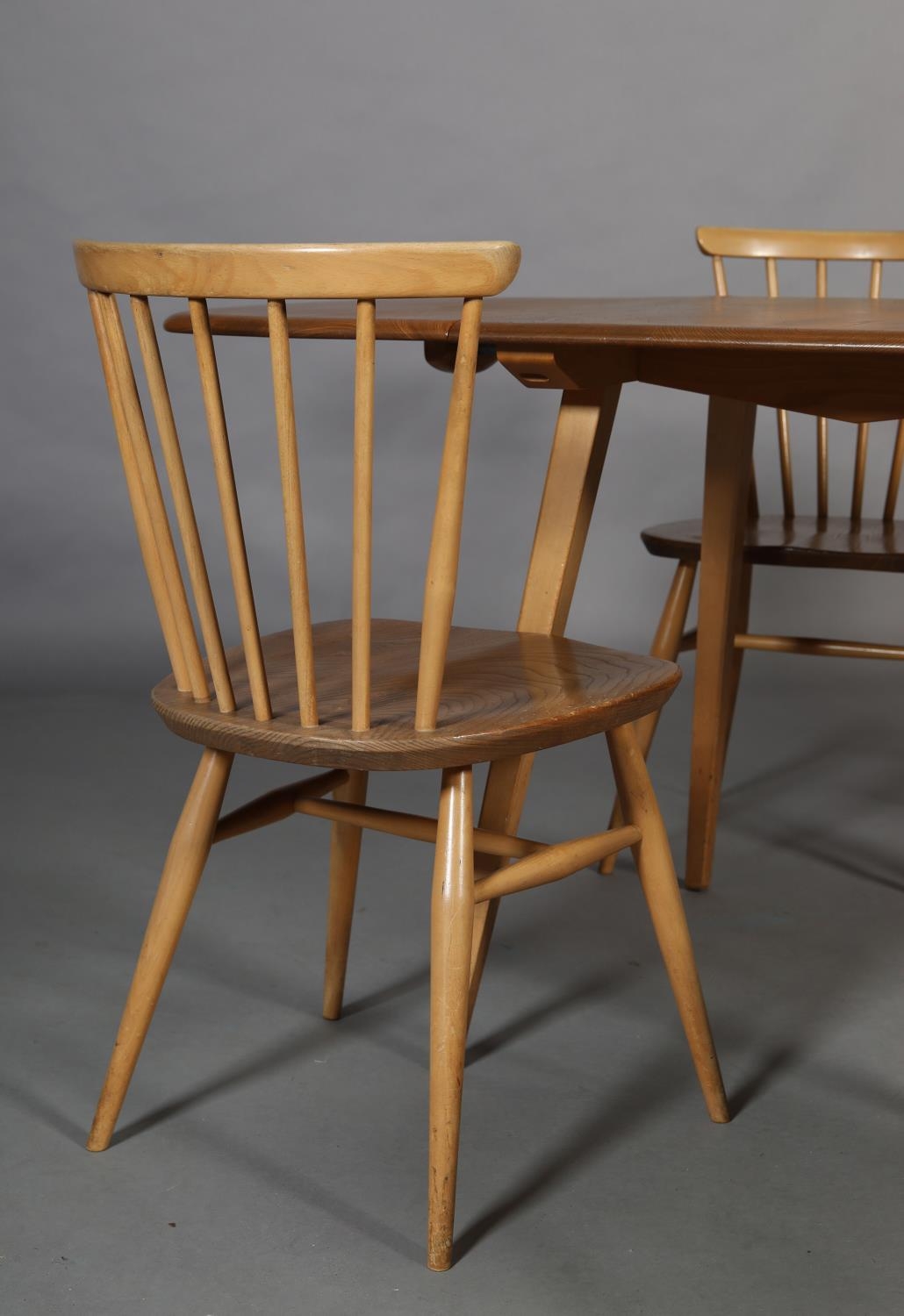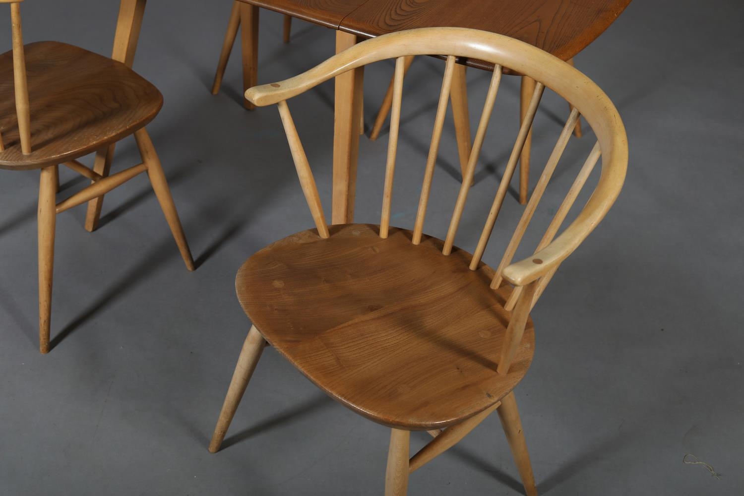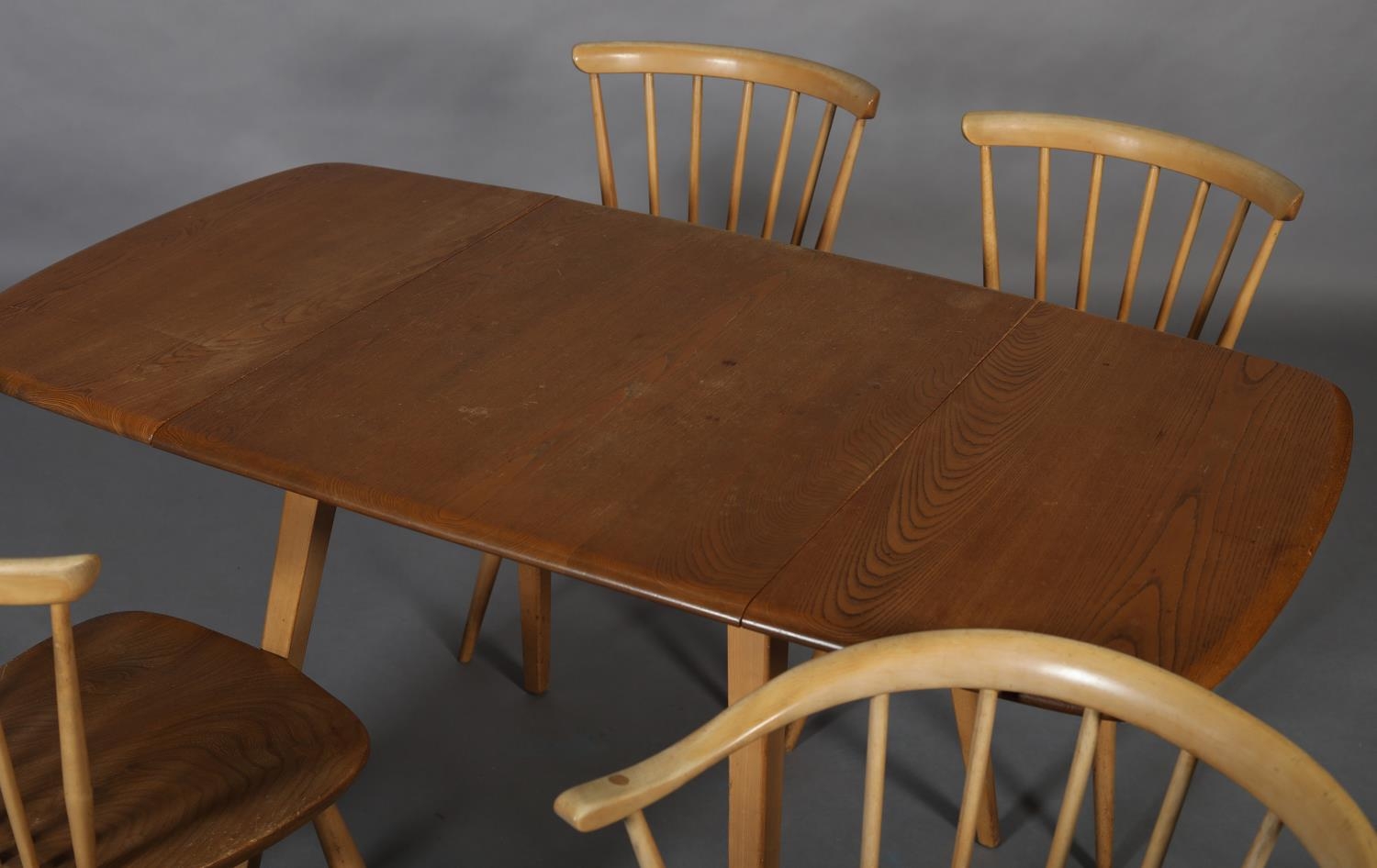 Ercol c1960s, A dropleaf elm and beech dining table and a set of '449' chairs comprising three singles and a 'cowhorn' carver, 138cm x 75cm maximum, 61cm when folded