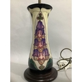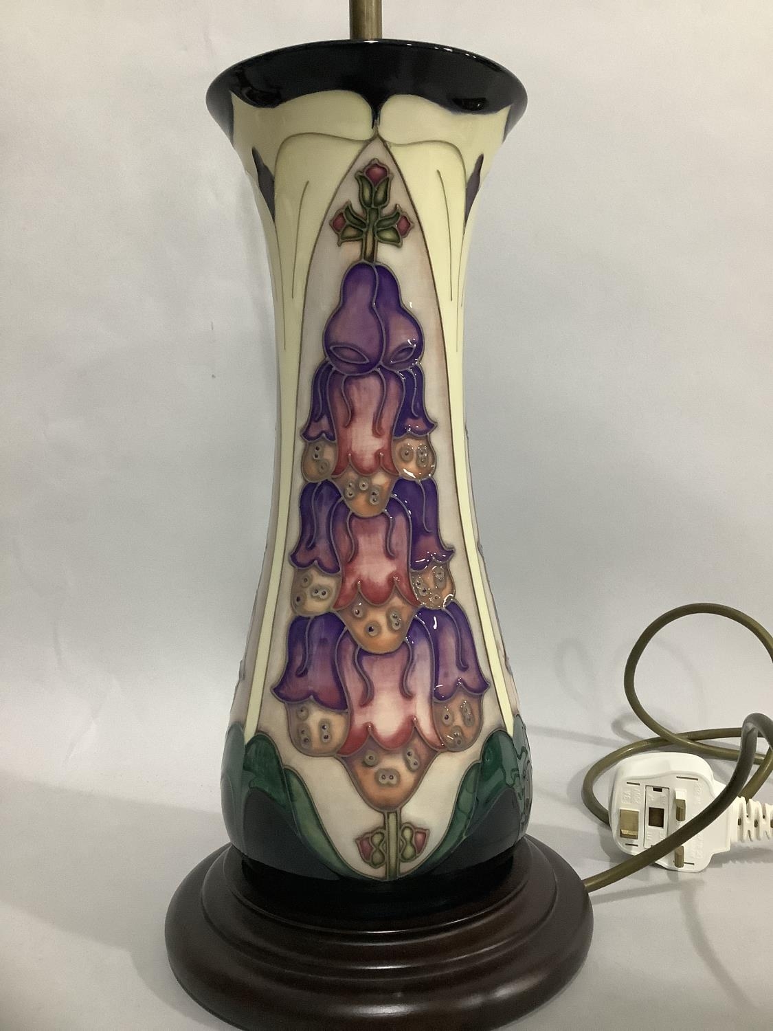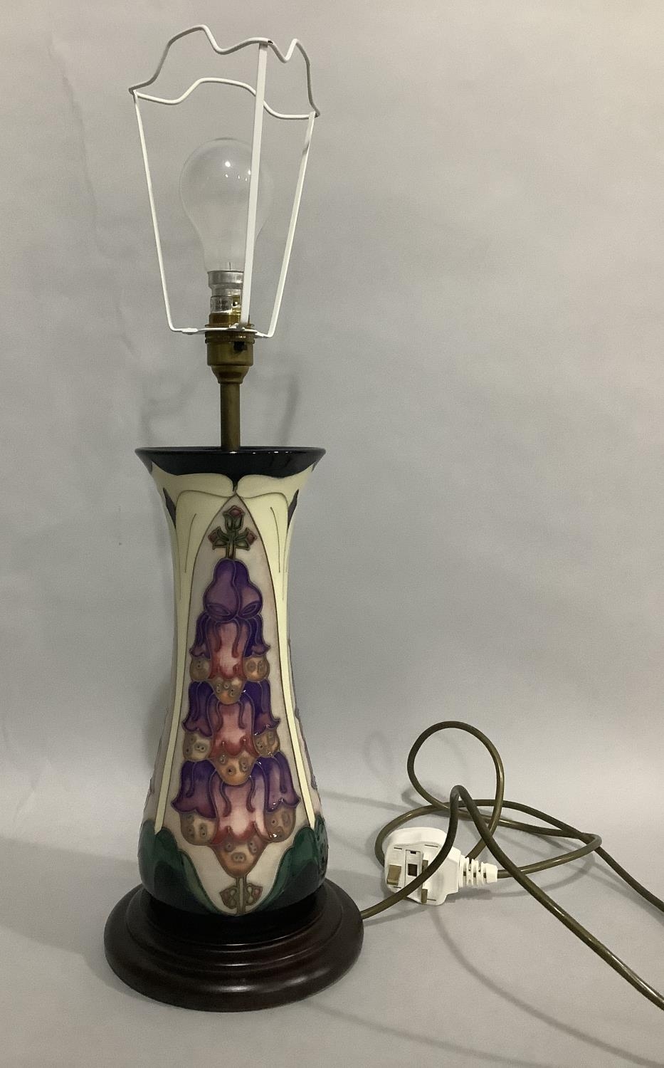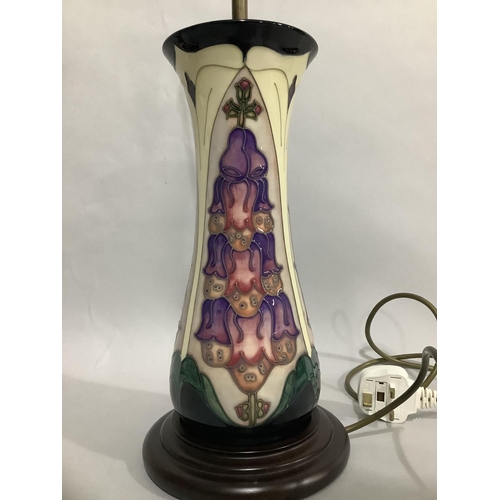 A Moorcroft table lamp of foxglove pattern designed by Rachel Bishop, tapered form on base with shade, 33.5cm to fitting