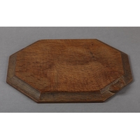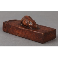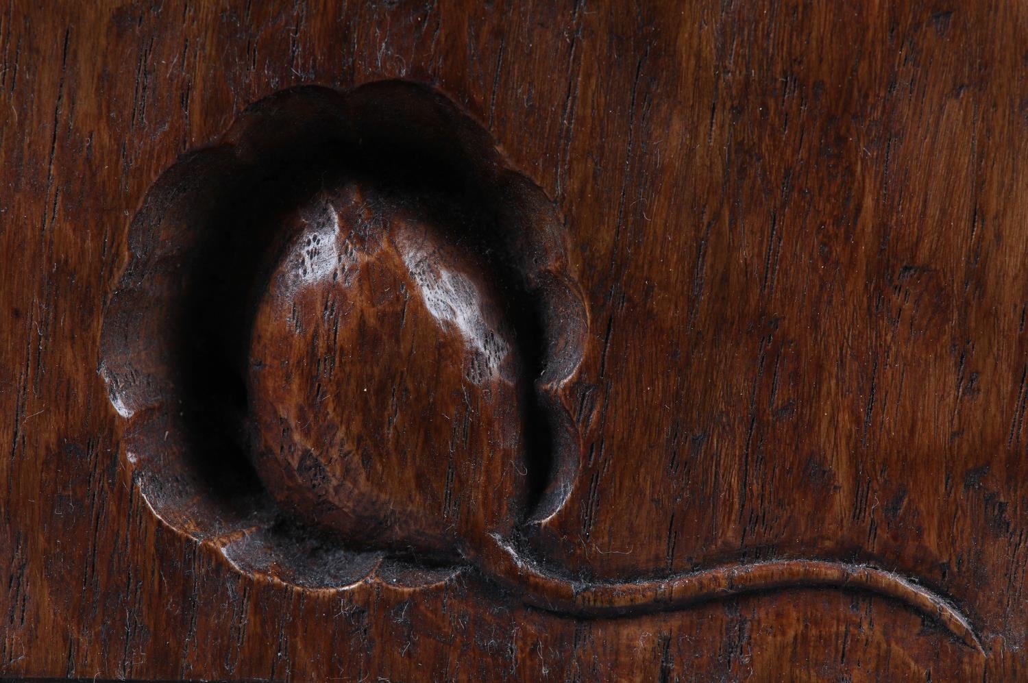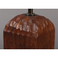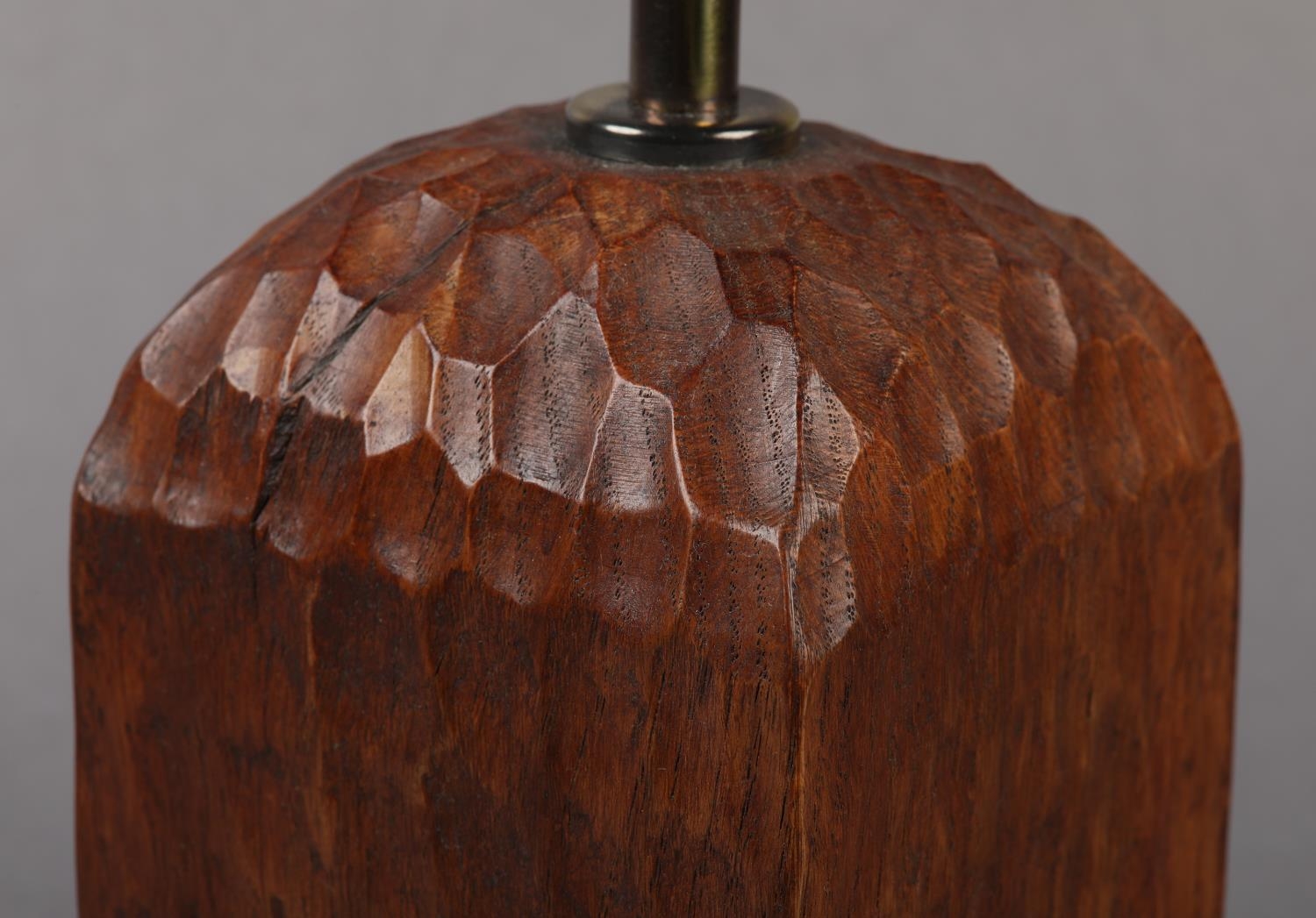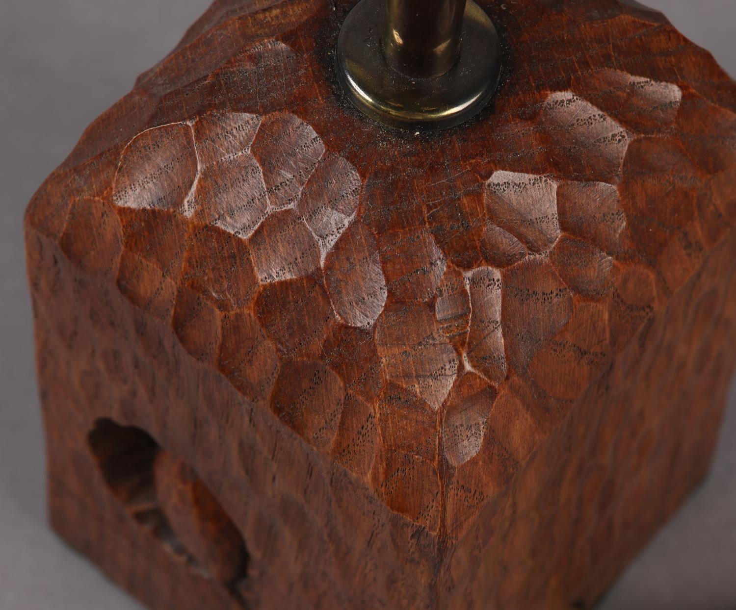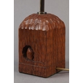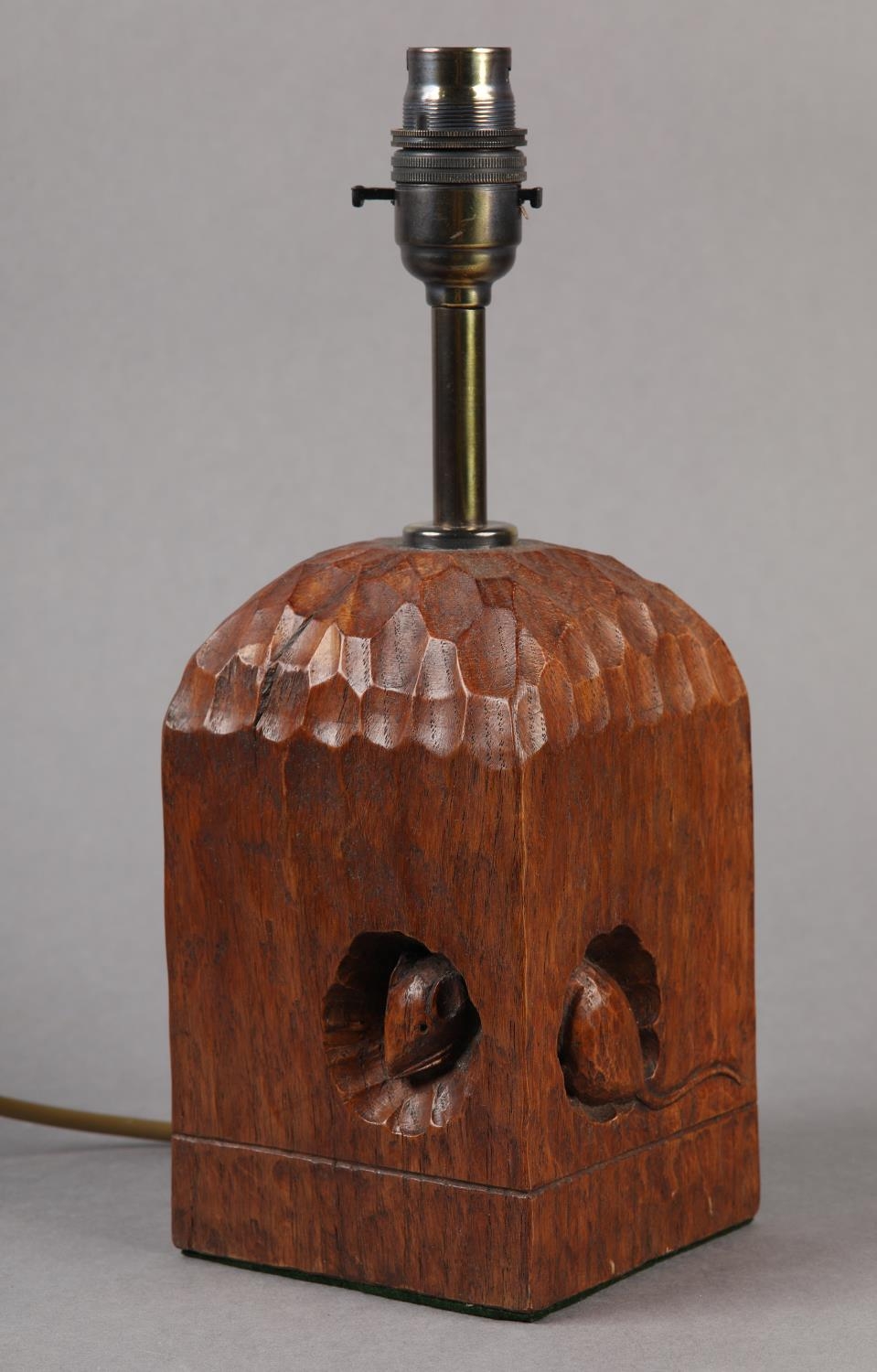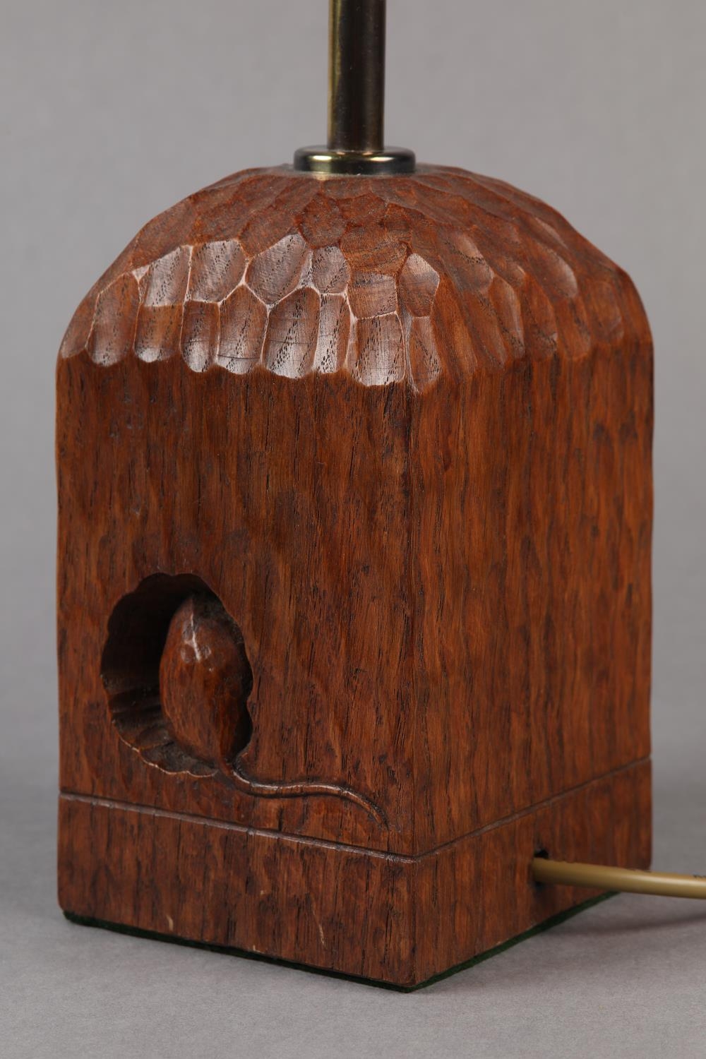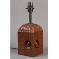 THOMPSON OF KILBURN 'MOUSEMAN' English oak table lamp base of square outline, carved with a mouse peeping from a hole, 10cm square x 28.5cm high to fitting