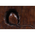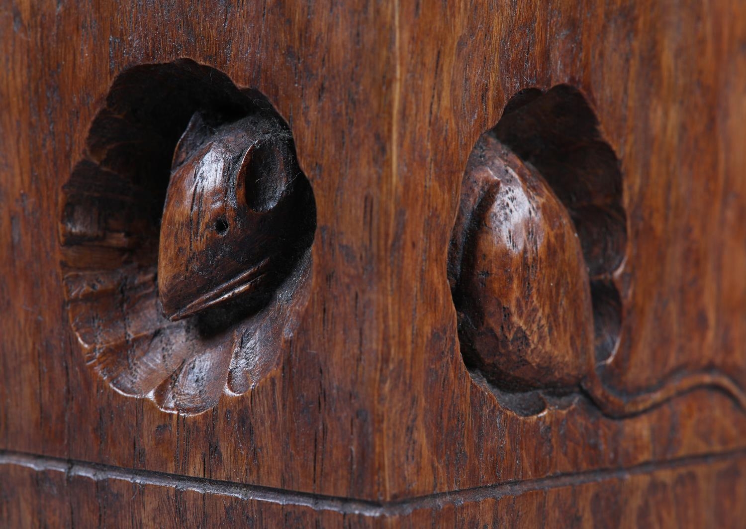 There is a crack/split in the oak running from the fitting over the shoulder to the top of the panel. This has old wax in it, approximately 7cm. Age possibly 1950s. More likely to have been made by the workshop.