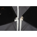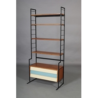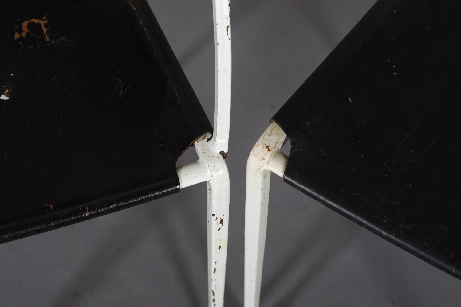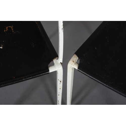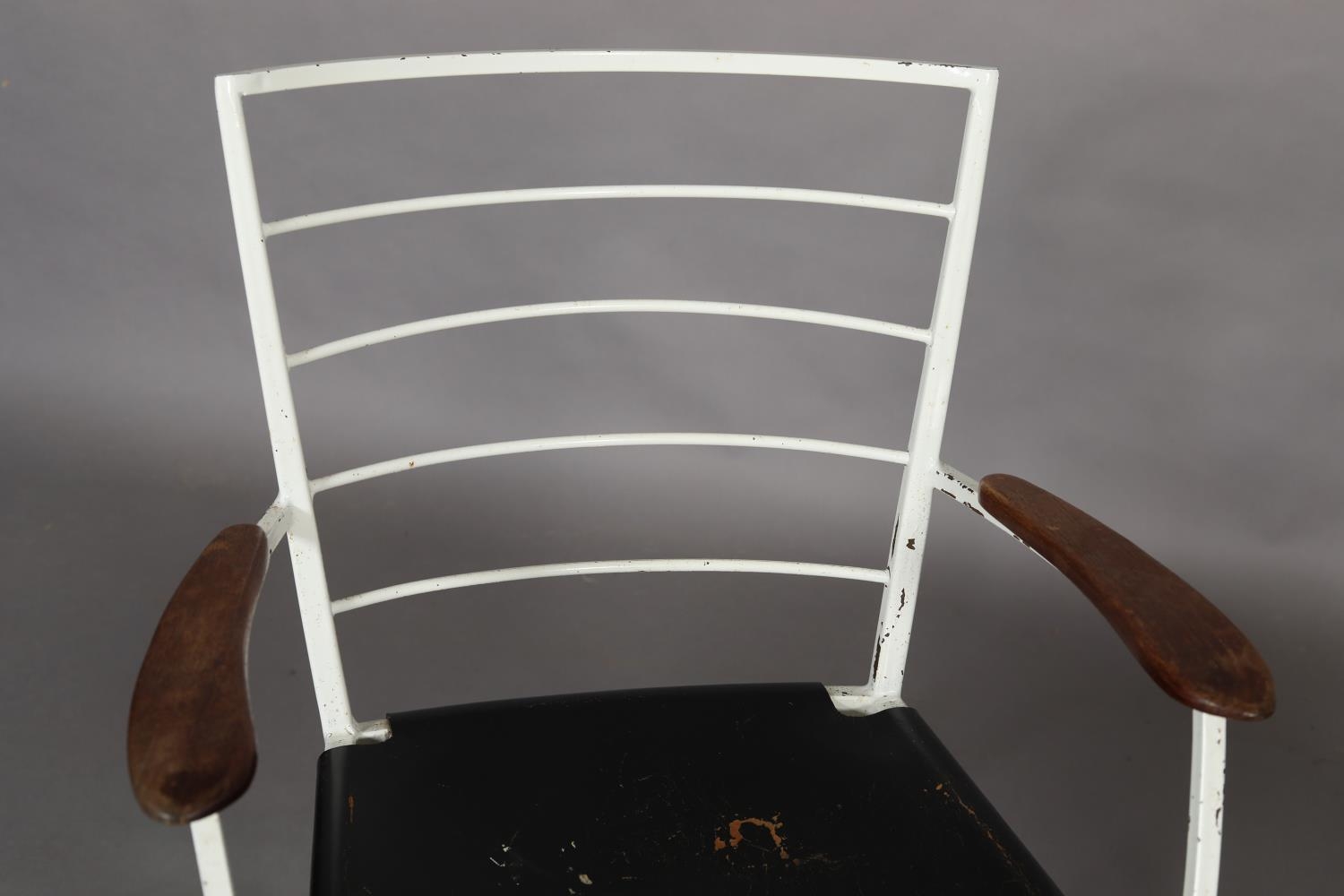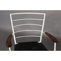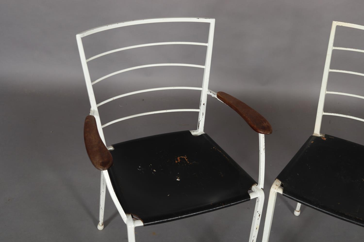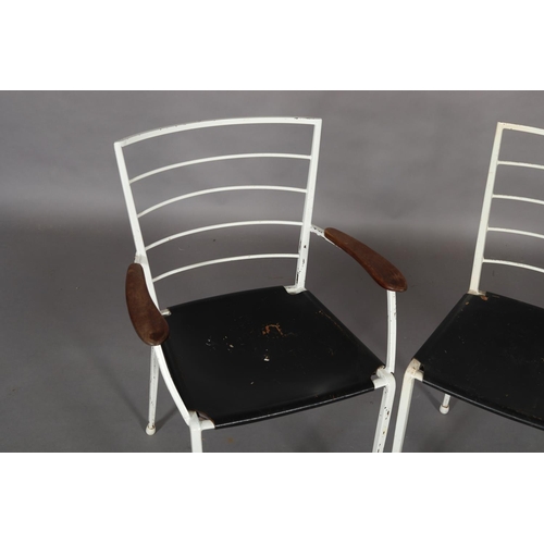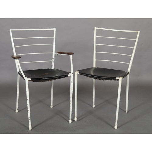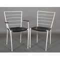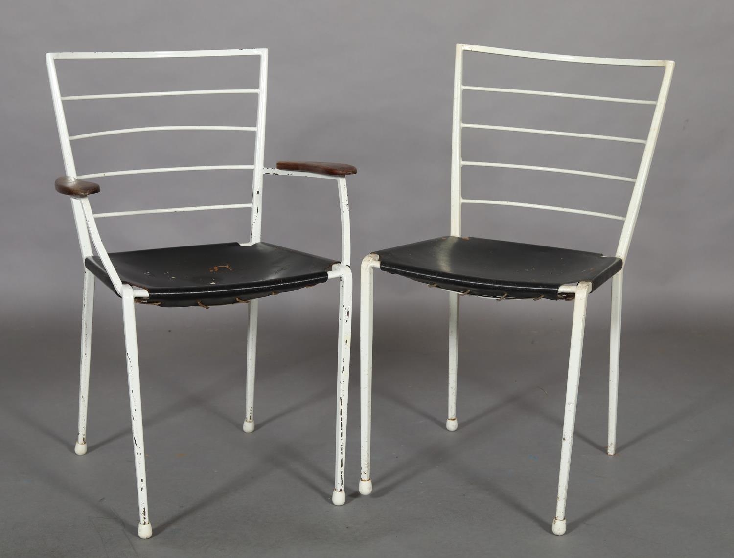 A pair of Ladderax white metal chairs with black leather slung seats, comprising carver with teak platform arms and a single chair